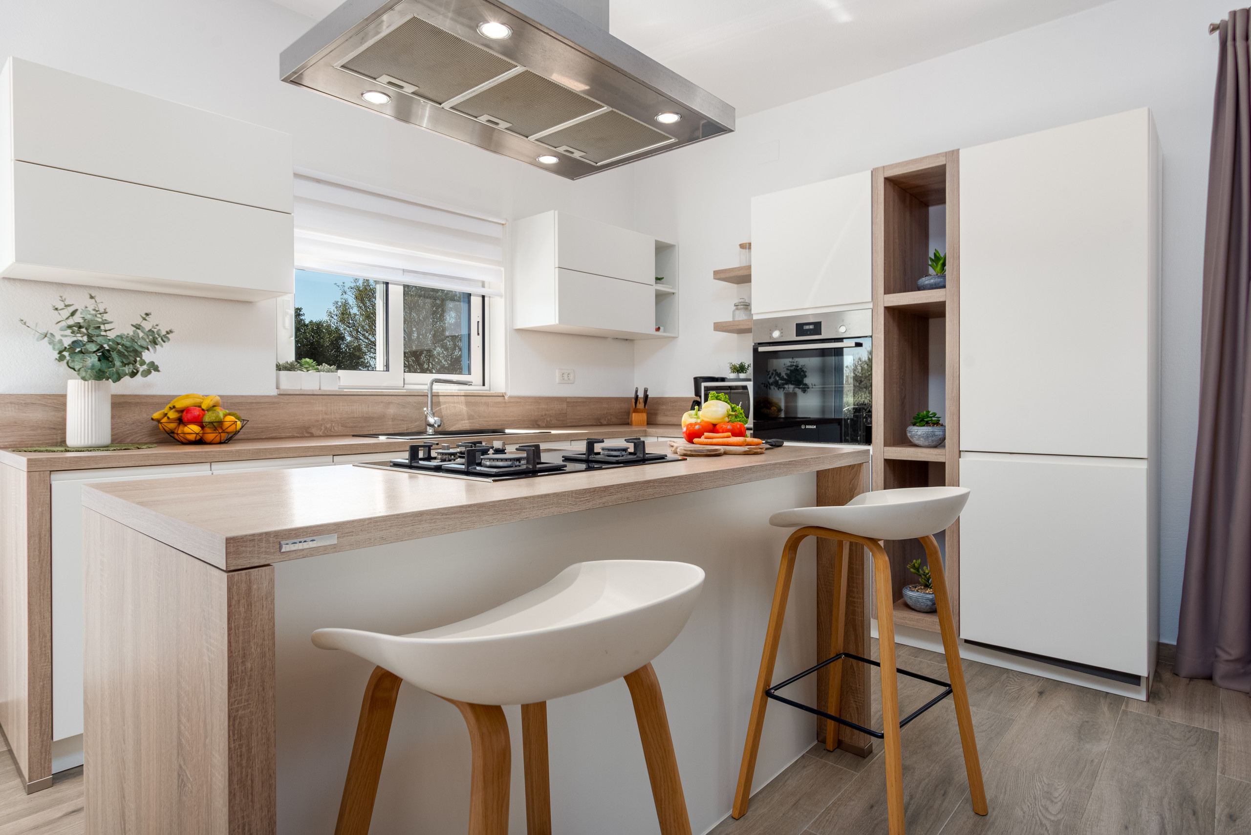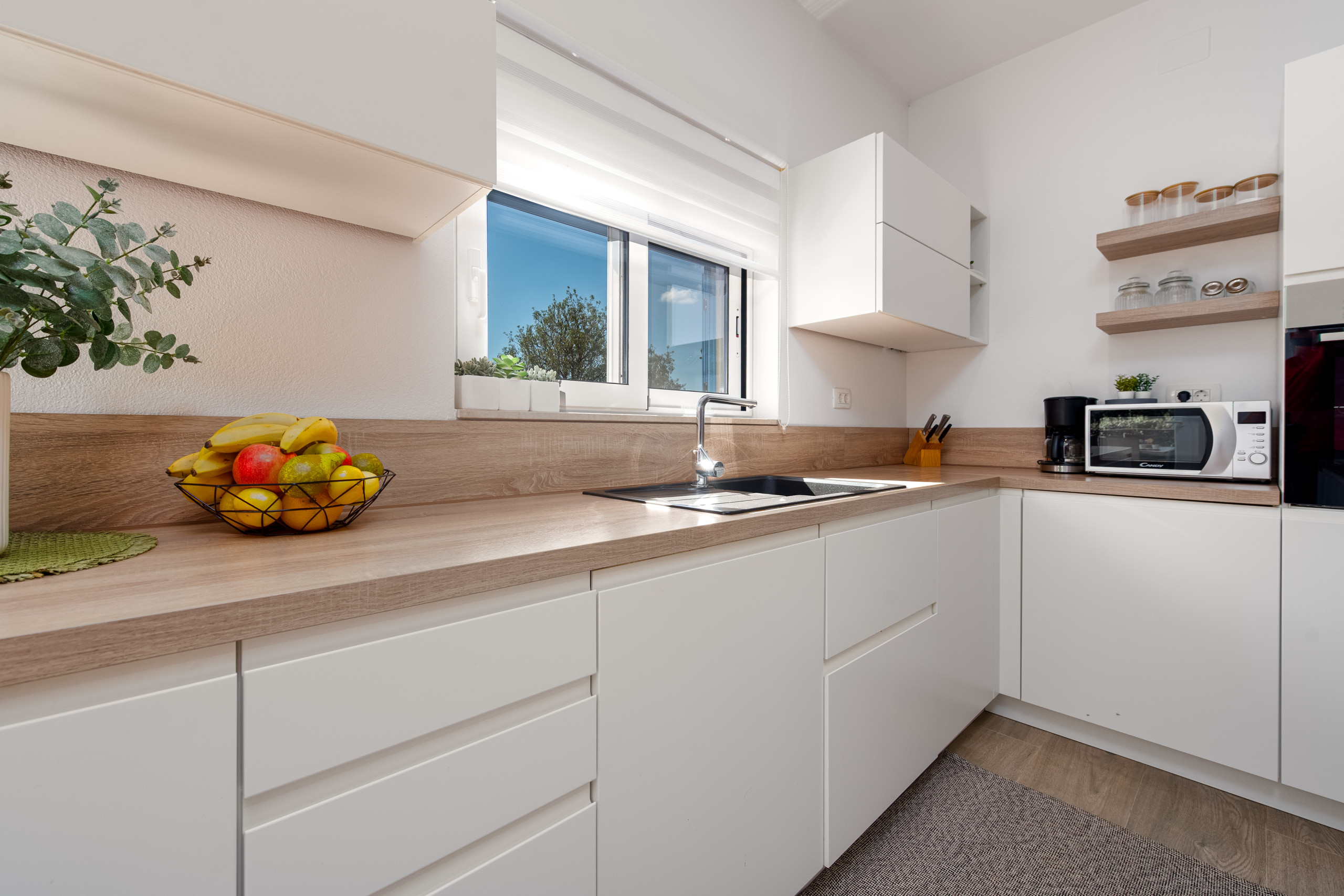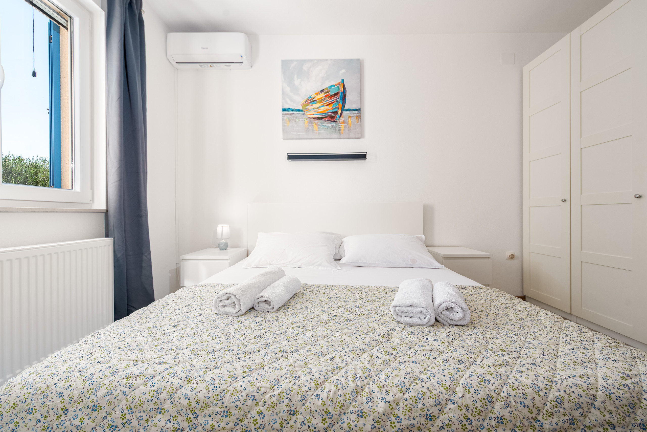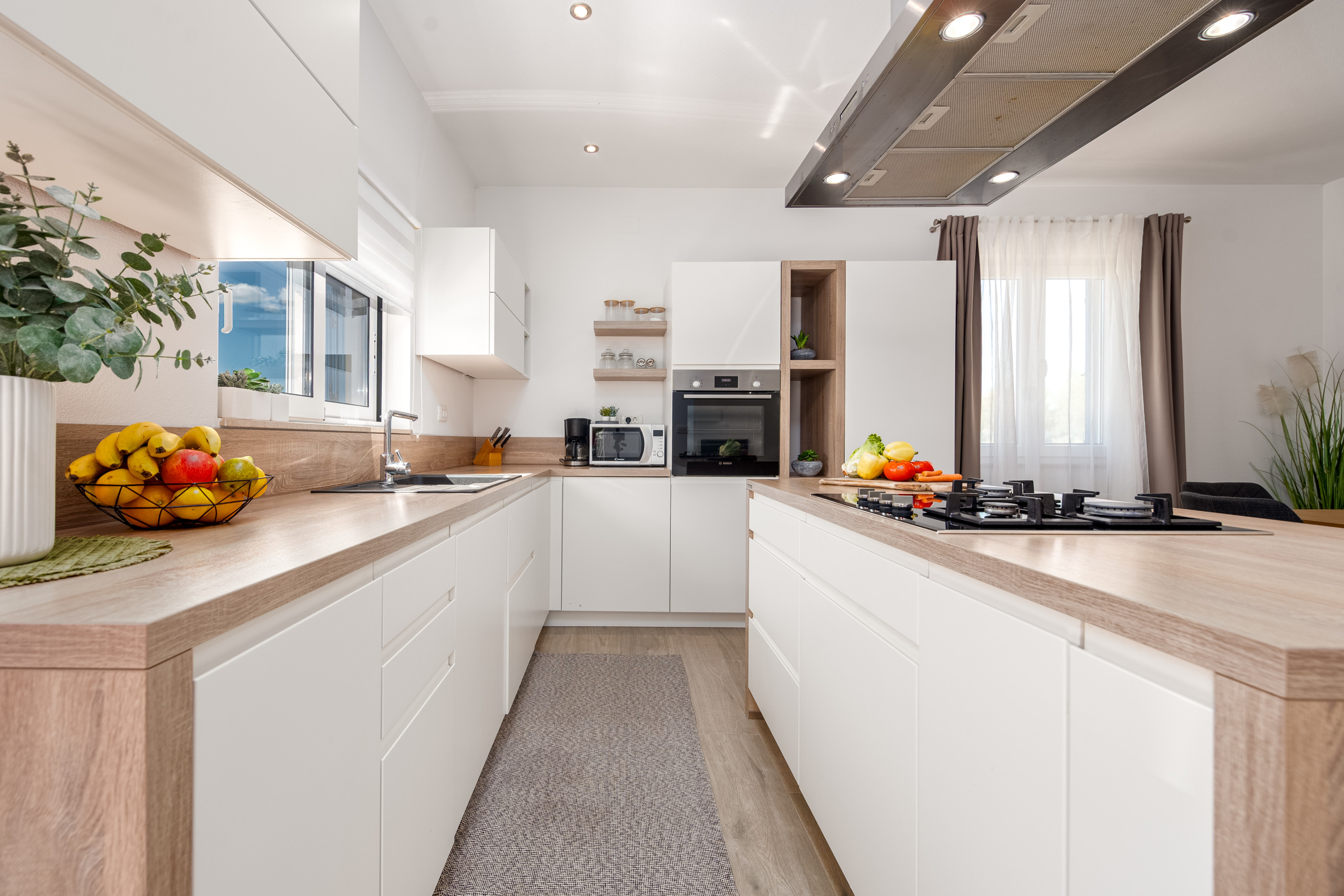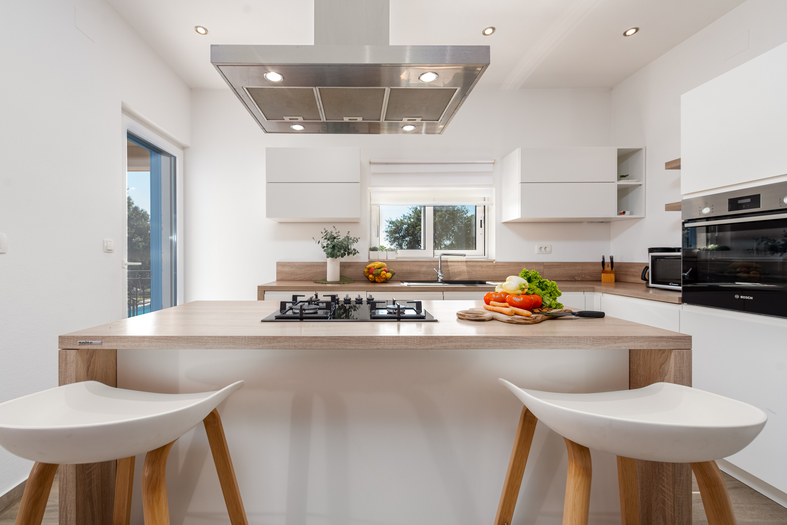 Der Innenbereich ist großzügig und durchdacht gestaltet und verfügt über vier komfortable Schlafzimmer und vier modern ausgestattete Badezimmer sowie eine zusätzliche Schlafmöglichkeit in Form eines Schlafsofas im Wohnzimmer. Ein Schlafzimmer befindet sich im Erdgeschoss, während sich drei weitere im Obergeschoss befinden, jeweils mit eigenem Bad, Fernseher und Klimaanlage. Den Gästen steht eine vollständig ausgestattete und moderne Küche zur Verfügung, ideal für die Zubereitung von Familienmahlzeiten, sowie ein gemütlicher Wohnbereich für gemeinsame Stunden. Für Familien mit Kindern sind ein Babybett und ein Hochstuhl vorhanden.