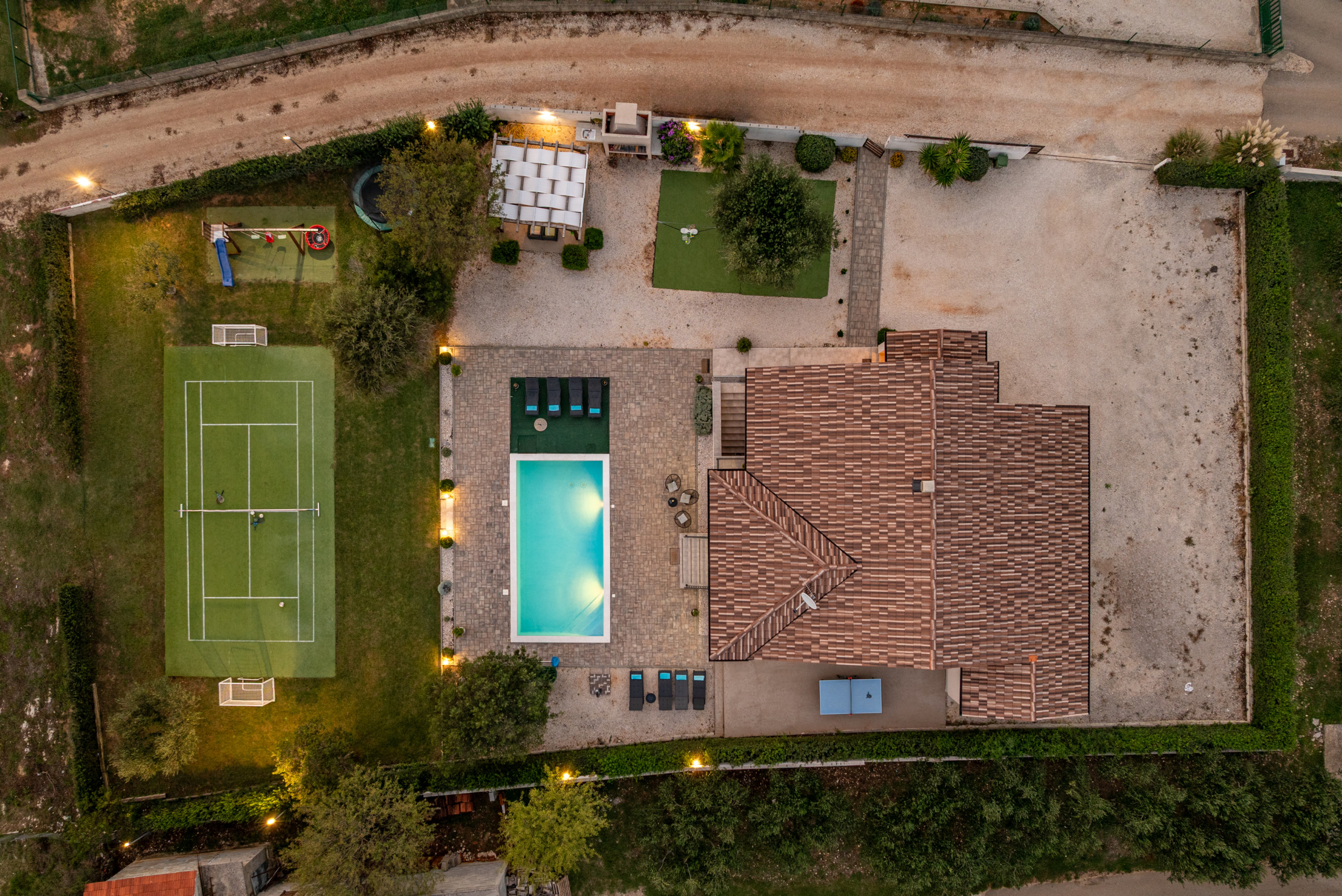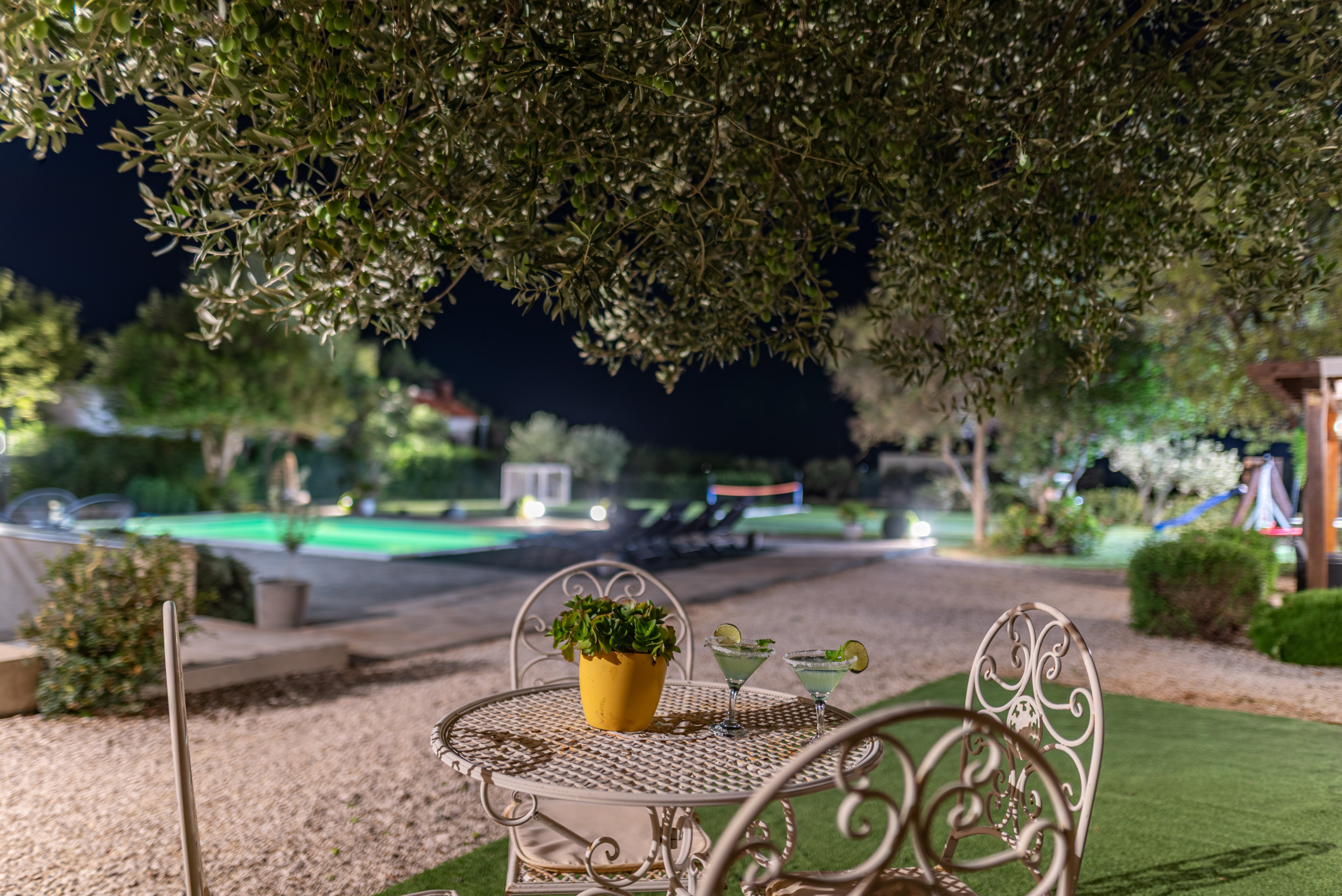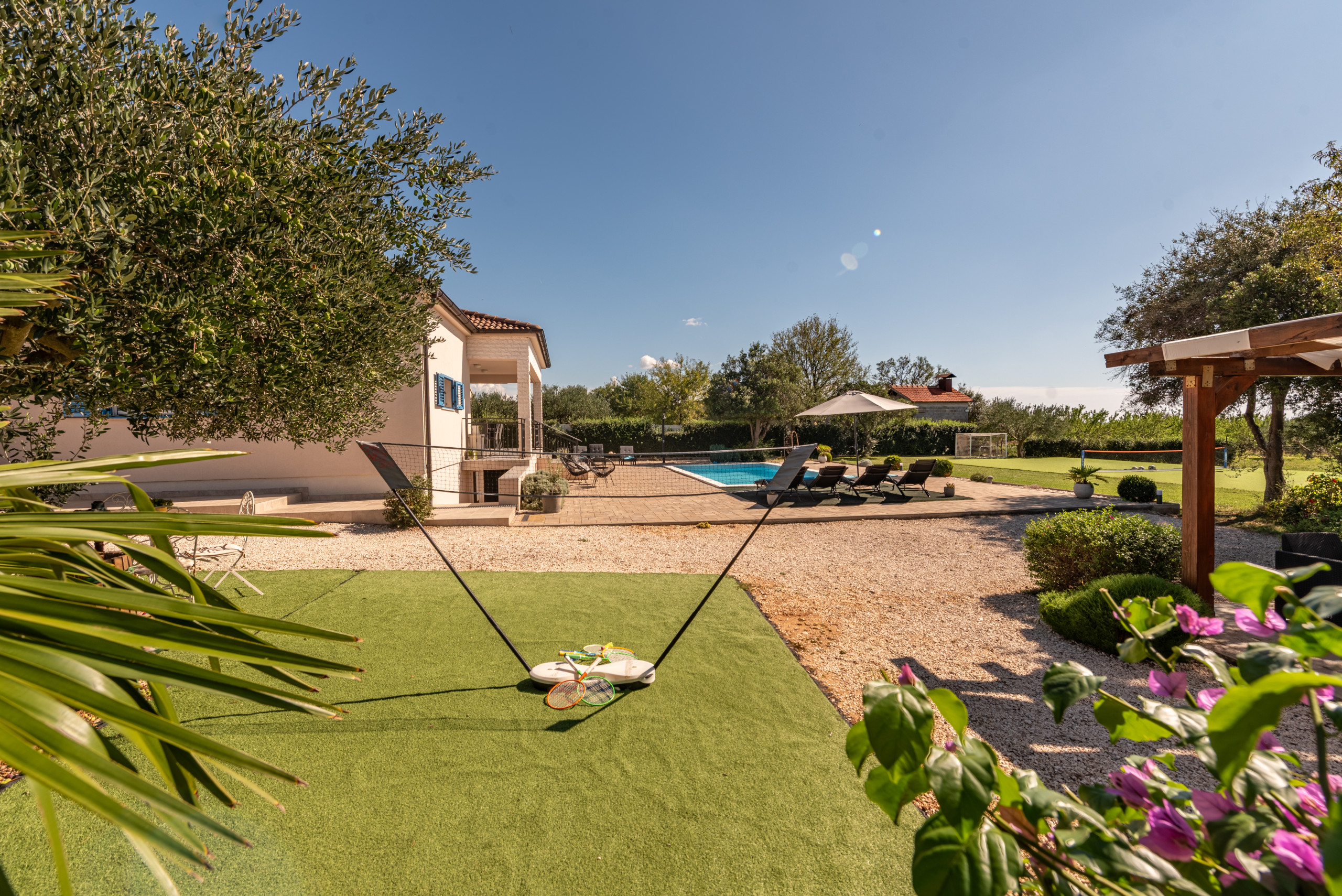 Der Außenbereich der Villa erstreckt sich über 1020 m2 und bietet zahlreiche Annehmlichkeiten für einen unbeschwerten Aufenthalt in völliger Ruhe und Privatsphäre. Im Mittelpunkt des Gartens befindet sich ein 32 m2 großer Swimmingpool mit Blick ins Grüne, umgeben von Sonnenliegen und Sonnenschirmen, außerdem stehen eine überdachte Terrasse, eine Außendusche und ein Kamin für die Zubereitung von Speisen im Freien zur Verfügung. Ein besonderes Highlight ist die Dachterrasse mit Jacuzzi, ideal zum Entspannen in ruhiger Atmosphäre, während Kinder sich auf dem Spielplatz mit Trampolin, Tischtennis, Schaukeln und weiteren Einrichtungen vergnügen können.
