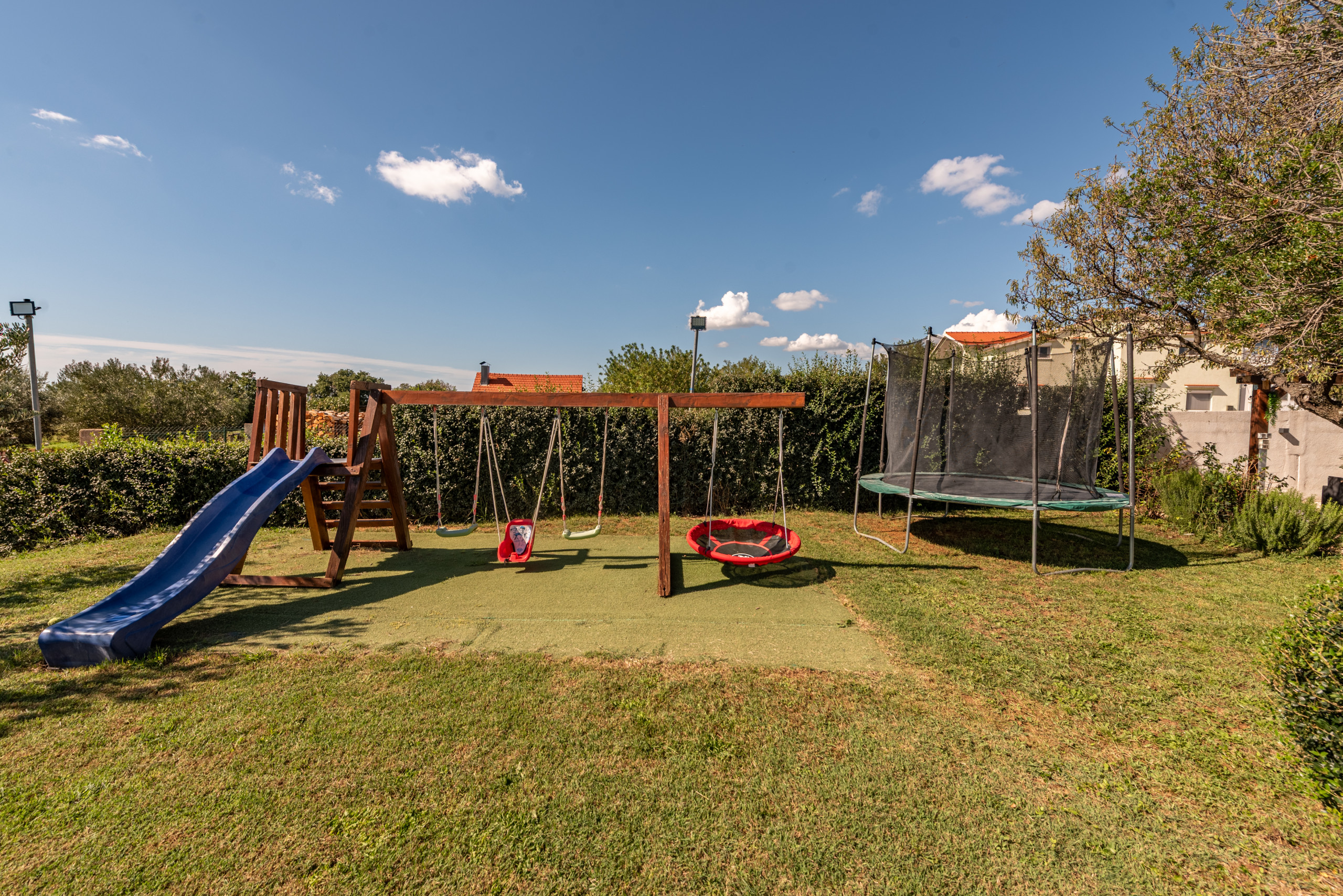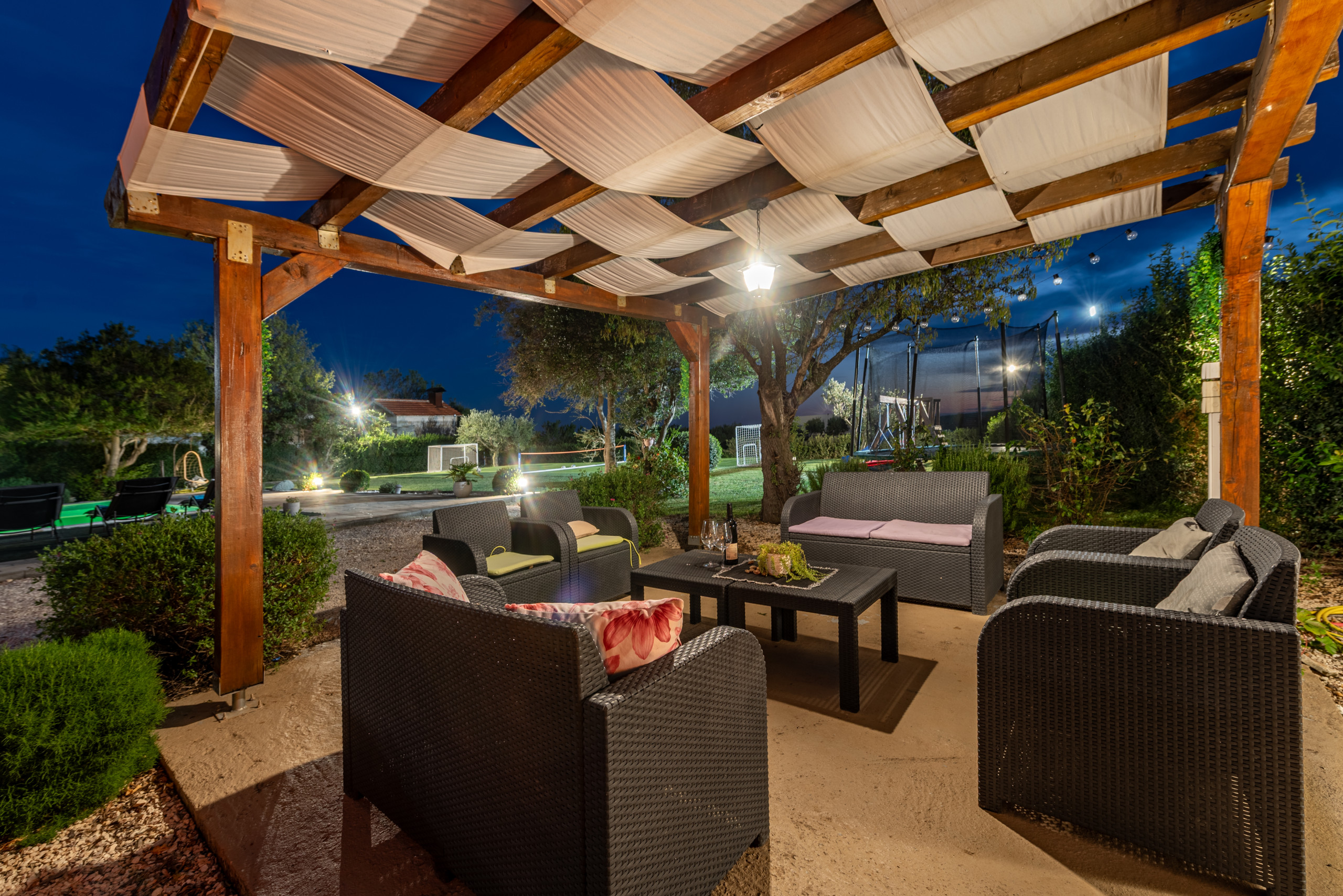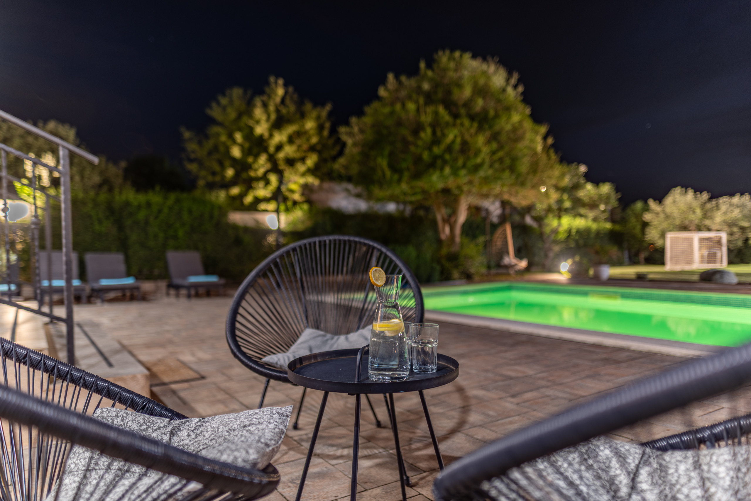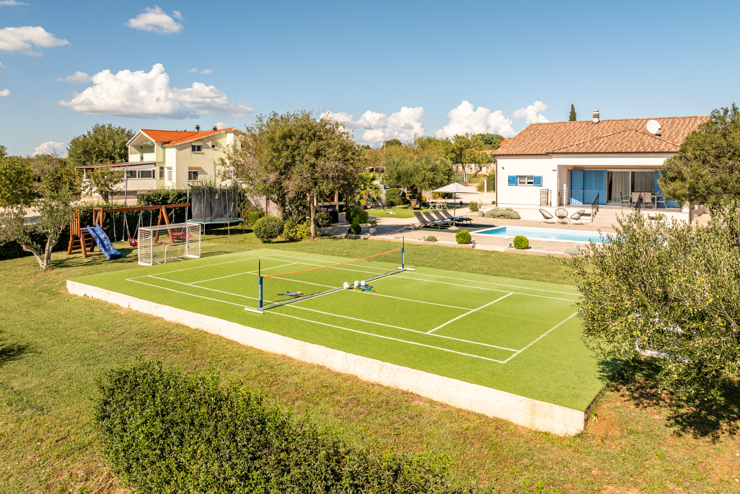 Der Außenbereich der Villa erstreckt sich über 1020 m2 und bietet zahlreiche Annehmlichkeiten für einen unbeschwerten Aufenthalt in völliger Ruhe und Privatsphäre. Im Mittelpunkt des Gartens befindet sich ein 32 m2 großer Swimmingpool mit Blick ins Grüne, umgeben von Sonnenliegen und Sonnenschirmen, außerdem stehen eine überdachte Terrasse, eine Außendusche und ein Kamin für die Zubereitung von Speisen im Freien zur Verfügung. Ein besonderes Highlight ist die Dachterrasse mit Jacuzzi, ideal zum Entspannen in ruhiger Atmosphäre, während Kinder sich auf dem Spielplatz mit Trampolin, Tischtennis, Schaukeln und weiteren Einrichtungen vergnügen können.
