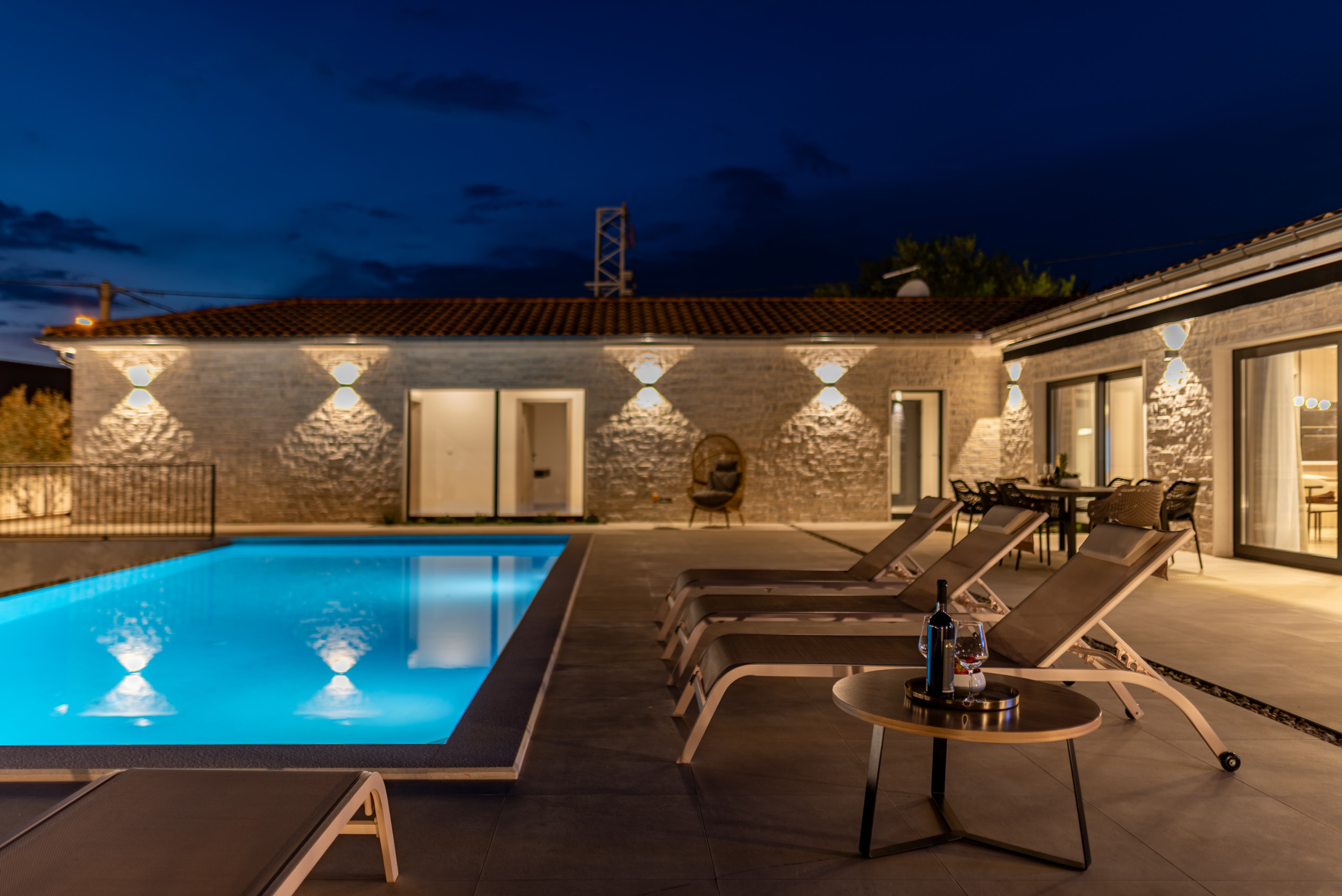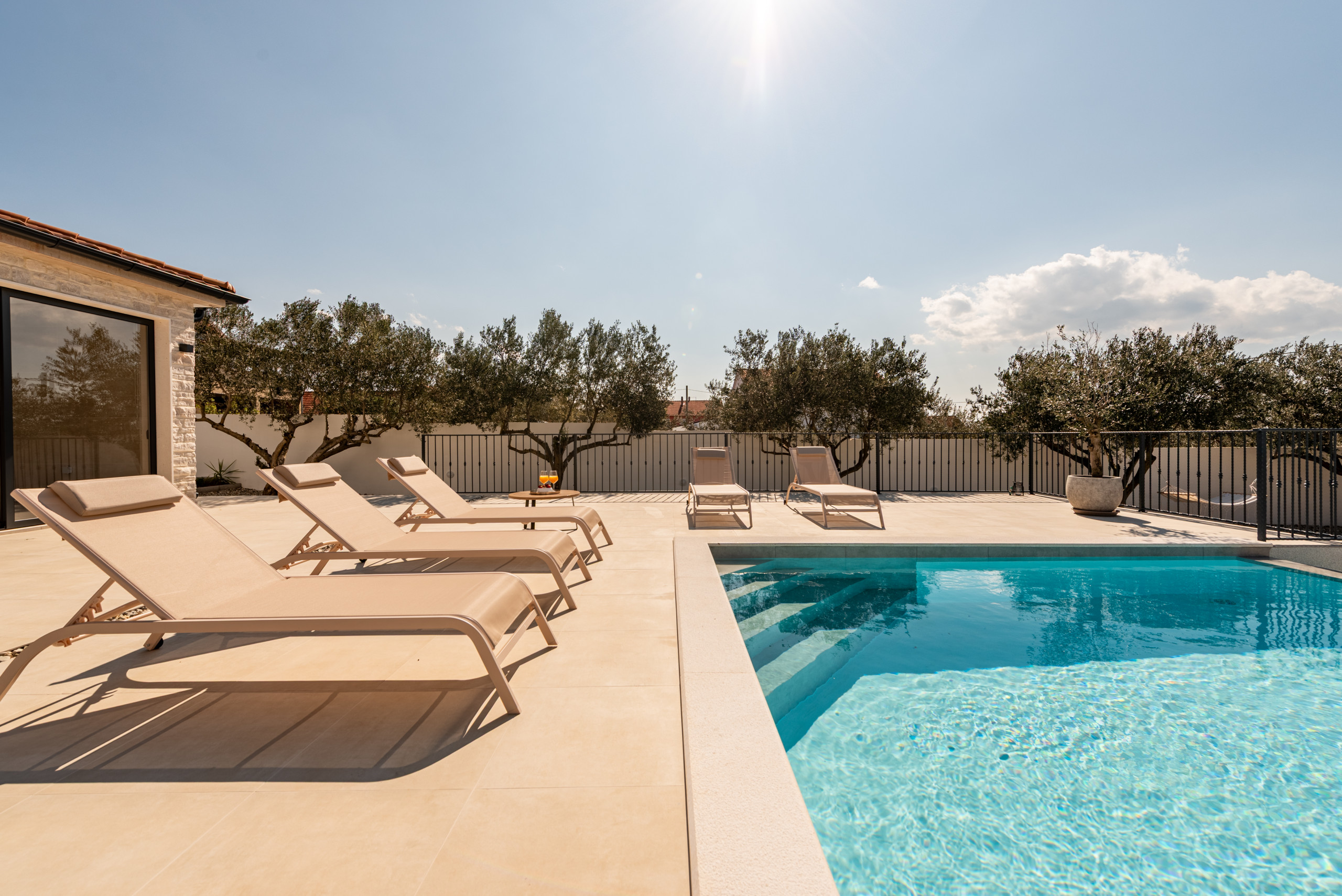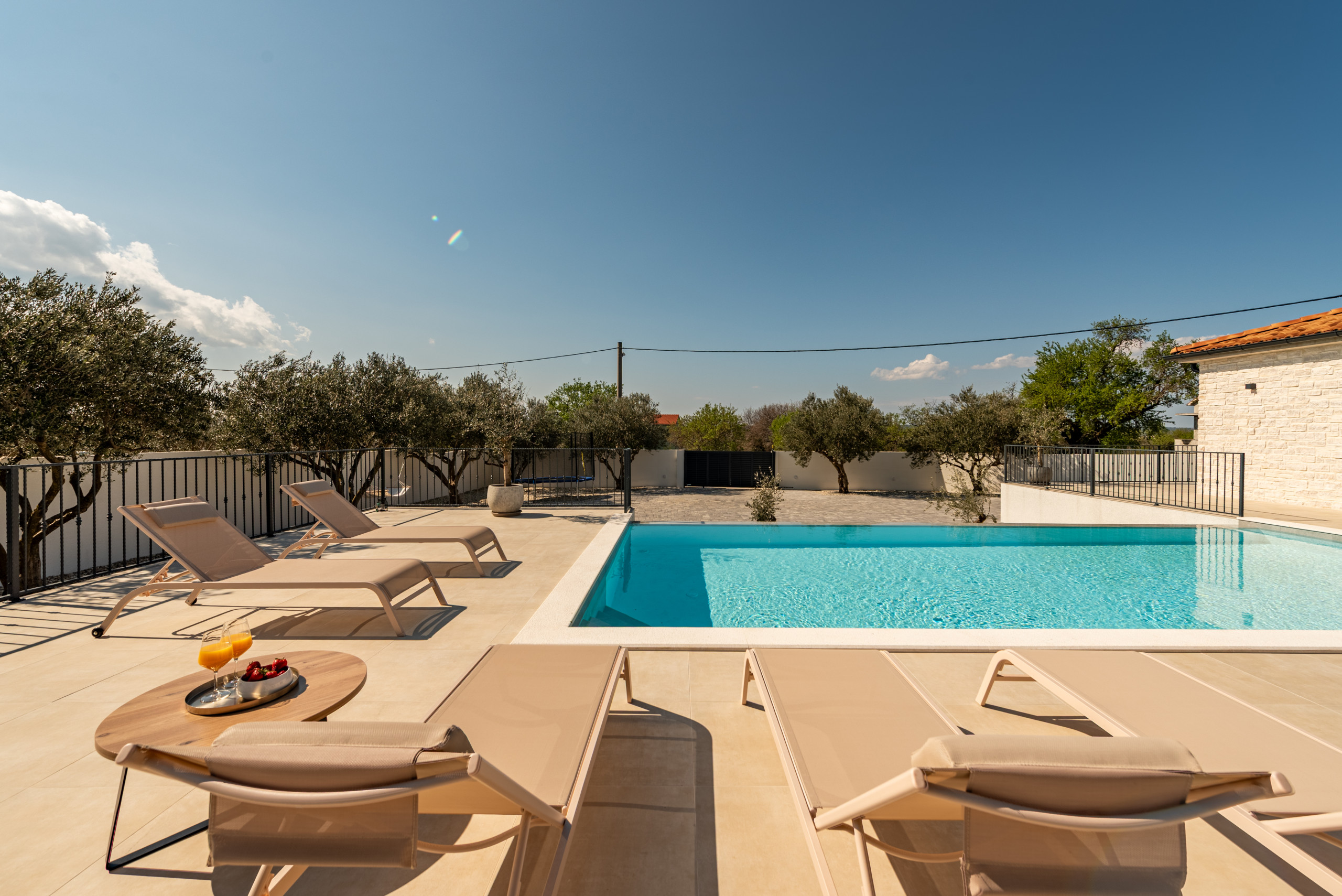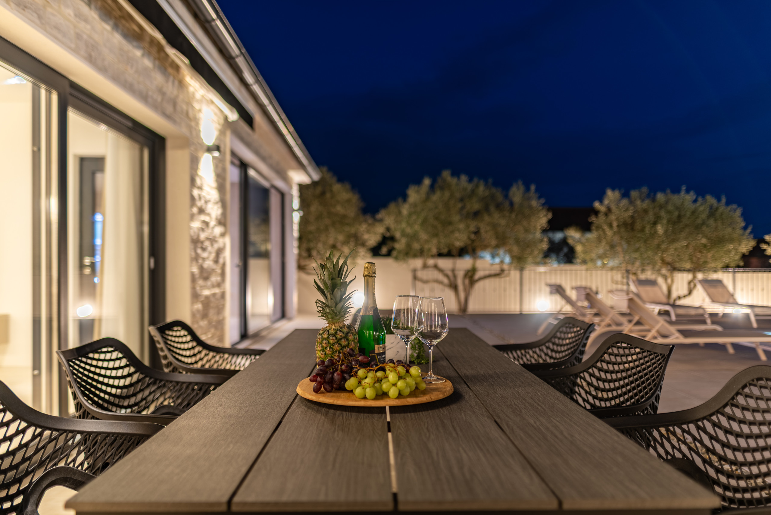 Im Außenbereich erwarten Sie ein Infinity-Pool mit Sonnenliegen und Außendusche sowie eine großzügige Terrasse mit einem Esstisch für Mahlzeiten im Freien. Ein Grill steht ebenfalls zur Verfügung und lädt zu entspannten Abendessen unter freiem Himmel ein, während der mit Olivenbäumen gesäumte Garten für eine angenehme mediterrane Atmosphäre sorgt.