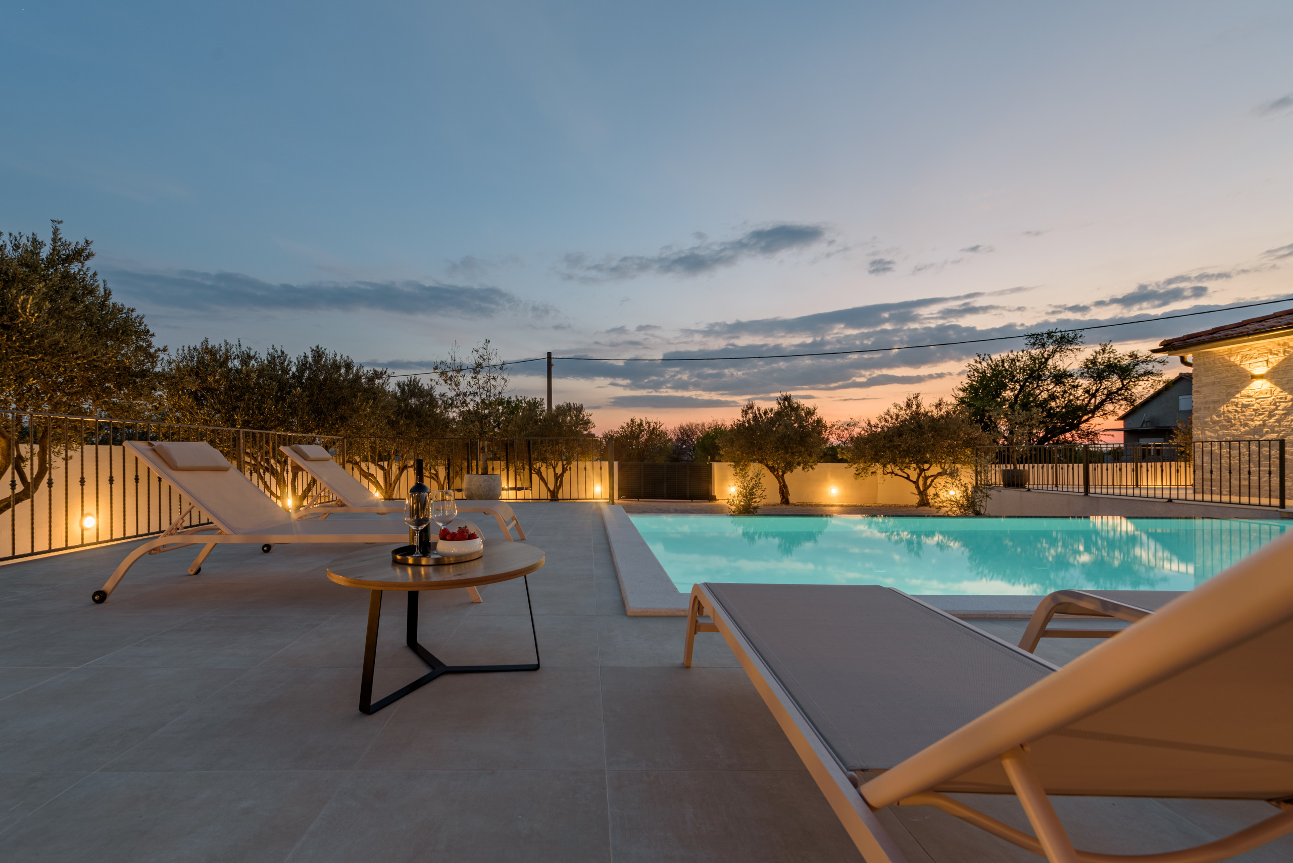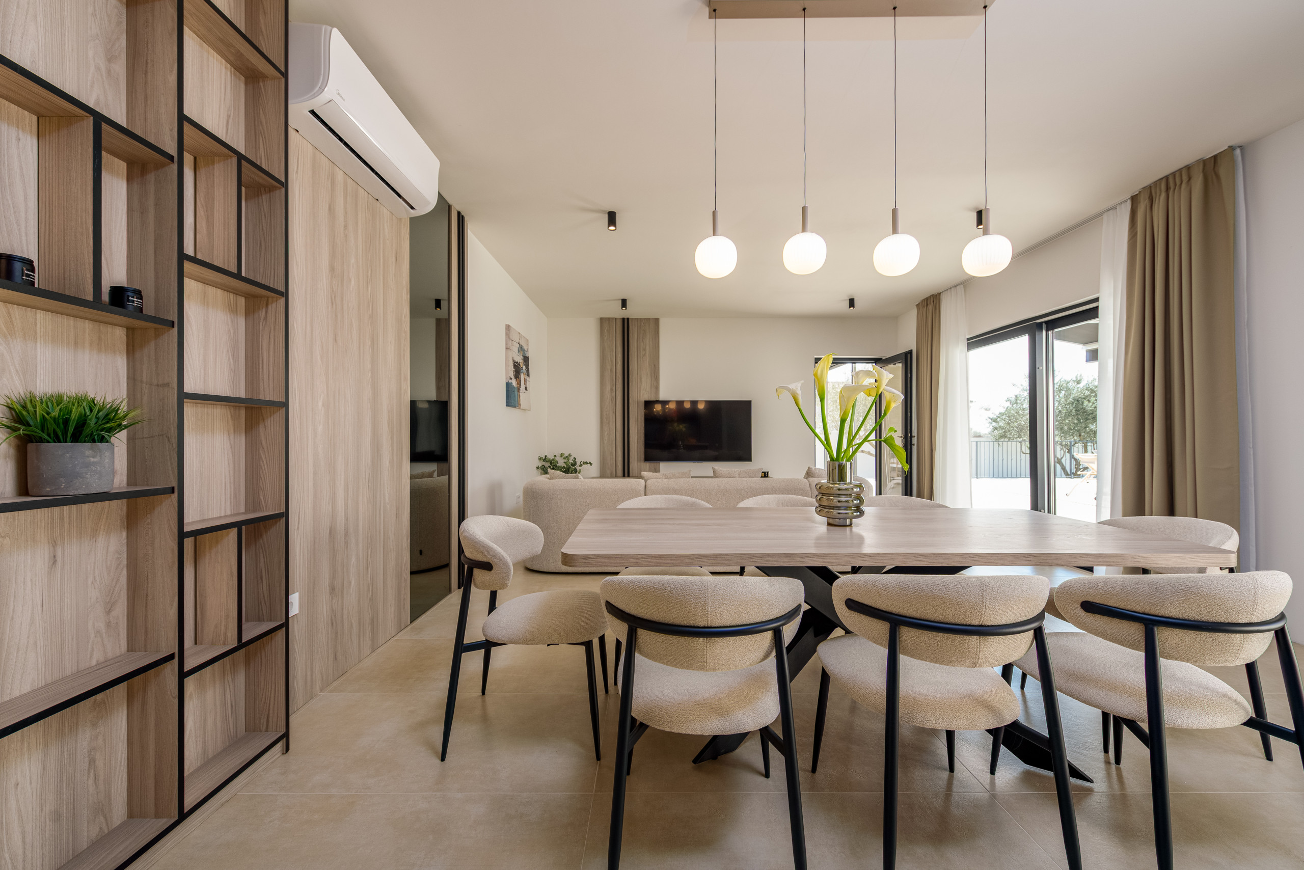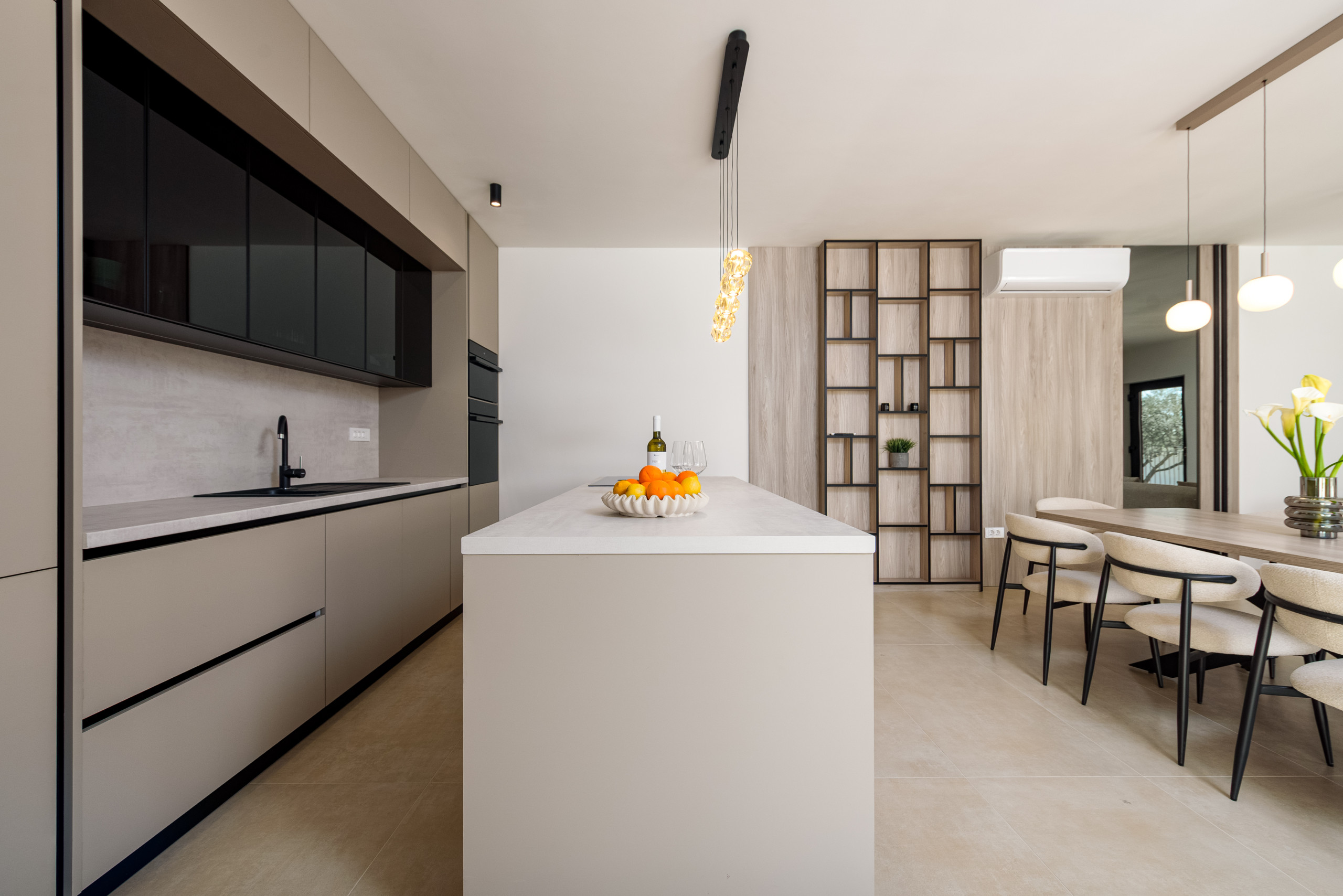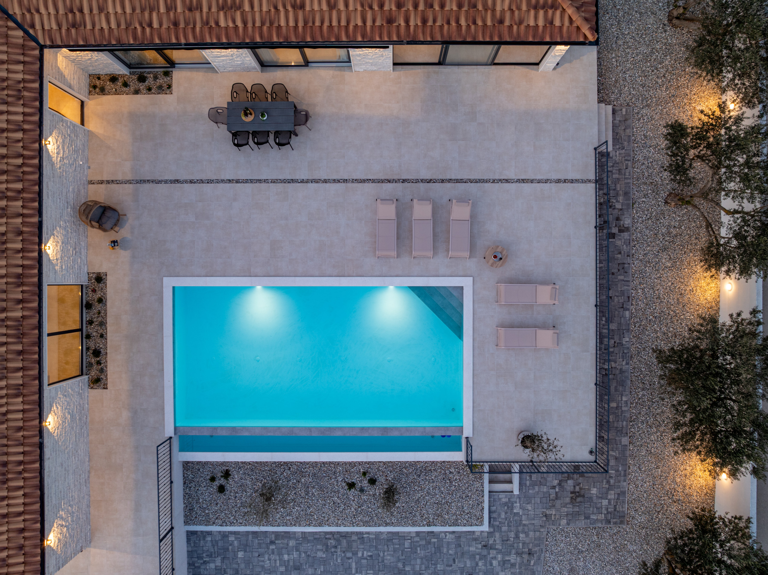 Im Außenbereich erwarten Sie ein Infinity-Pool mit Sonnenliegen und Außendusche sowie eine großzügige Terrasse mit einem Esstisch für Mahlzeiten im Freien. Ein Grill steht ebenfalls zur Verfügung und lädt zu entspannten Abendessen unter freiem Himmel ein, während der mit Olivenbäumen gesäumte Garten für eine angenehme mediterrane Atmosphäre sorgt.