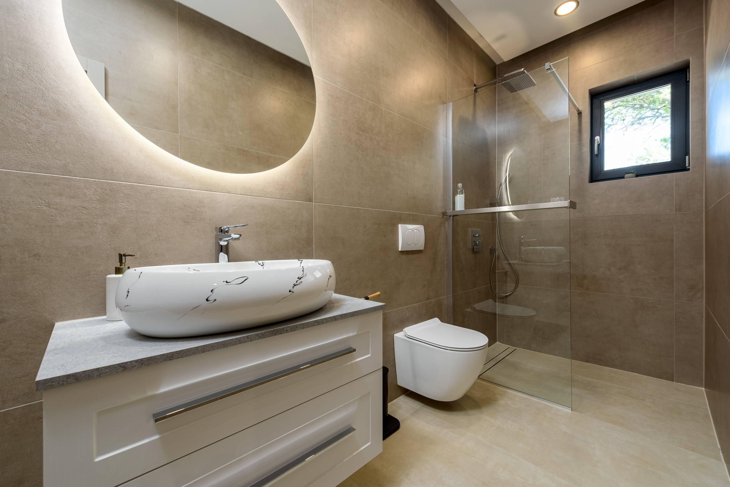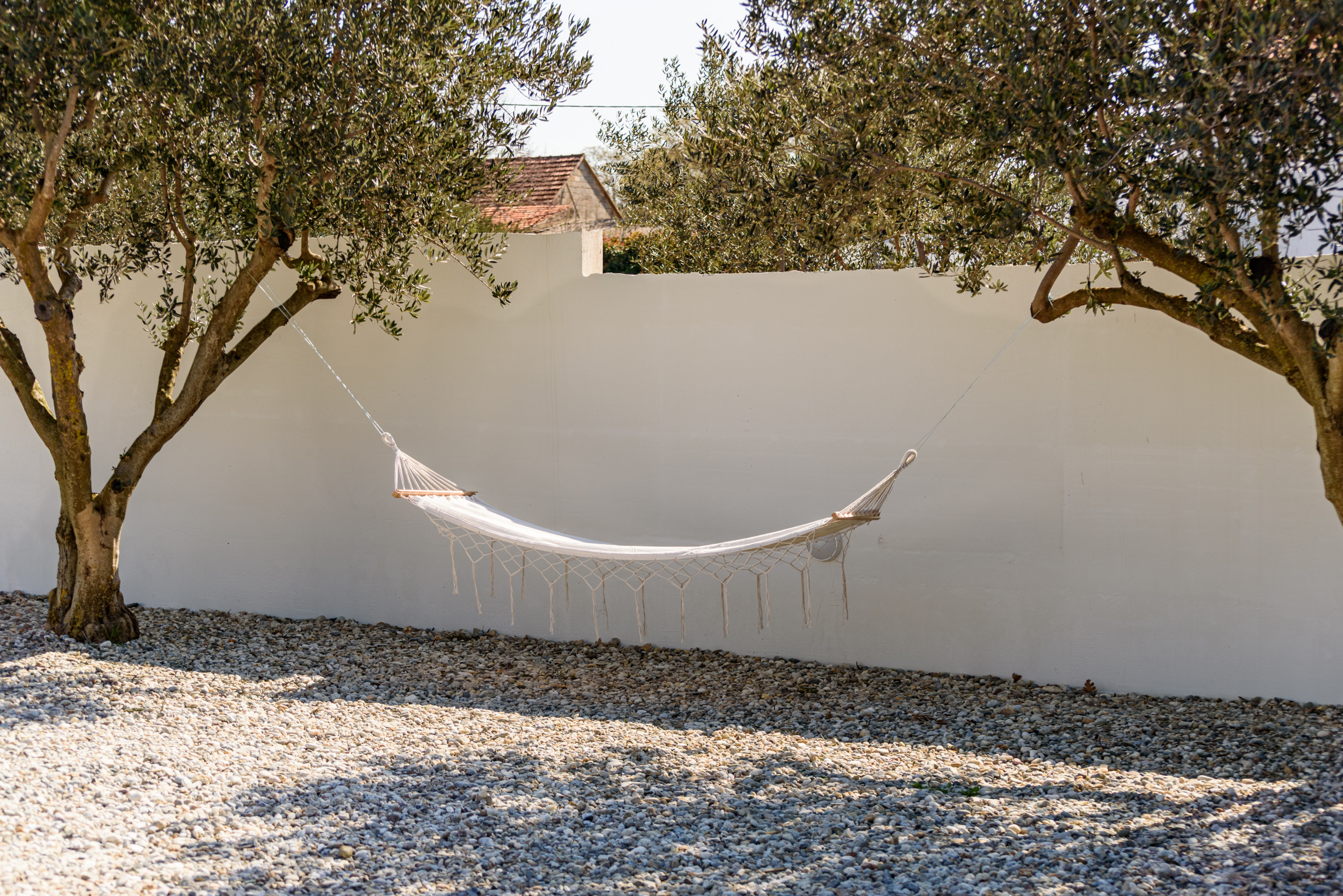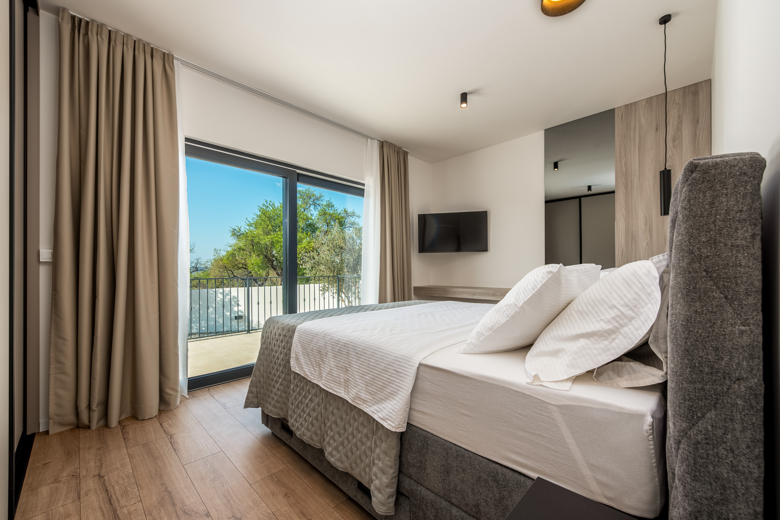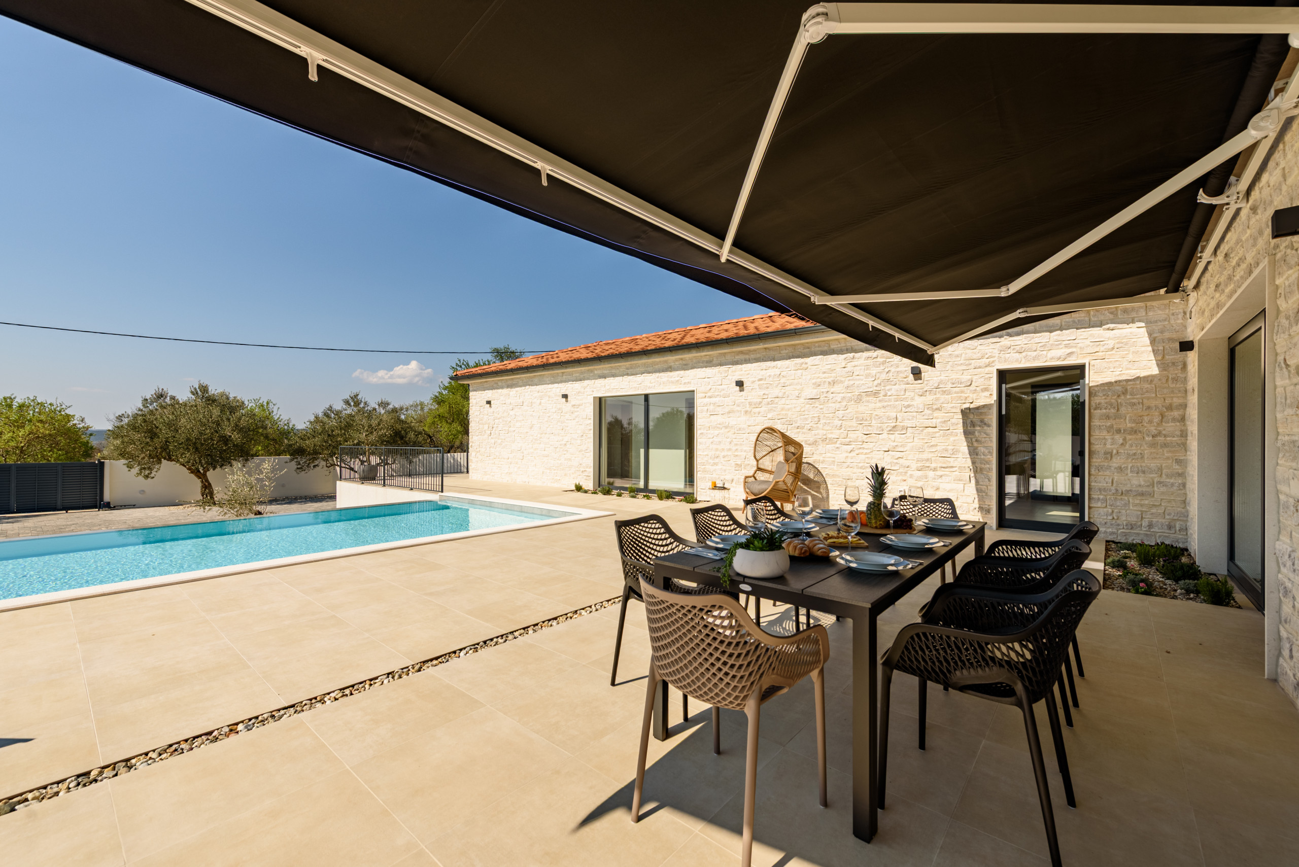 Im Außenbereich erwarten Sie ein Infinity-Pool mit Sonnenliegen und Außendusche sowie eine großzügige Terrasse mit einem Esstisch für Mahlzeiten im Freien. Ein Grill steht ebenfalls zur Verfügung und lädt zu entspannten Abendessen unter freiem Himmel ein, während der mit Olivenbäumen gesäumte Garten für eine angenehme mediterrane Atmosphäre sorgt.