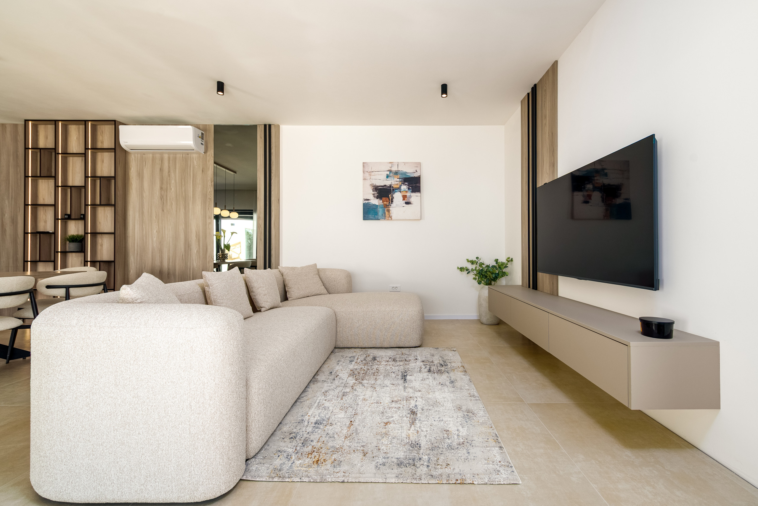 Die Villa verfügt über drei Schlafzimmer mit Doppelbetten, jeweils mit eigenem Badezimmer für maximalen Komfort, sowie ein zusätzliches Gäste-WC. Die voll ausgestattete Küche beinhaltet eine Kapselkaffeemaschine, und der Wohn- und Essbereich mit Satelliten-TV bietet einen funktionalen und gemütlichen Raum zum Entspannen.