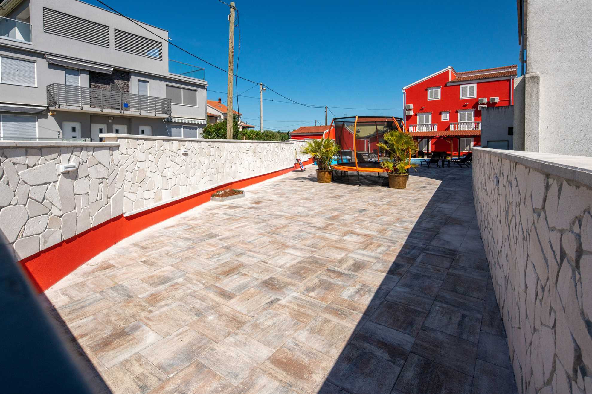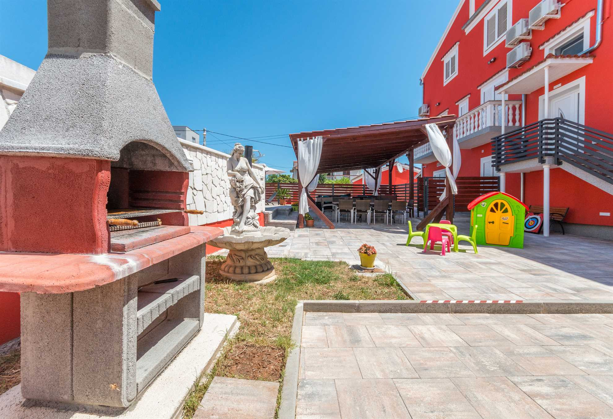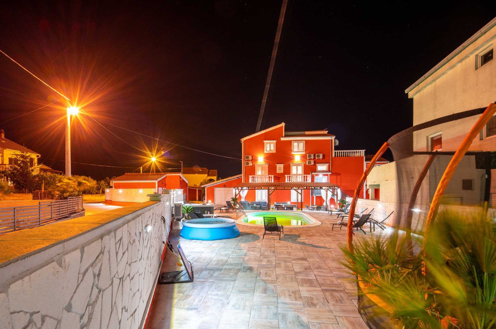 Dieses schöne und geräumige Doppelhaus befindet sich in ruhiger Lage im charmanten Küstenort Turanj, nur 200 Meter von einem Kiesstrand entfernt. Das geschmackvoll eingerichtete Interieur erstreckt sich über das erste und zweite Obergeschoss, die durch eine Innentreppe verbunden sind. Den Gästen stehen fünf klimatisierte Schlafzimmer, drei Badezimmer, ein zusätzliches WC sowie jeweils eine voll ausgestattete Küche und ein Wohnzimmer auf jeder Etage zur Verfügung – ideal für größere Familien oder Freundesgruppen, die Komfort und Privatsphäre schätzen.