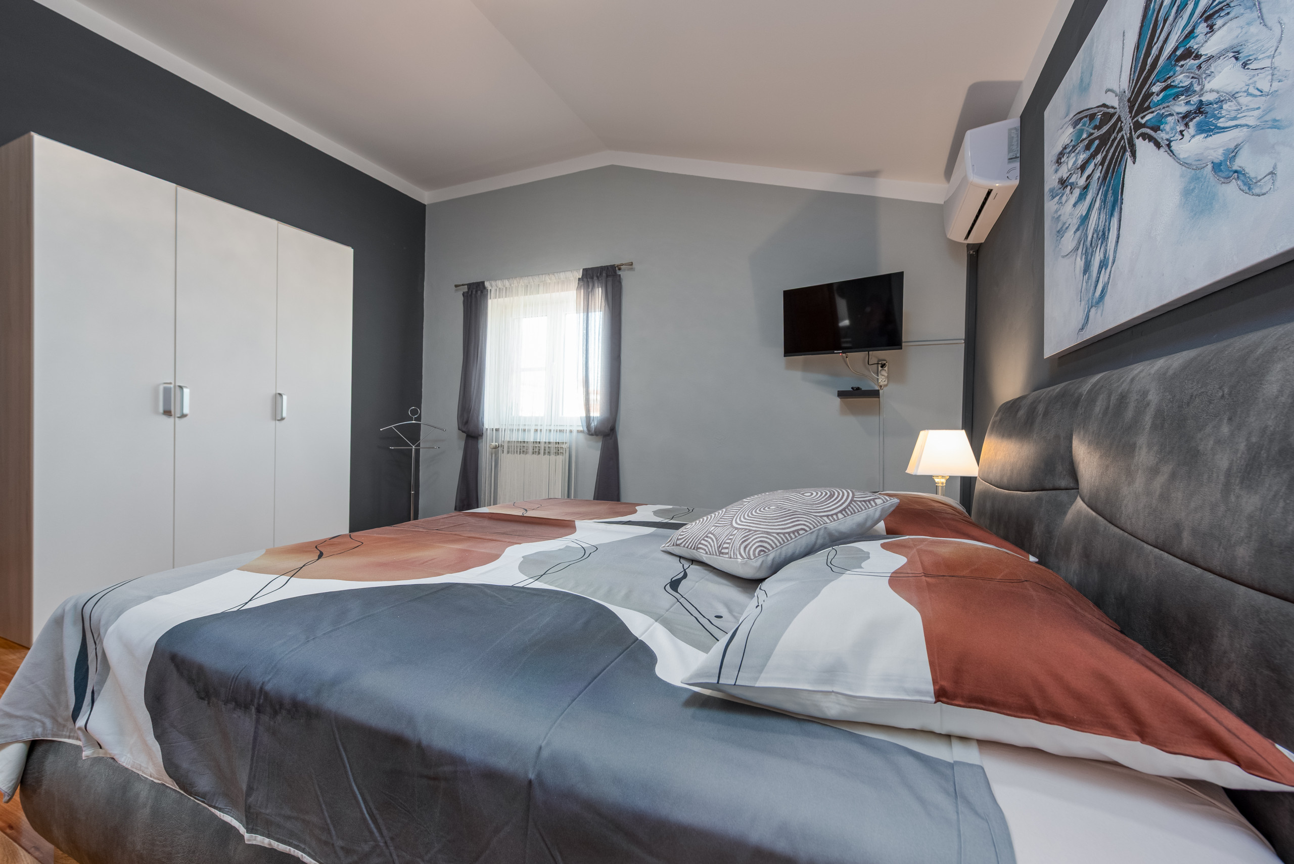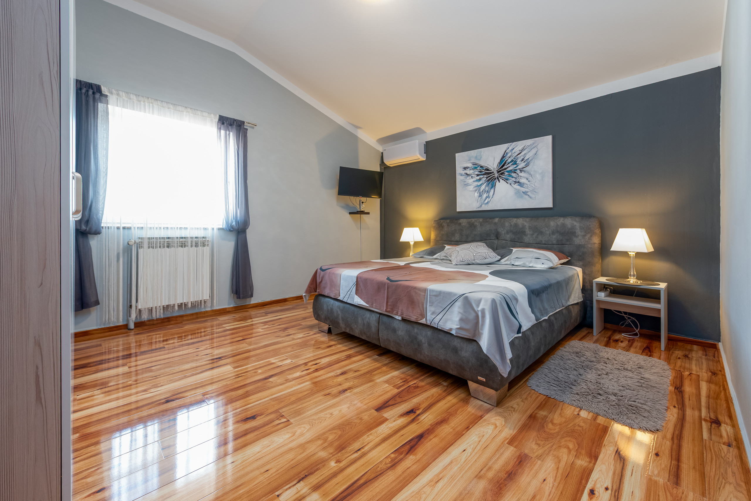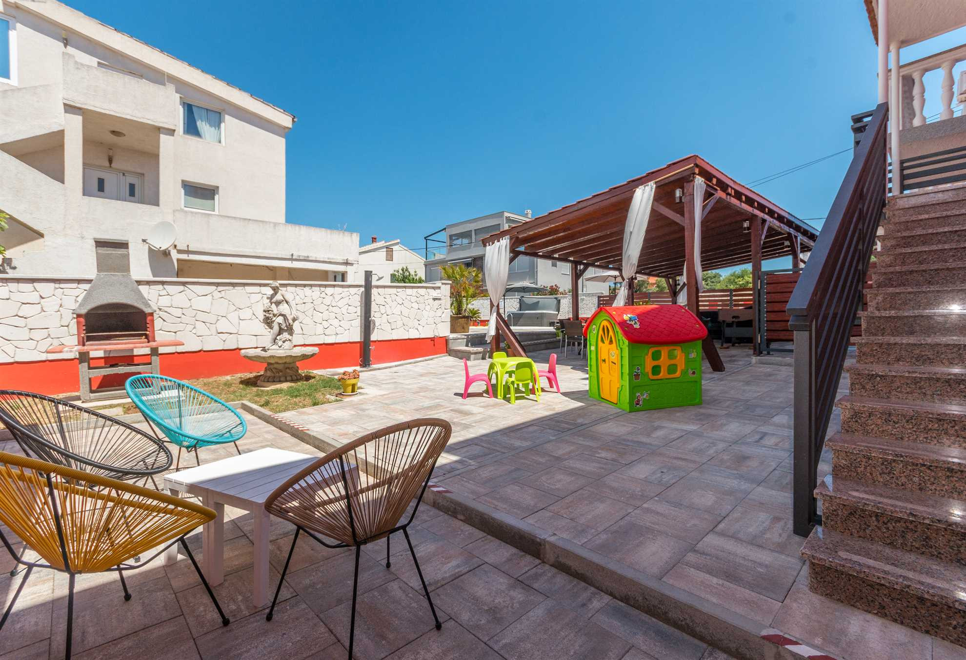 Dieses schöne und geräumige Doppelhaus befindet sich in ruhiger Lage im charmanten Küstenort Turanj, nur 200 Meter von einem Kiesstrand entfernt. Das geschmackvoll eingerichtete Interieur erstreckt sich über das erste und zweite Obergeschoss, die durch eine Innentreppe verbunden sind. Den Gästen stehen fünf klimatisierte Schlafzimmer, drei Badezimmer, ein zusätzliches WC sowie jeweils eine voll ausgestattete Küche und ein Wohnzimmer auf jeder Etage zur Verfügung – ideal für größere Familien oder Freundesgruppen, die Komfort und Privatsphäre schätzen.