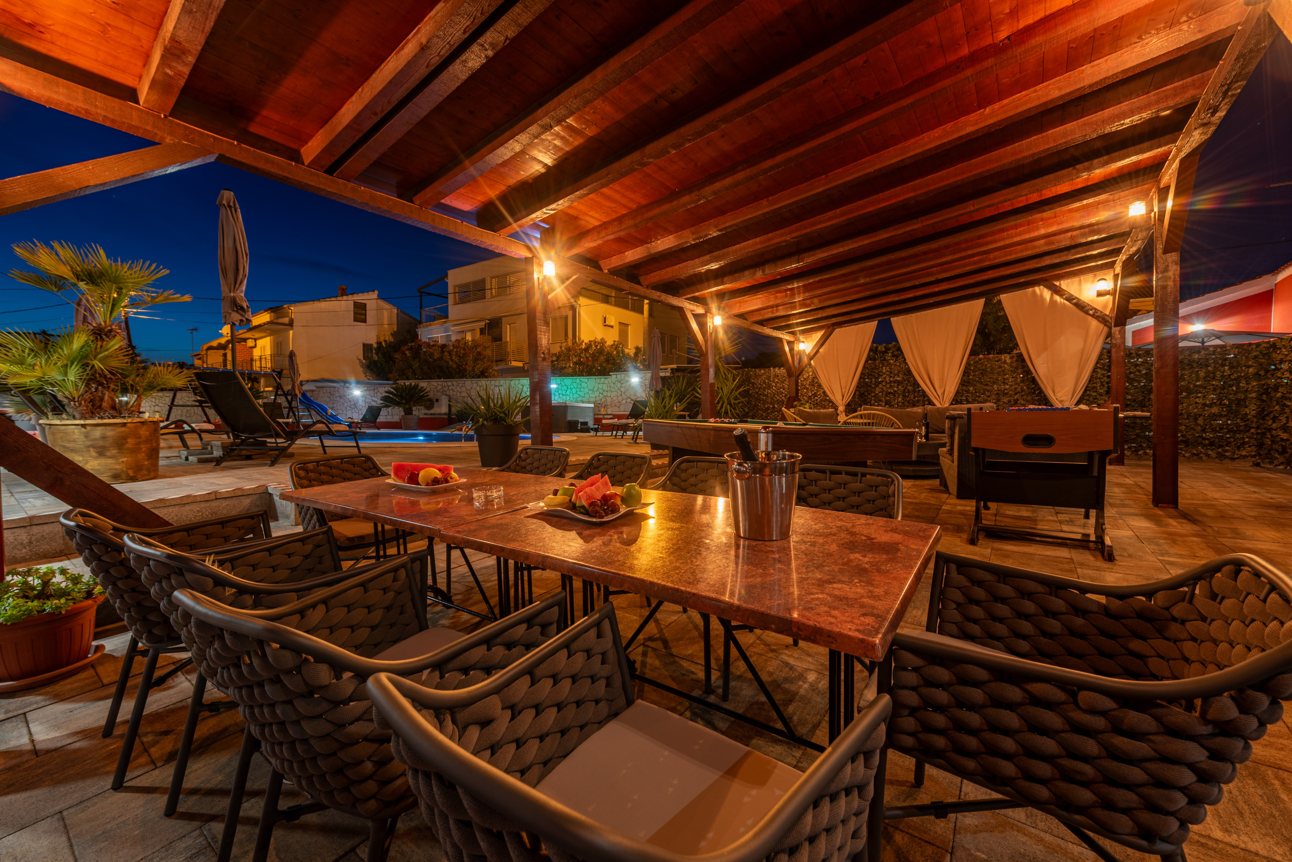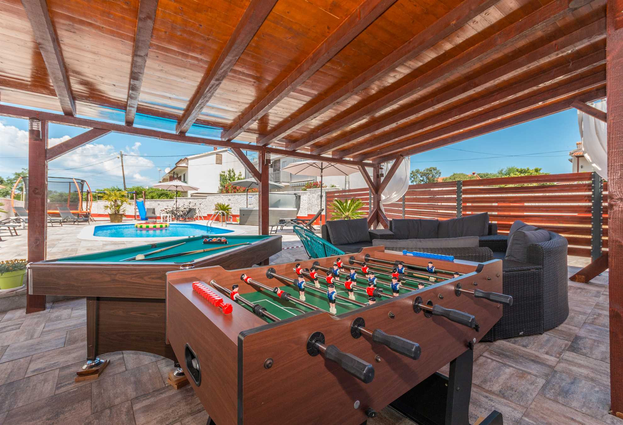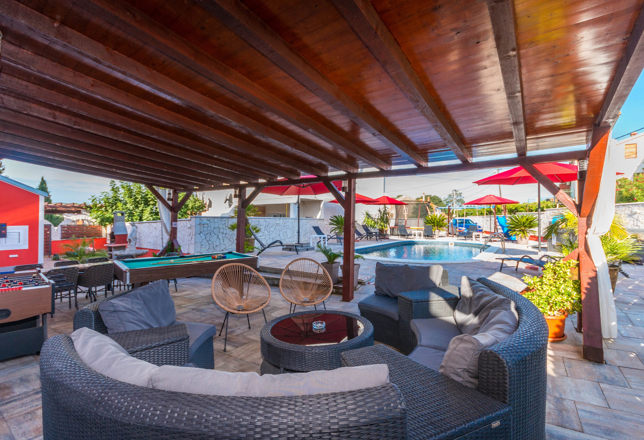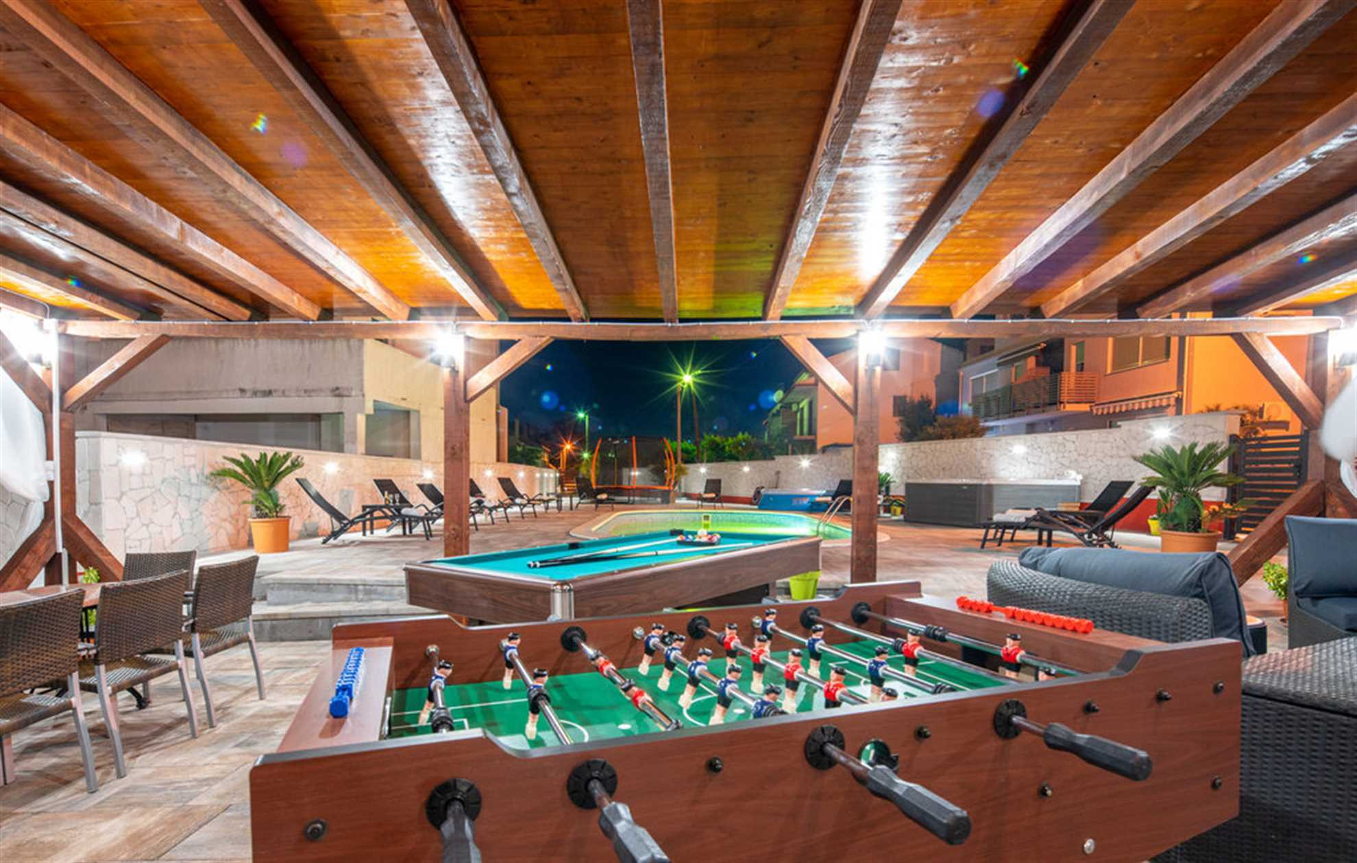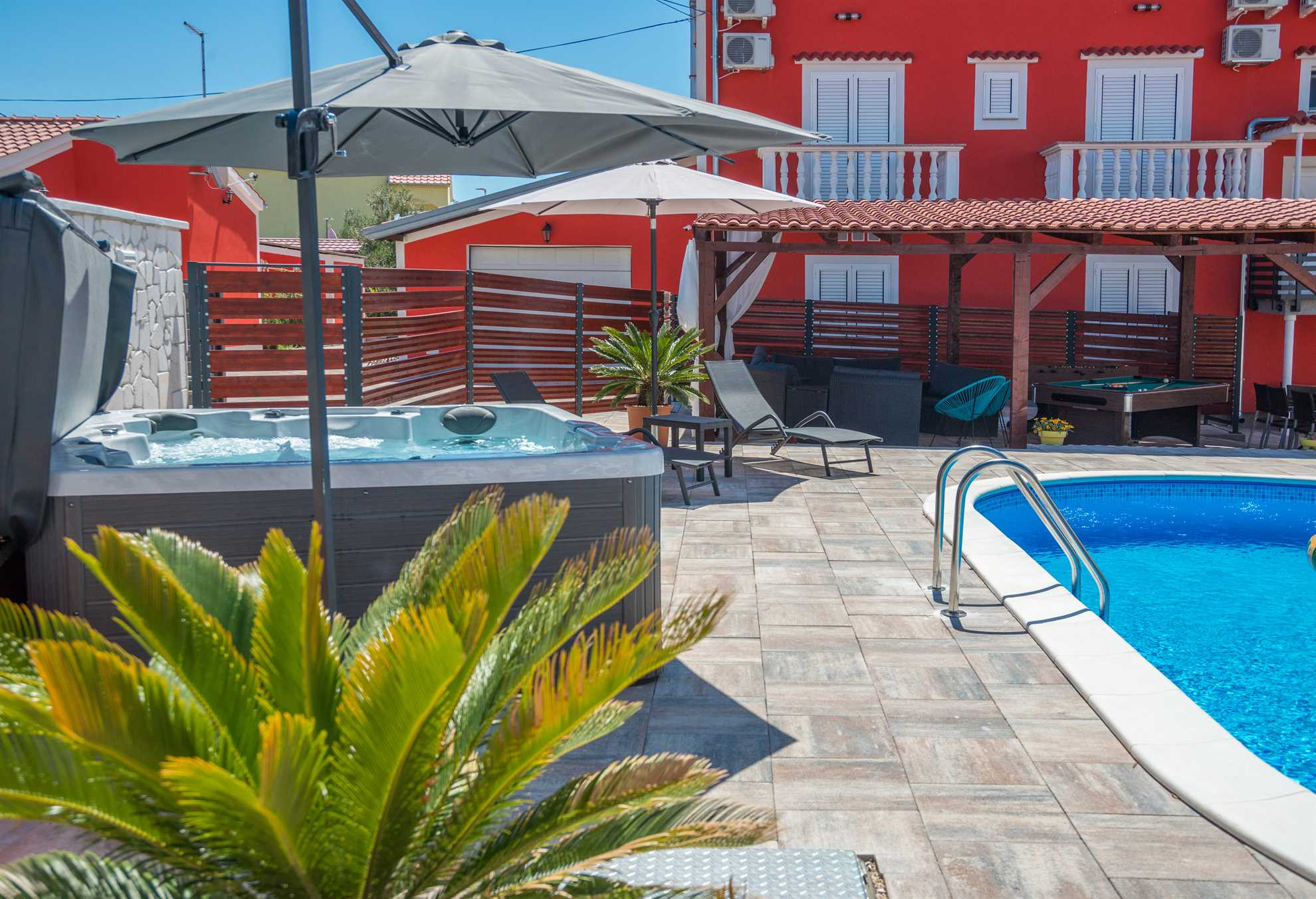 Besonderes Augenmerk wurde auf den Außenbereich gelegt, der zum Entspannen und geselligen Beisammensein einlädt. Auf der großzügigen Sonnenterrasse befinden sich ein beheizter Pool und ein Whirlpool – perfekt für Genuss und Erholung zu jeder Tageszeit. Direkt neben dem Pool gibt es einen überdachten Sitzbereich mit angenehmem Schatten sowie einen Billardtisch – ideal für den Morgenkaffee, entspannte Nachmittage oder gemütliche Abende.