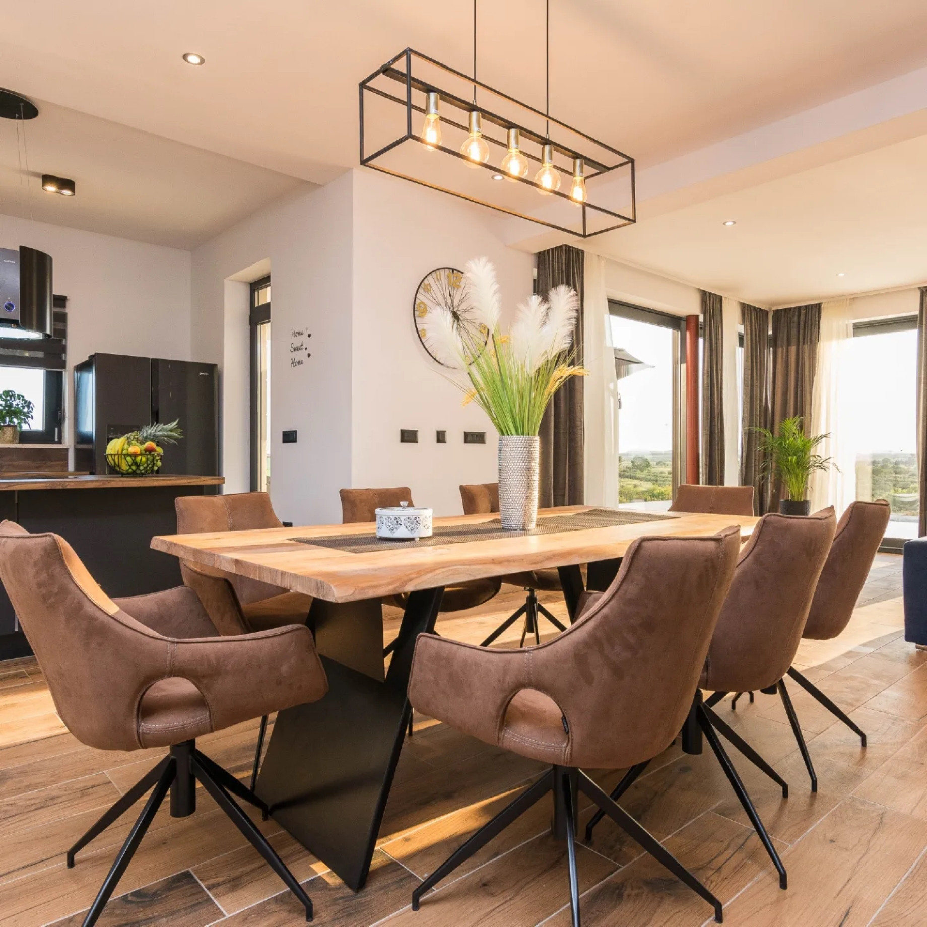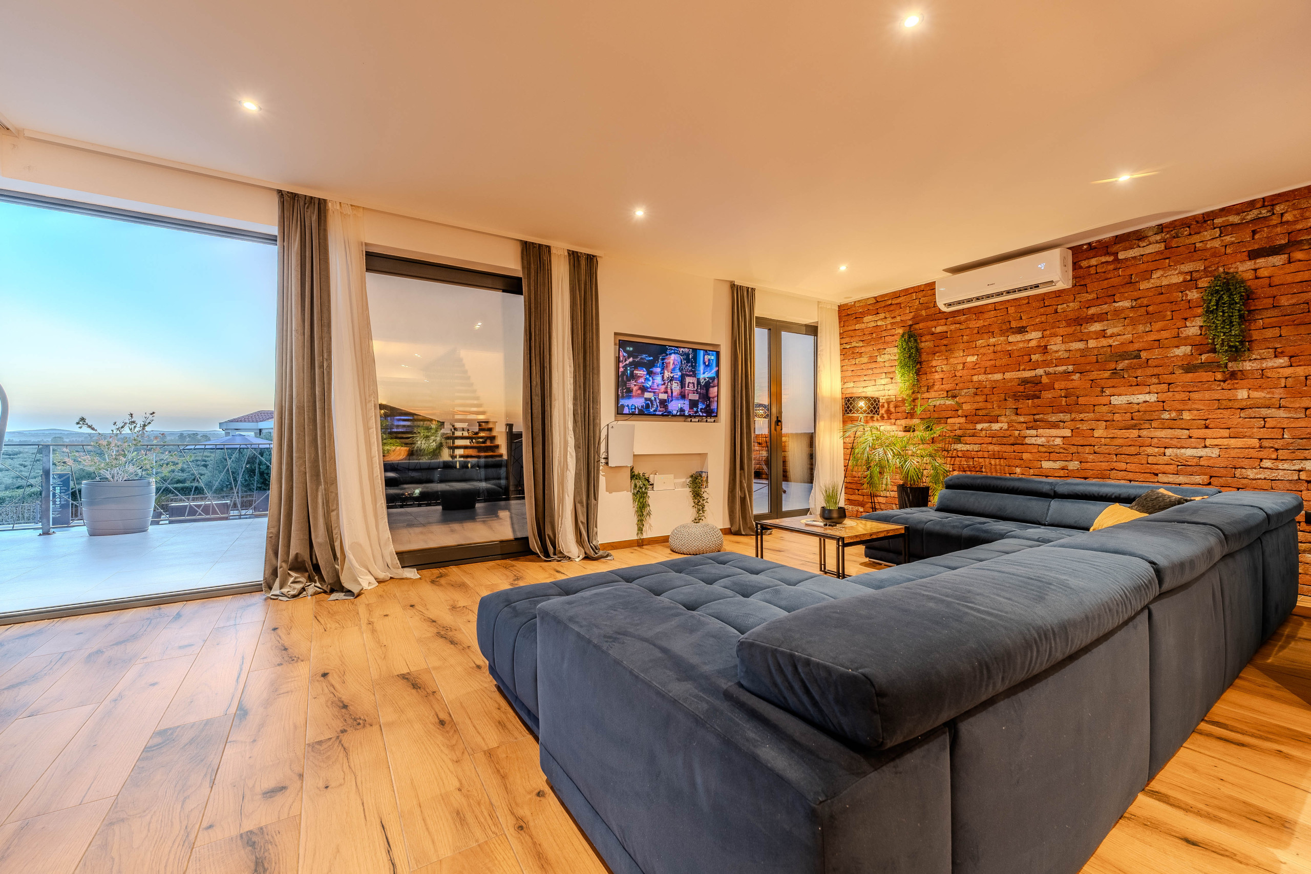 Der Außenbereich der Villa Lara ist eine wahre Oase der Entspannung. Die großzügige Terrasse mit einem großen Esstisch ermöglicht es den Gästen, den atemberaubenden Blick auf die unberührte Natur zu genießen. Der 60 m² große Salzwasser Pool mit Hydromassage-Funktion und separatem Kinderbereich bietet die perfekte Erfrischung. Rund um den Pool befinden sich 12 Sonnenliegen mit Sonnenschirmen – ideal zum Sonnenbaden und Entspannen. Im Hof gibt es zudem einen Sitzbereich mit einer Sommerküche und einem Grill.