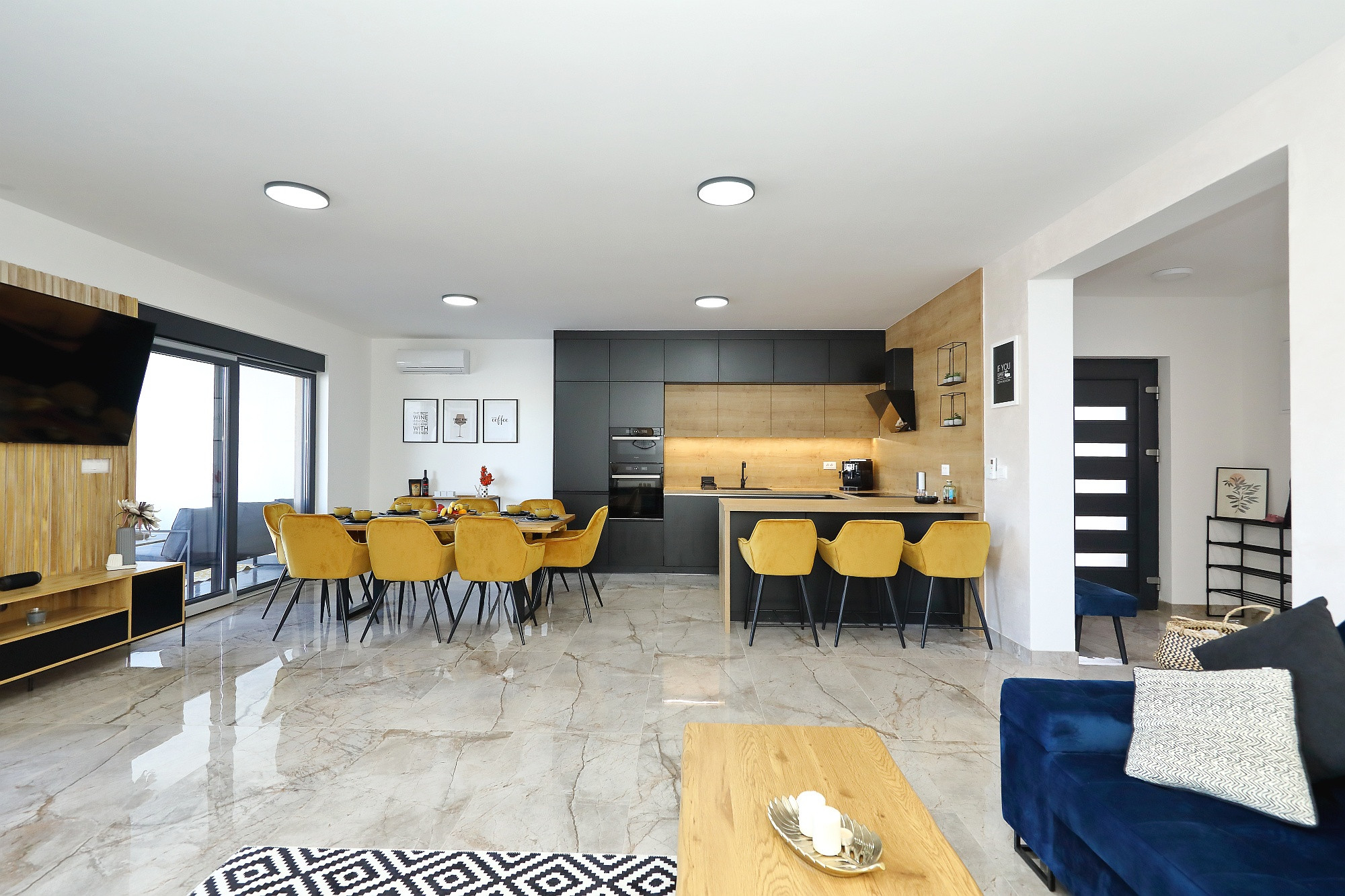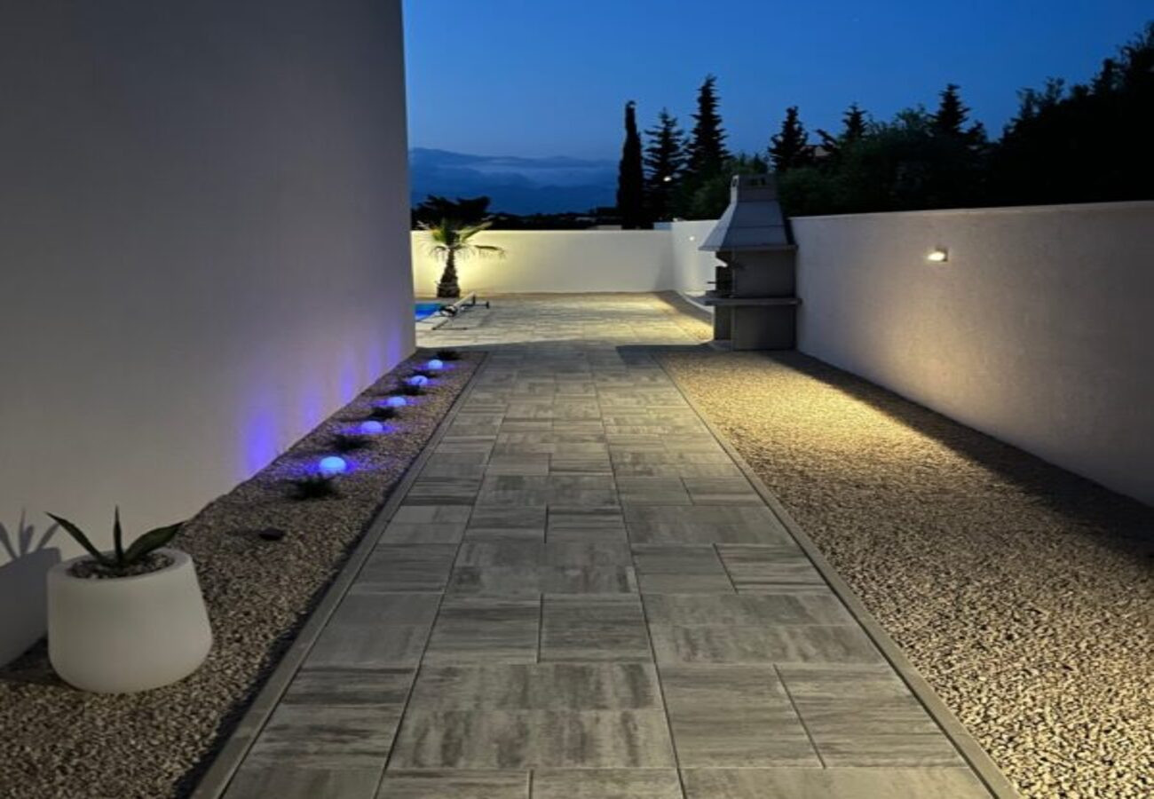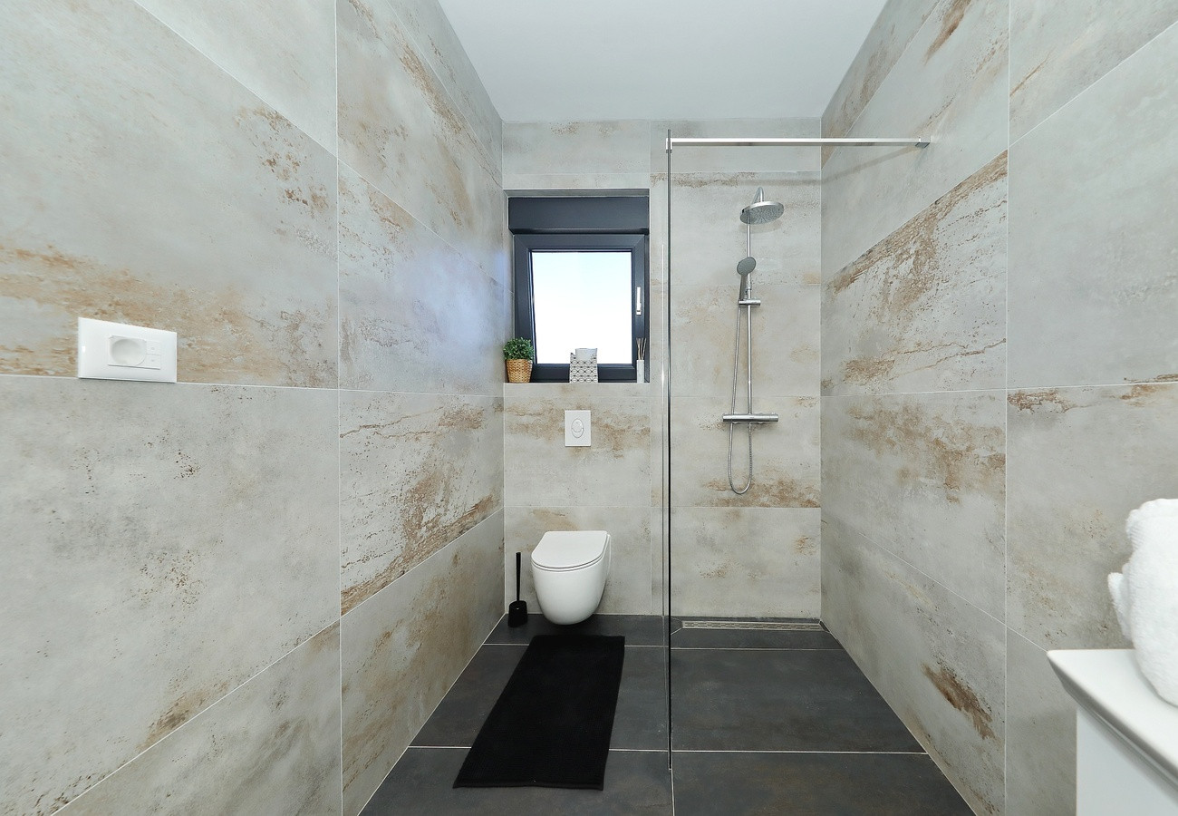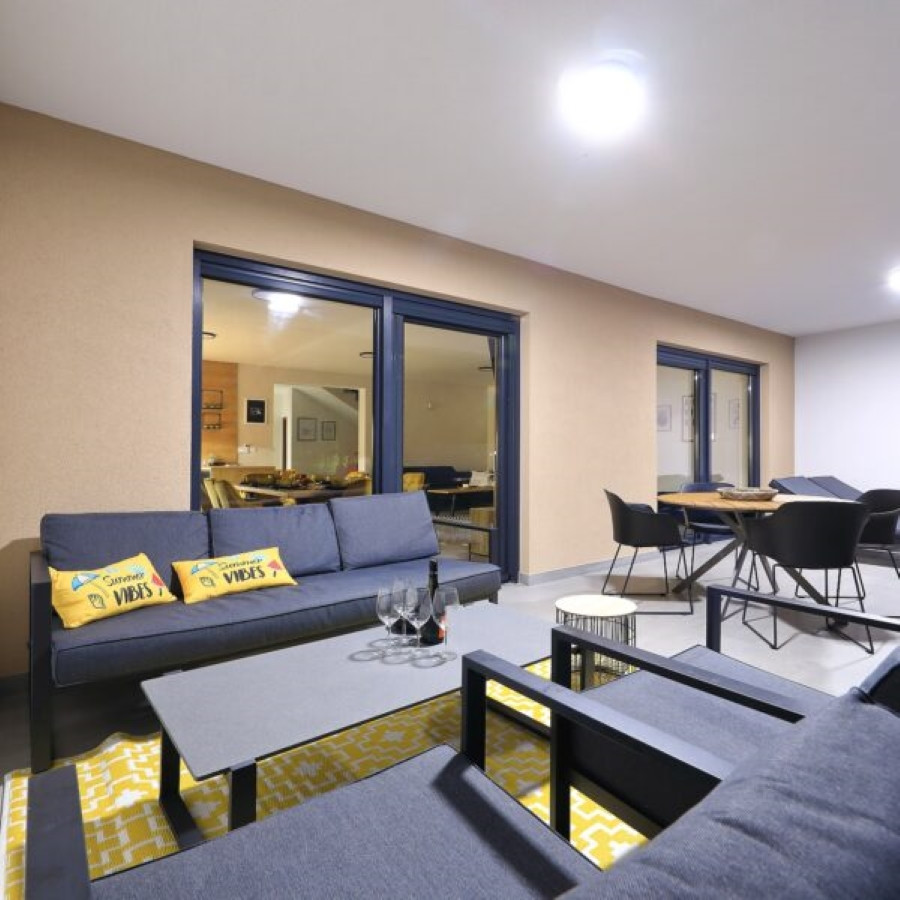 Das Erdgeschoss verfügt über eine geräumige, voll ausgestattete Küche mit allen notwendigen Geräten, einschließlich Geschirrspüler, Ofen, Mikrowelle und Kaffeemaschine. Die Küche ist mit dem Wohnzimmer verbunden, das einen großen Fernseher hat, und der Raum ist perfekt für Entspannung und gemeinsame Momente gestaltet. Die Villa verfügt über 4 Schlafzimmer, von denen 3 ein eigenes Badezimmer und Klimaanlage haben, was Privatsphäre und Komfort für alle Gäste sicherstellt. Die Villa bietet kostenloses WLAN, privaten Parkplatz und eine Terrasse mit Bergblick, die die perfekte Umgebung zum Entspannen und Genießen der Privatsphäre schafft. Der Außenbereich umfasst einen beheizten Pool, Sonnenliegen, eine Außendusche und einen Grill, perfekt für Mahlzeiten im Freien.