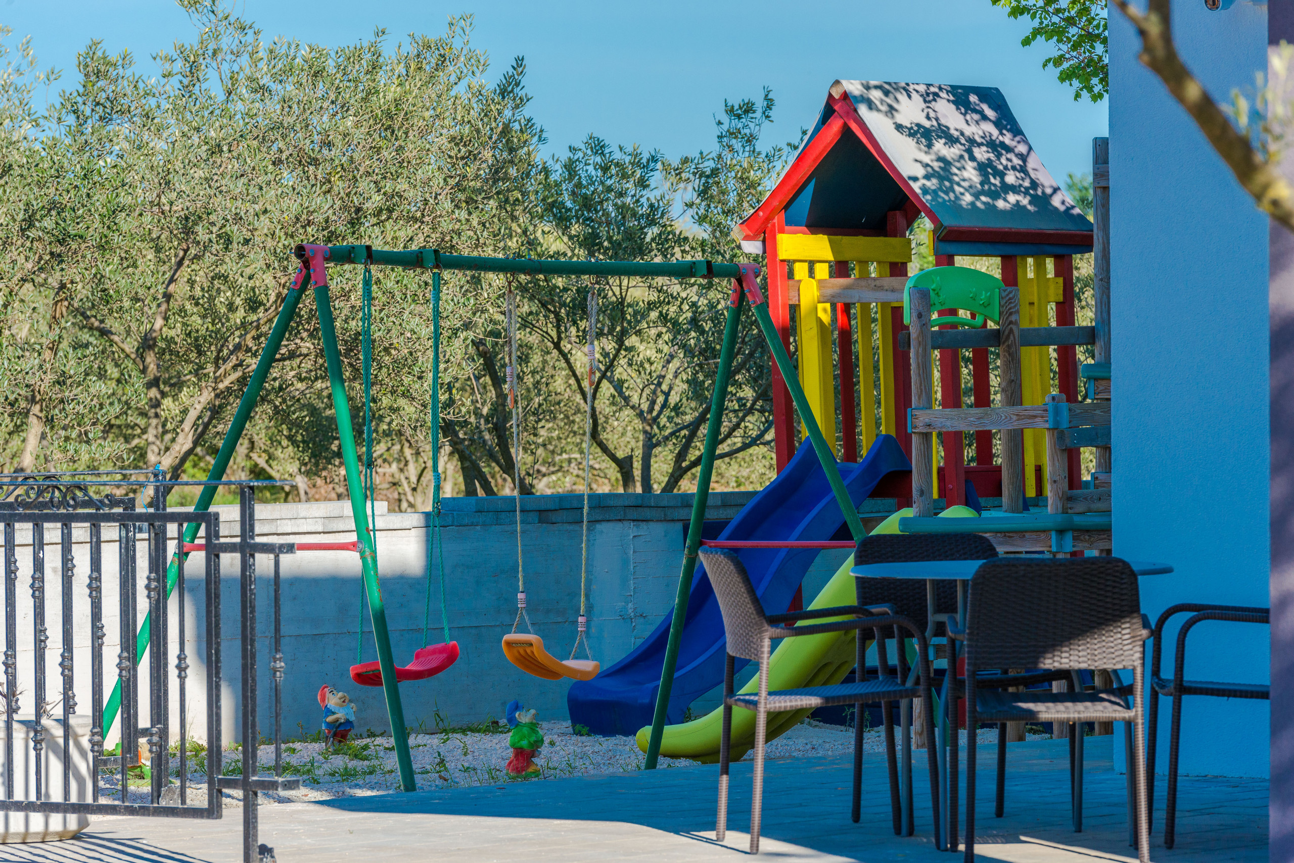 Das gesamte Anwesen ist umzäunt und bietet Ihnen somit absolute Privatsphäre und Sicherheit. Zusätzliche Annehmlichkeiten wie Tischtennis und ein Kinderspielplatz sorgen für Spaß für Groß und Klein.