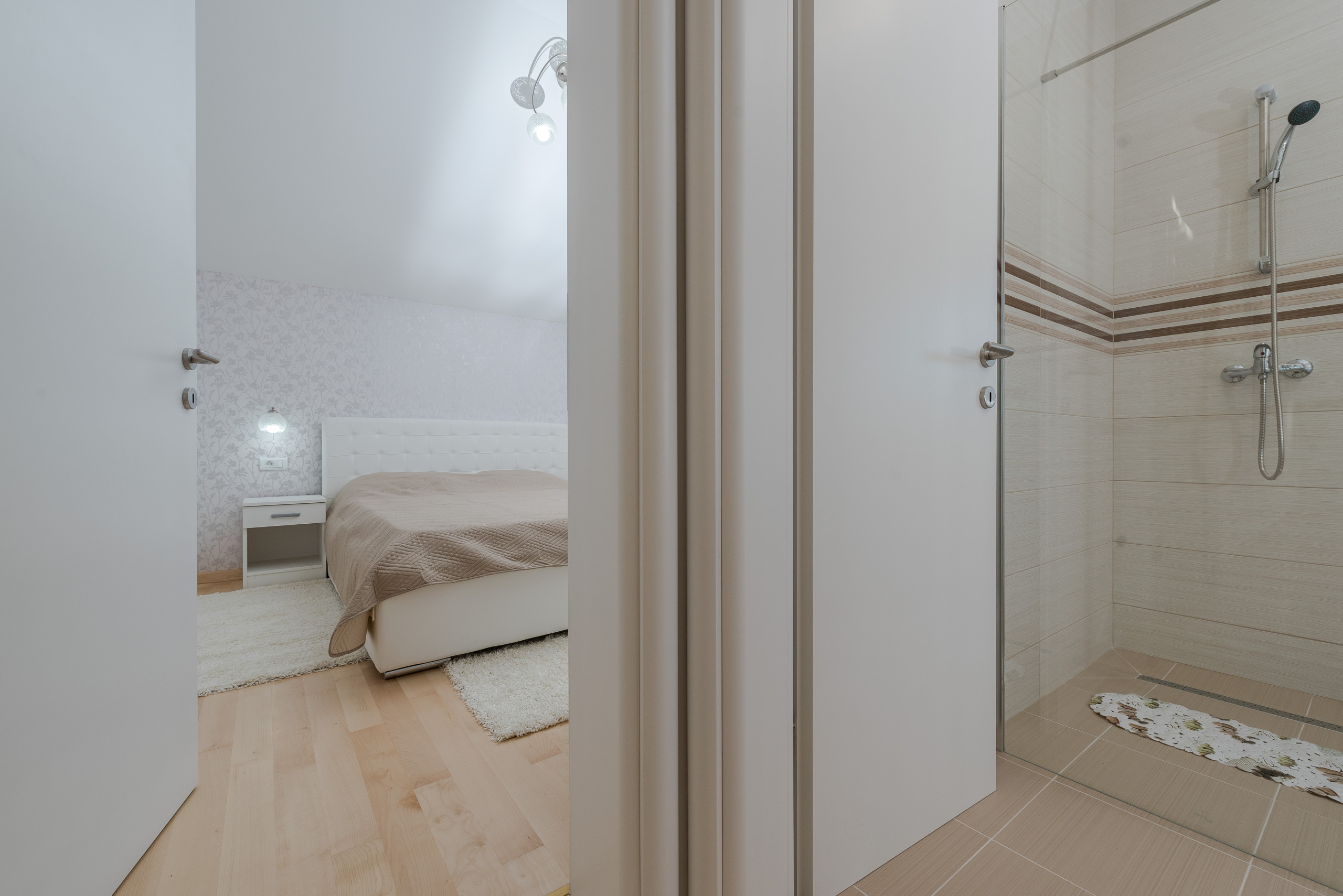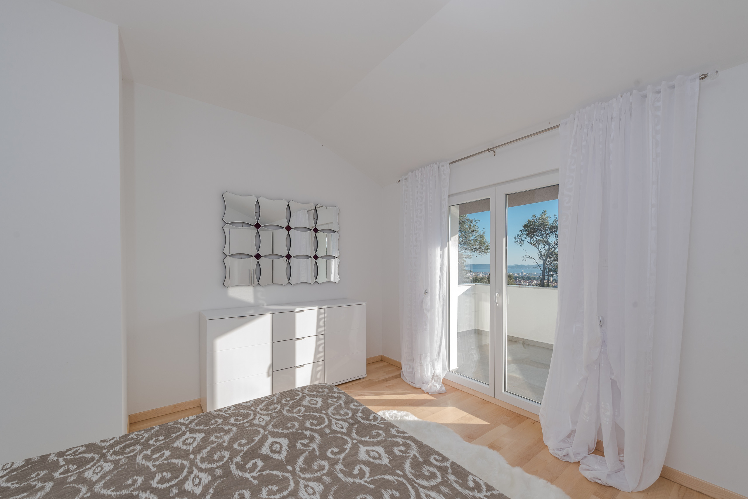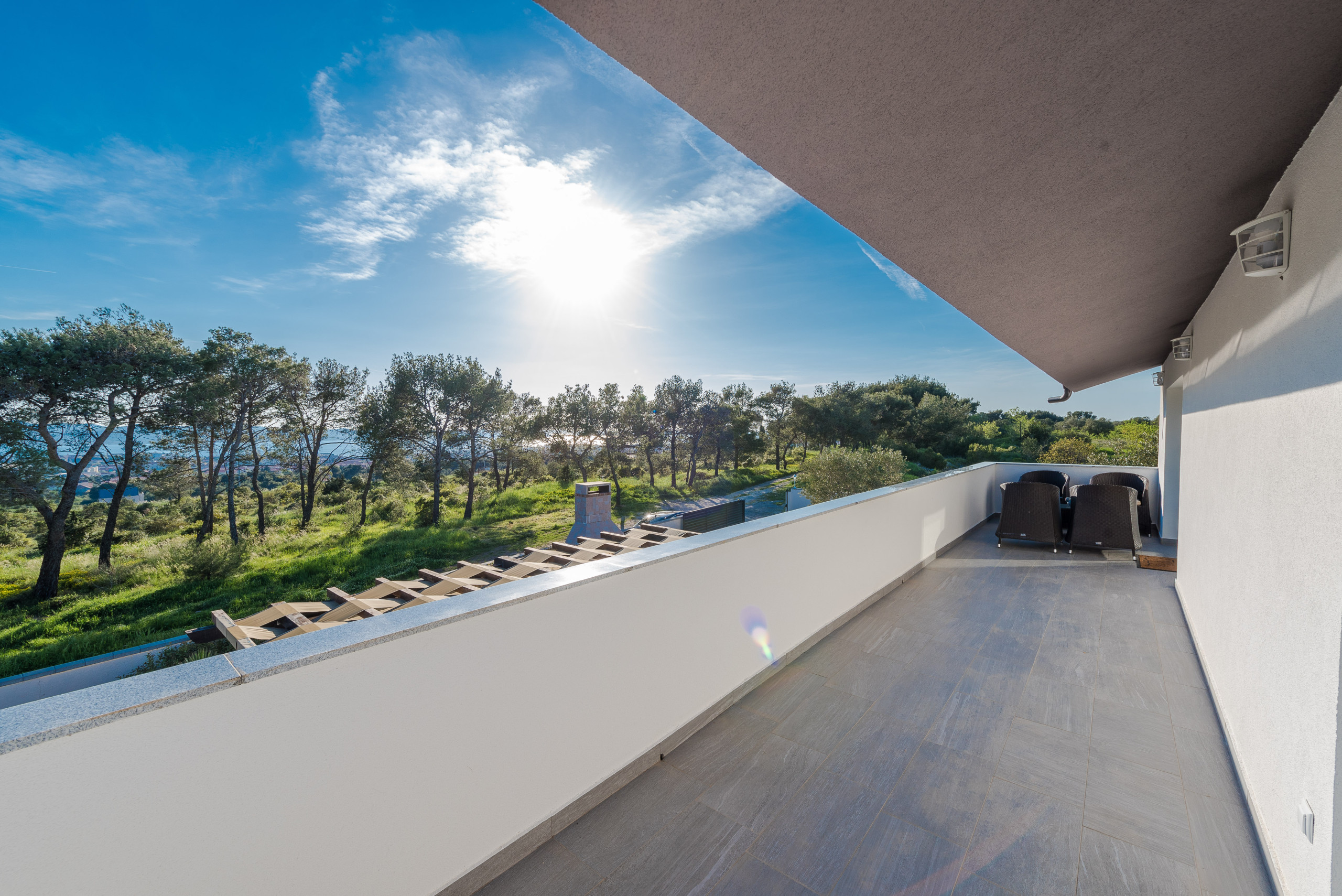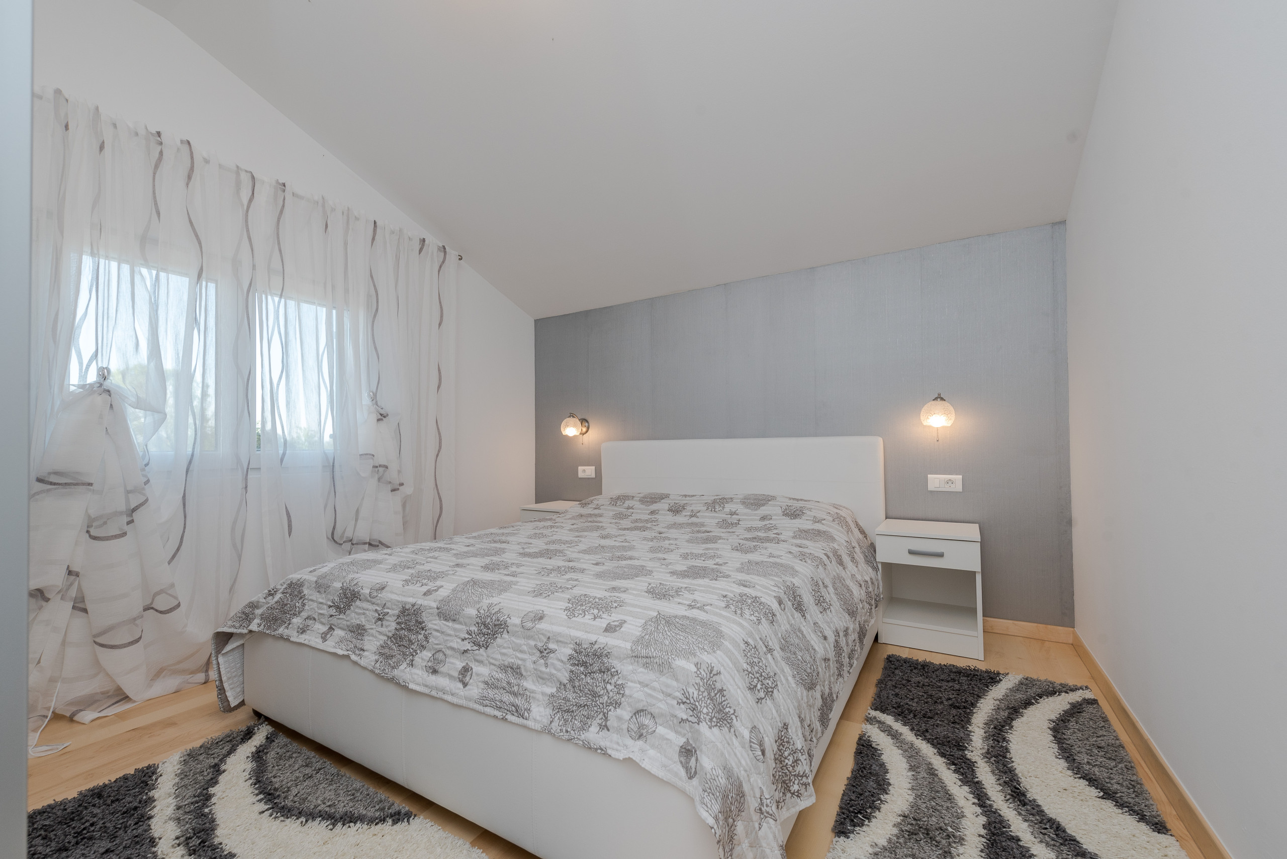 Im ersten Stock befinden sich vier luxuriöse Hauptschlafzimmer, jedes mit einem privaten Badezimmer mit Dusche, Kingsize-Bett (180 x 200 cm) und Balkonen mit Panoramablick auf das Meer und die Stadt Zadar, alle ausgestattet mit einer zentralen Klimaanlage für optimalen Komfort. Der erste Stock verfügt außerdem über eine praktische Küche und einen Waschraum.