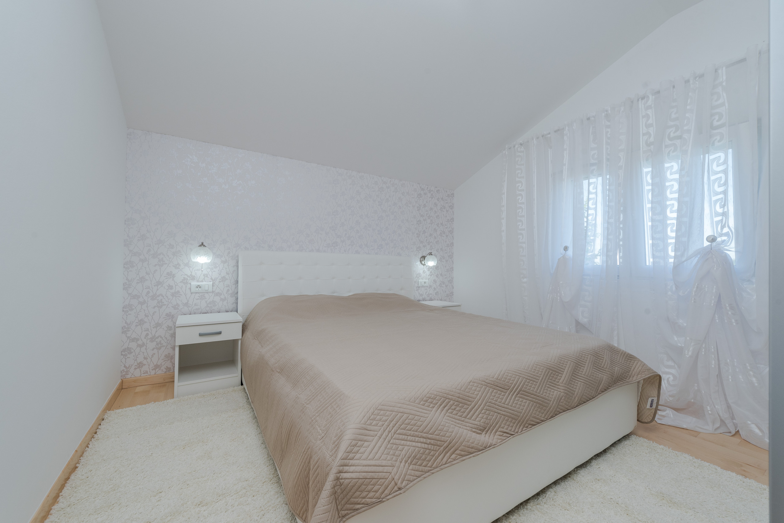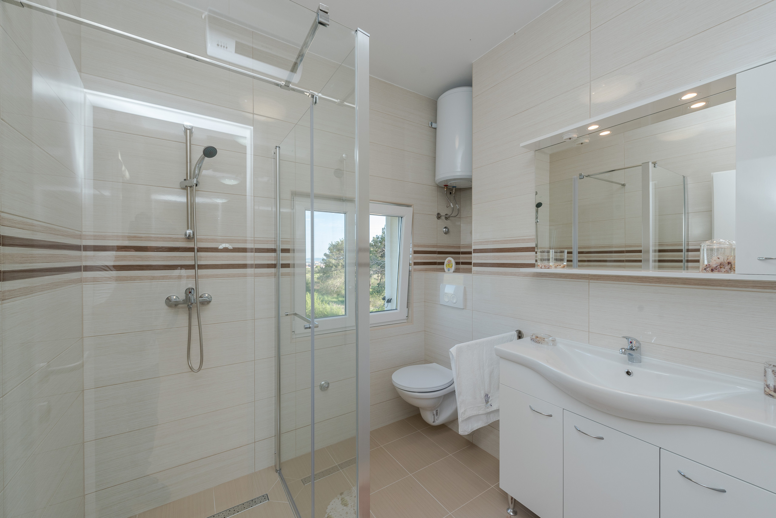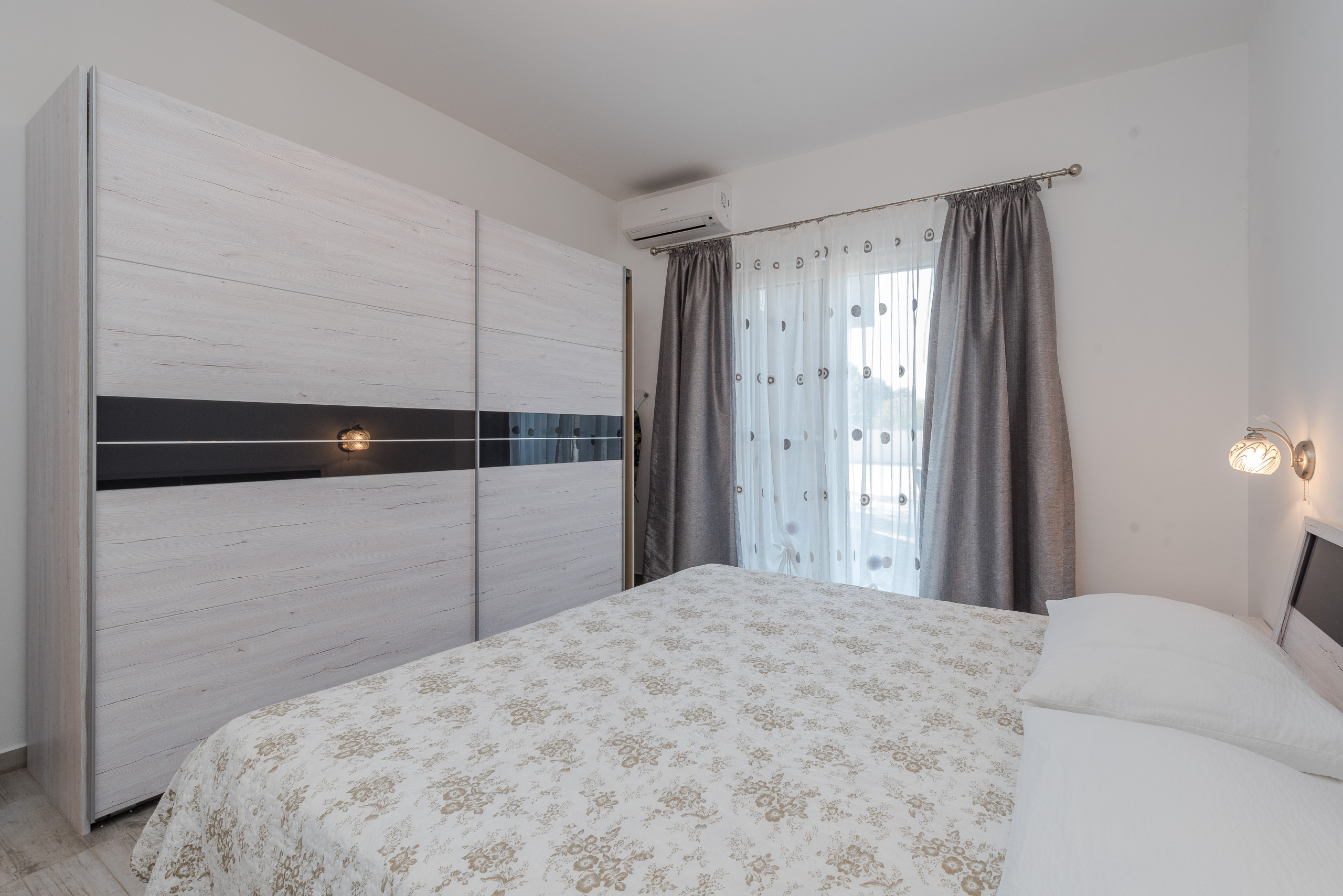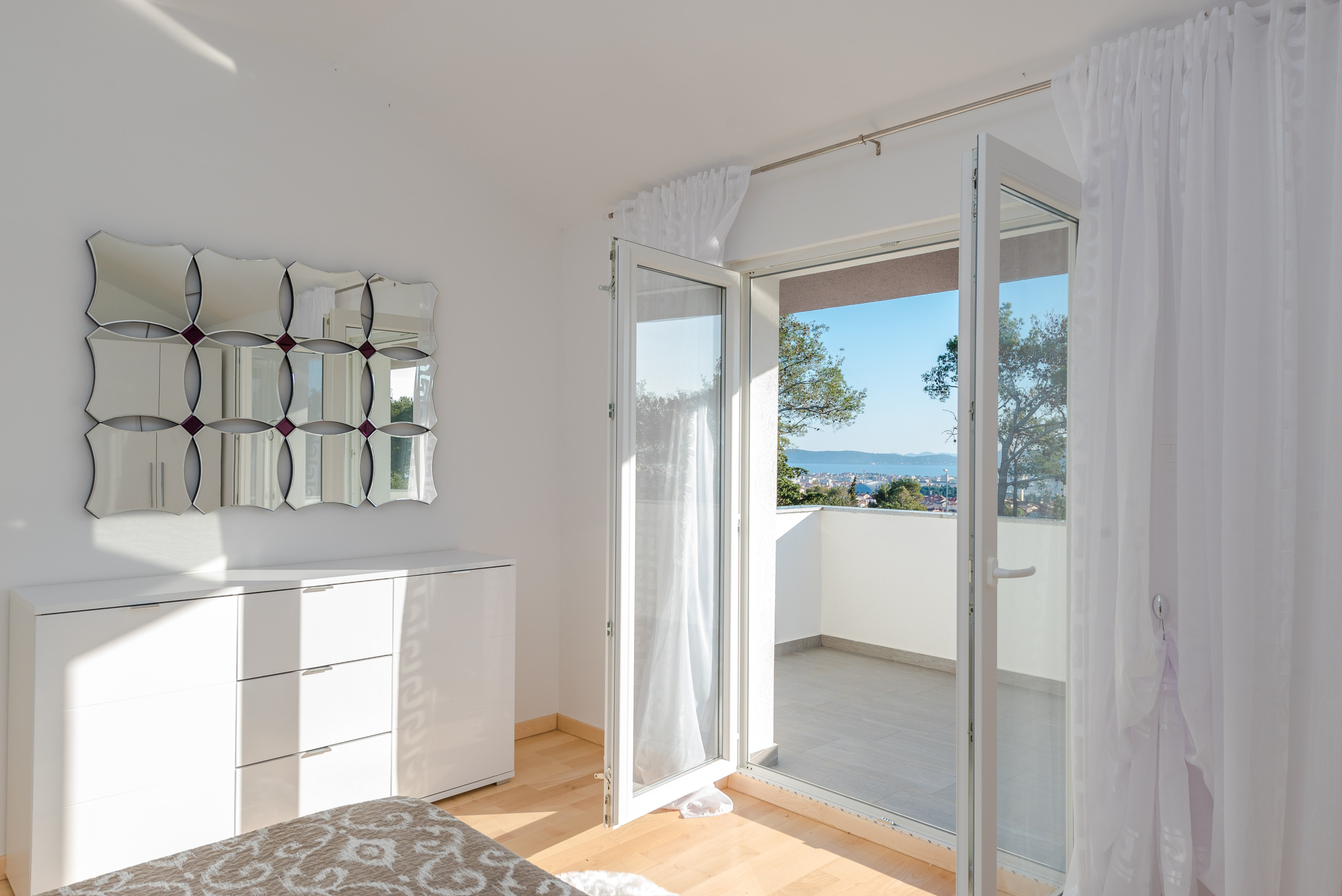 Im ersten Stock befinden sich vier luxuriöse Hauptschlafzimmer, jedes mit einem privaten Badezimmer mit Dusche, Kingsize-Bett (180 x 200 cm) und Balkonen mit Panoramablick auf das Meer und die Stadt Zadar, alle ausgestattet mit einer zentralen Klimaanlage für optimalen Komfort. Der erste Stock verfügt außerdem über eine praktische Küche und einen Waschraum.