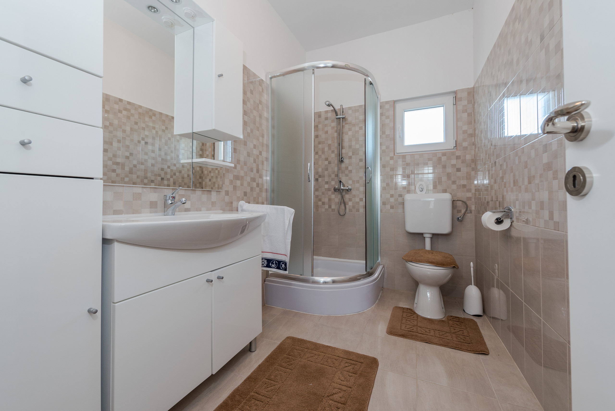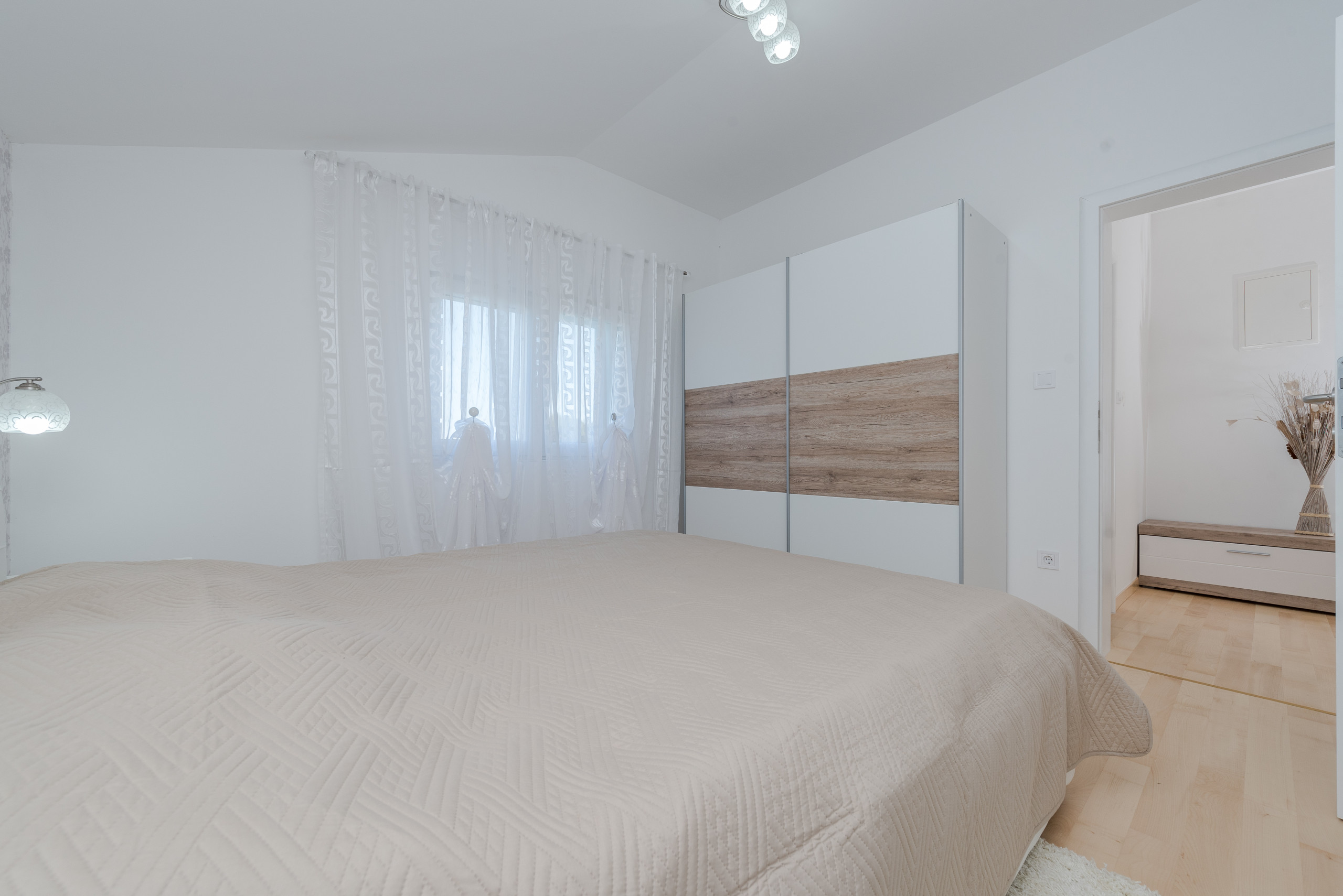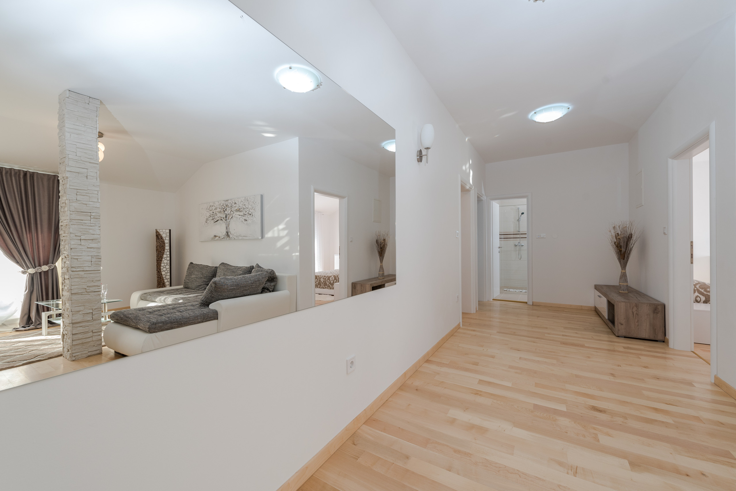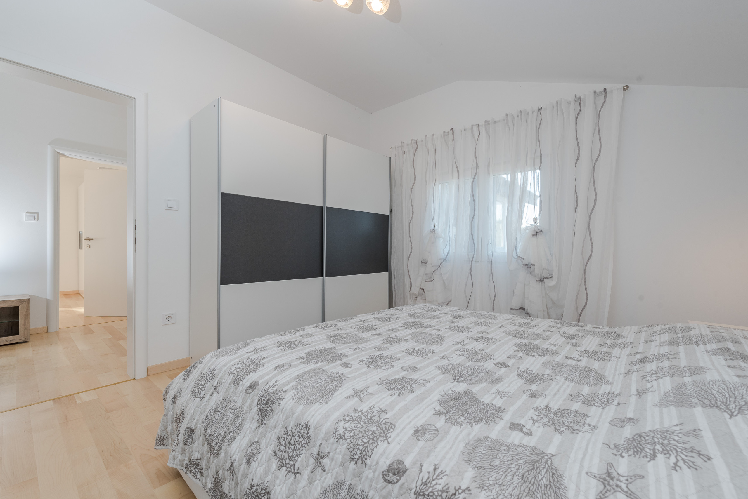 Im ersten Stock befinden sich vier luxuriöse Hauptschlafzimmer, jedes mit einem privaten Badezimmer mit Dusche, Kingsize-Bett (180 x 200 cm) und Balkonen mit Panoramablick auf das Meer und die Stadt Zadar, alle ausgestattet mit einer zentralen Klimaanlage für optimalen Komfort. Der erste Stock verfügt außerdem über eine praktische Küche und einen Waschraum.