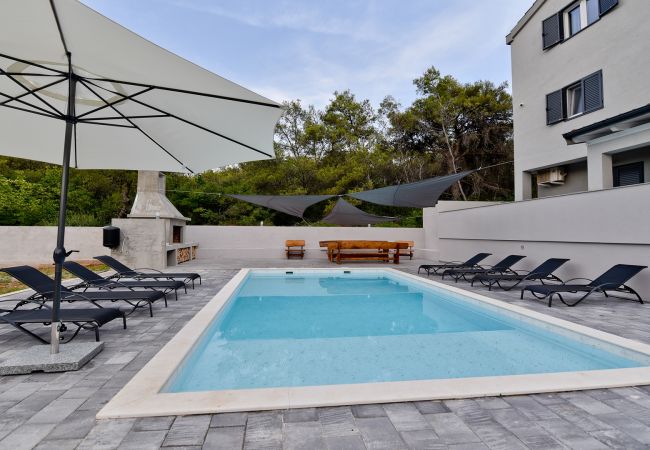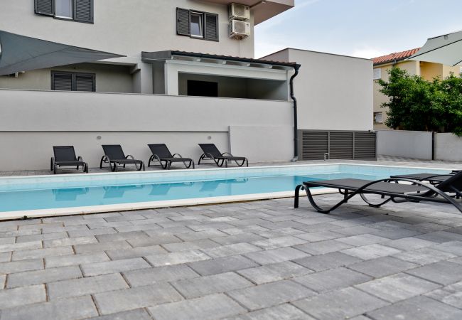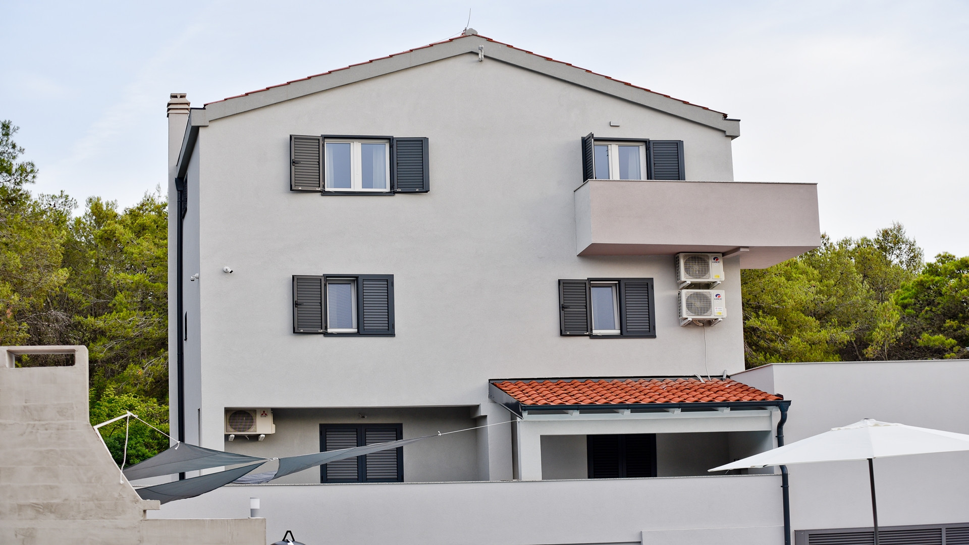 Im ersten Stock befinden sich vier luxuriöse Hauptschlafzimmer, jedes mit einem privaten Badezimmer mit Dusche, Kingsize-Bett (180 x 200 cm) und Balkonen mit Panoramablick auf das Meer und die Stadt Zadar, alle ausgestattet mit einer zentralen Klimaanlage für optimalen Komfort. Der erste Stock verfügt außerdem über eine praktische Küche und einen Waschraum.