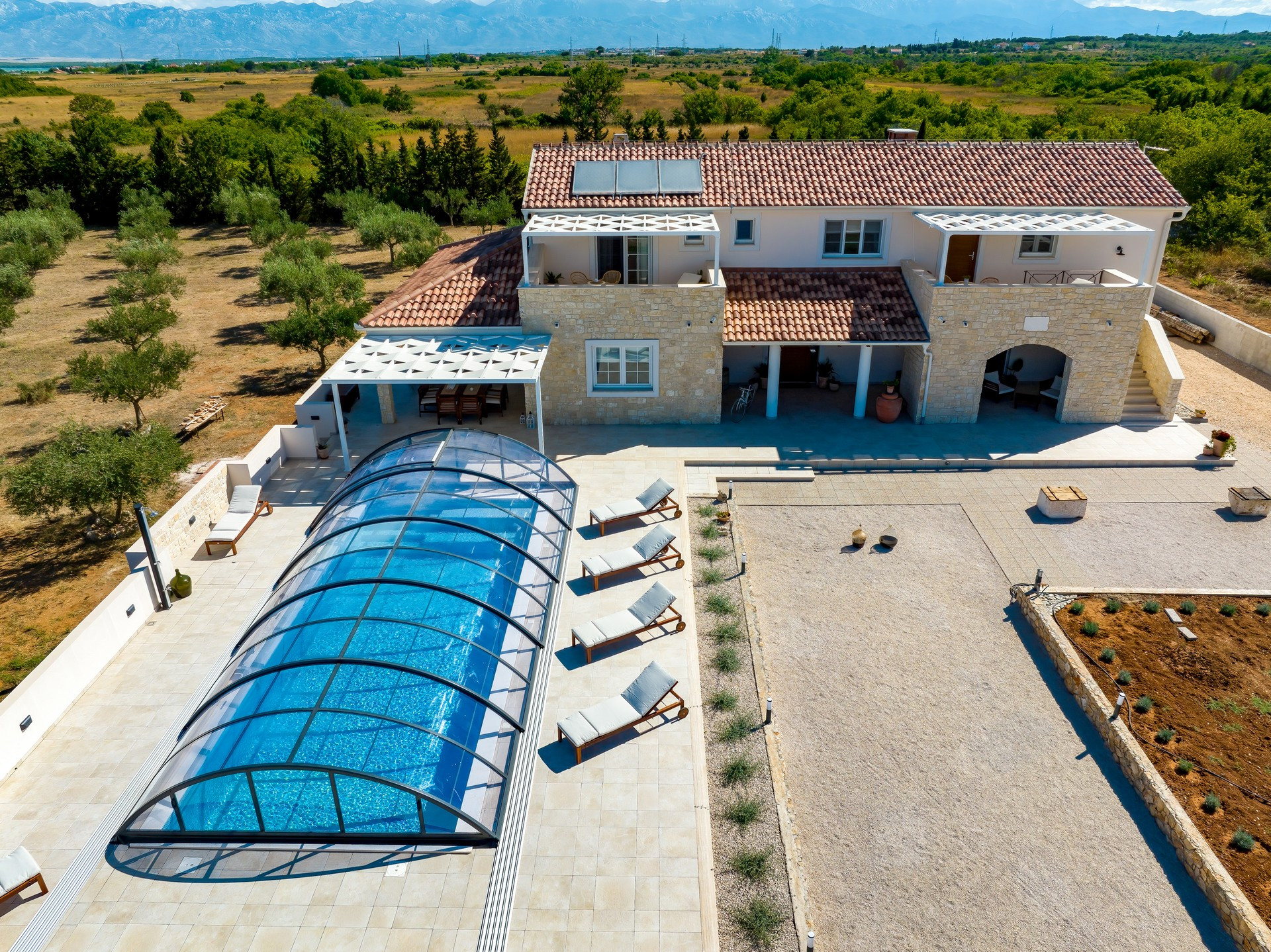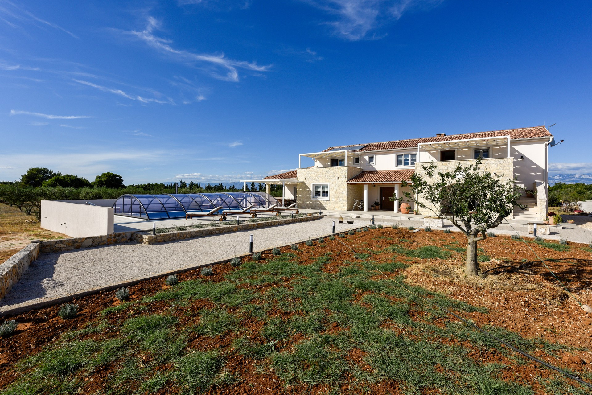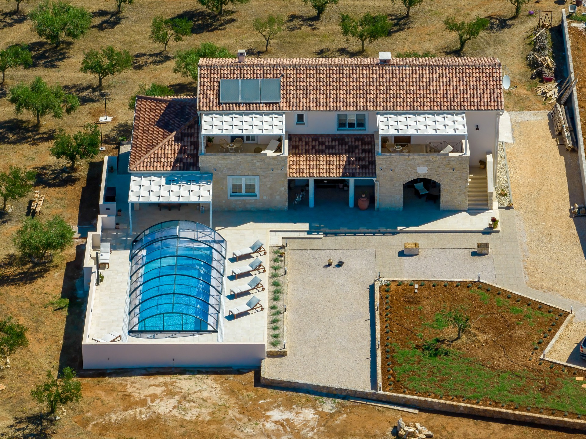 Die Villa ist Teil eines vollständig umzäunten Grundstücks und ist von Olivenhainen und Weinbergen umgeben. Es verfügt über ein offenes Wohnzimmer, ein Esszimmer und eine Küche mit gemischten dekorativen Elementen aus Moderne, Rustikalem und Industriellem. Es verfügt über insgesamt 4 Schlafzimmer. Der Hauptteil der Villa verfügt über 3 Schlafzimmer, eines mit einem Kingsize-Bett und eigenem Bad, eines mit einem Queensize-Bett und eines mit zwei Einzelbetten sowie ein weiteres Badezimmer. Ein Schlafzimmer mit einem Queensize-Bett ist Teil eines kleineren Teils der Villa mit separatem Eingang, der auch über eine kleine Küche, ein Wohnzimmer und ein Badezimmer verfügt.