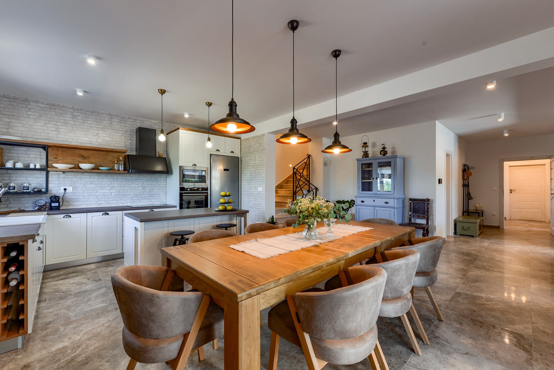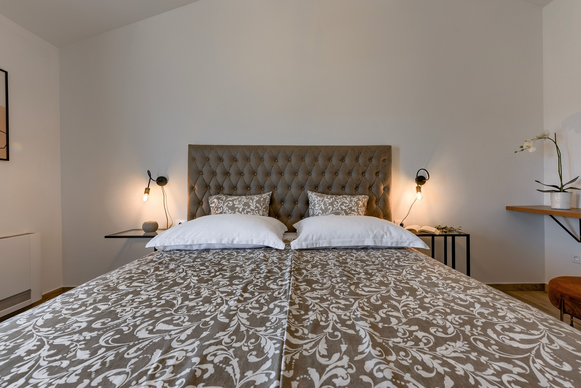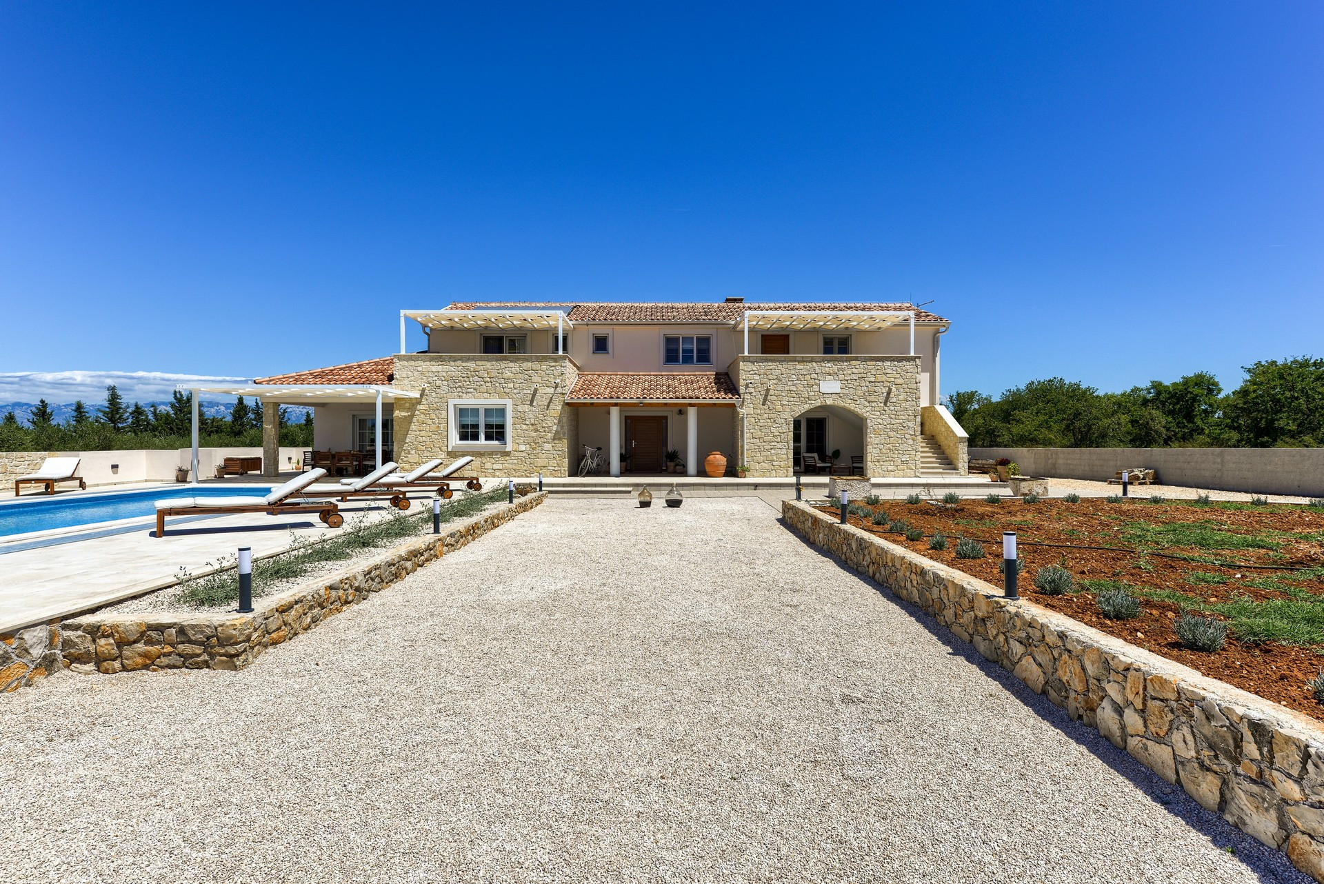 Die Villa ist Teil eines vollständig umzäunten Grundstücks und ist von Olivenhainen und Weinbergen umgeben. Es verfügt über ein offenes Wohnzimmer, ein Esszimmer und eine Küche mit gemischten dekorativen Elementen aus Moderne, Rustikalem und Industriellem. Es verfügt über insgesamt 4 Schlafzimmer. Der Hauptteil der Villa verfügt über 3 Schlafzimmer, eines mit einem Kingsize-Bett und eigenem Bad, eines mit einem Queensize-Bett und eines mit zwei Einzelbetten sowie ein weiteres Badezimmer. Ein Schlafzimmer mit einem Queensize-Bett ist Teil eines kleineren Teils der Villa mit separatem Eingang, der auch über eine kleine Küche, ein Wohnzimmer und ein Badezimmer verfügt.