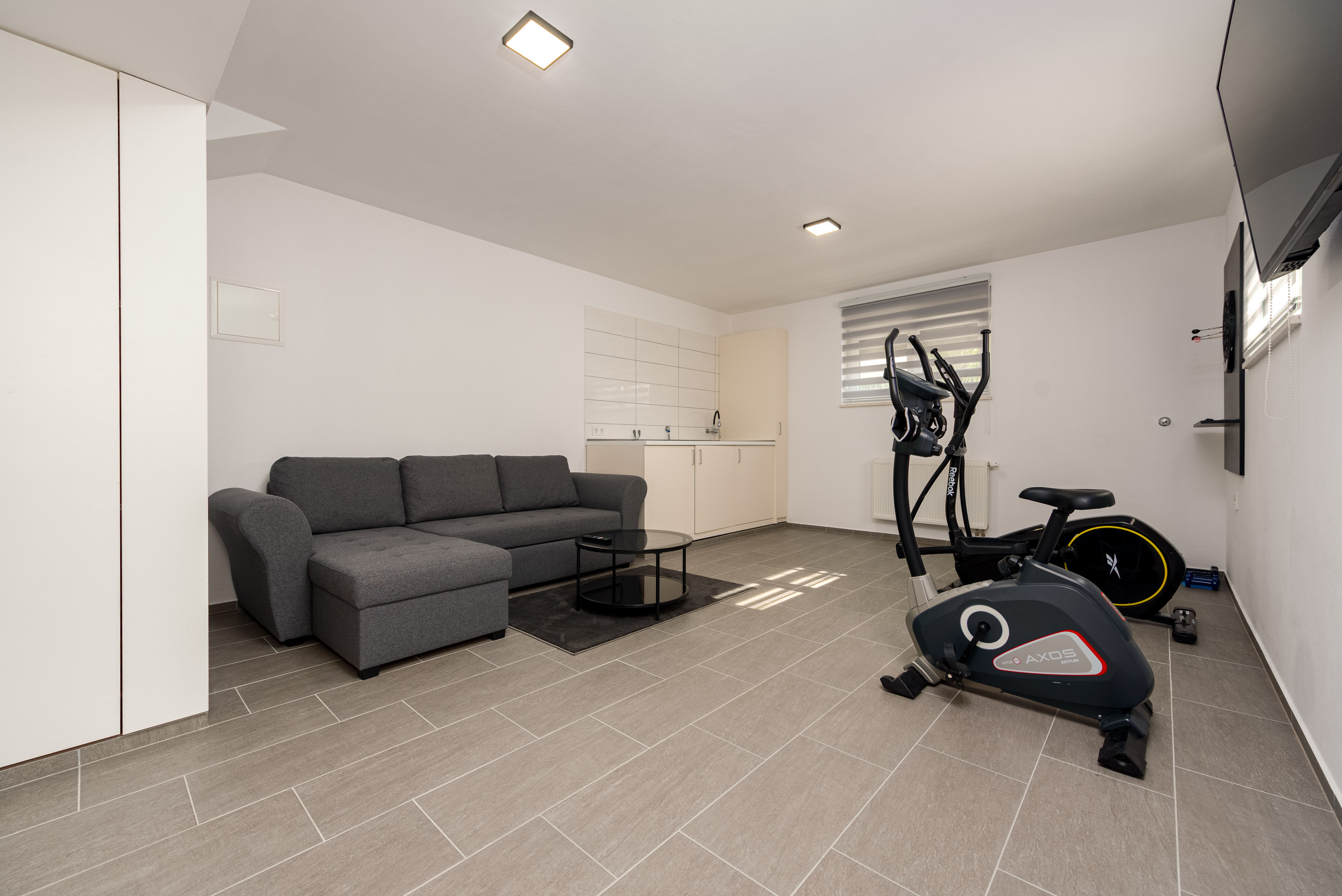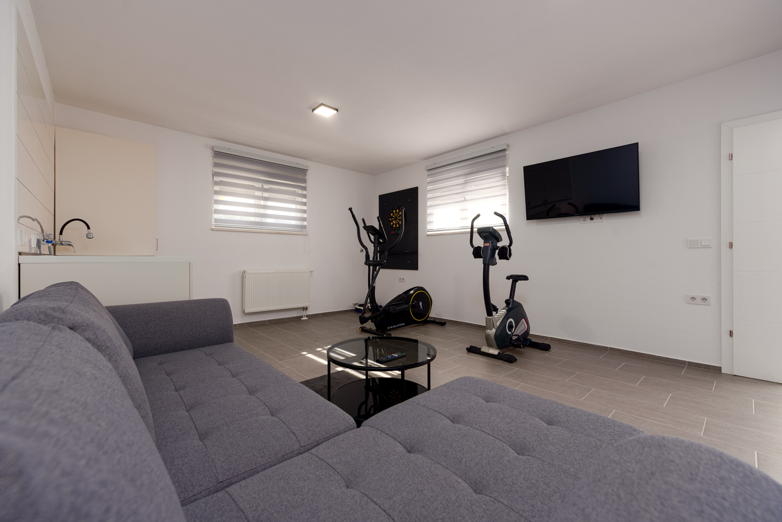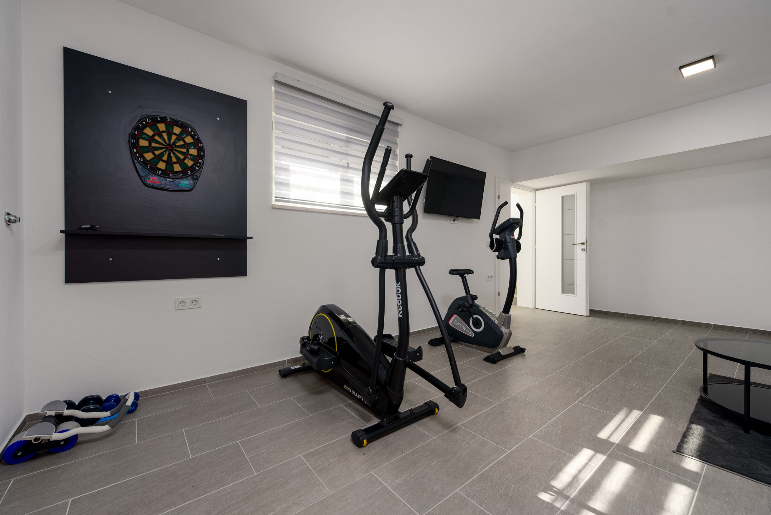 Im Kellergeschoss der Villa befindet sich ein privates Fitnessstudio, das mit grundlegender Trainingsausrüstung, einem Fernseher und einem Sofa ausgestattet ist – ein idealer Ort zur Erholung oder Entspannung.