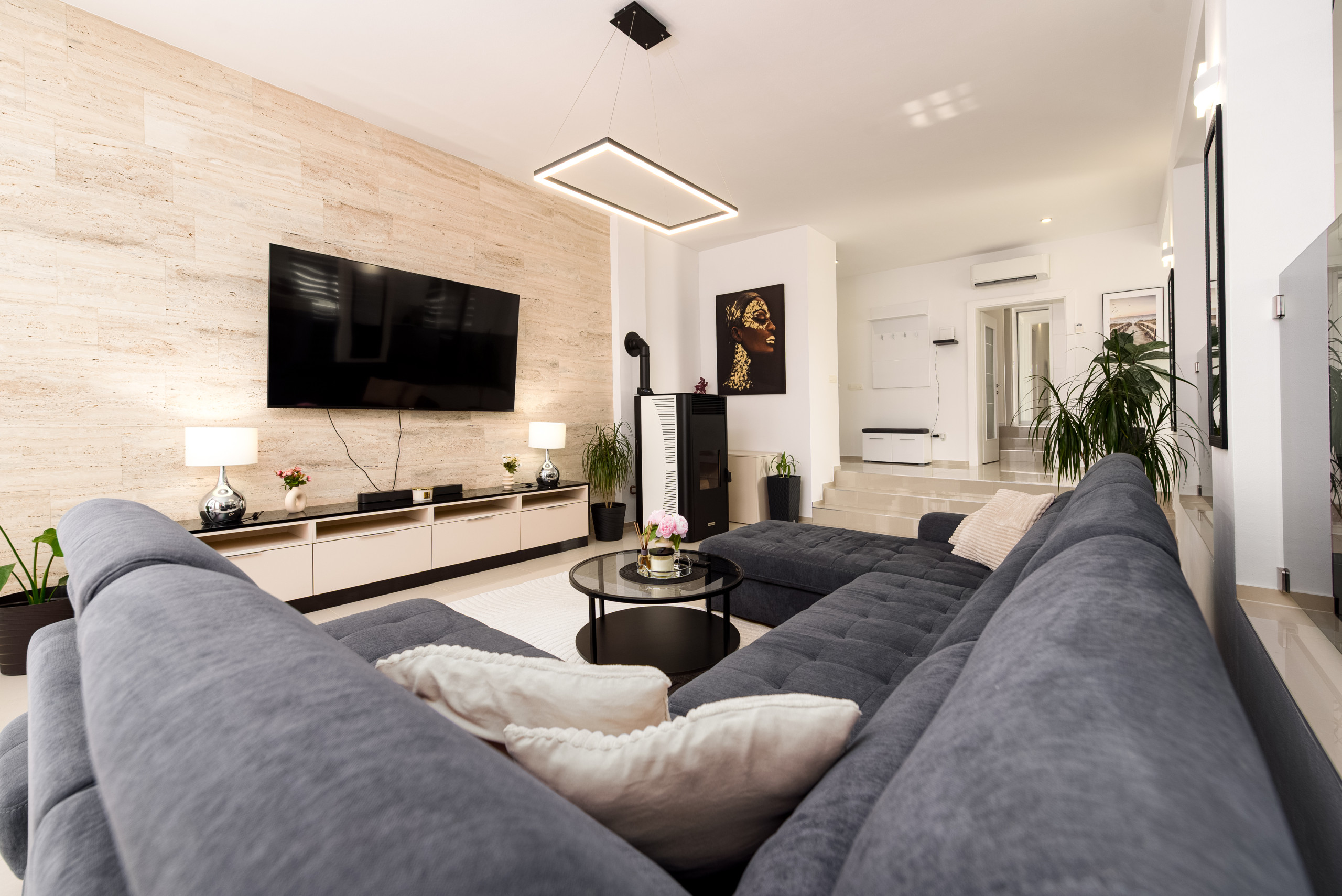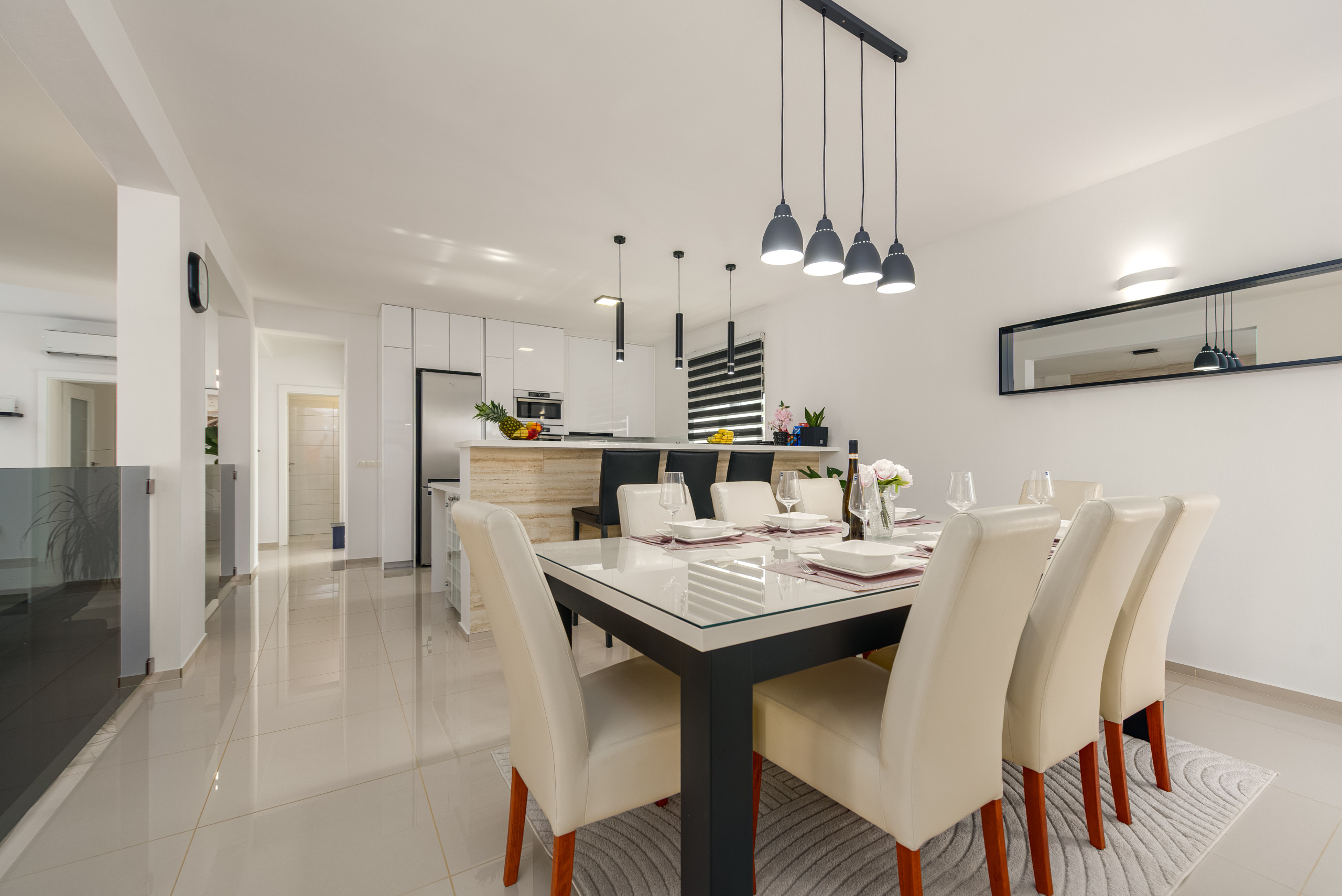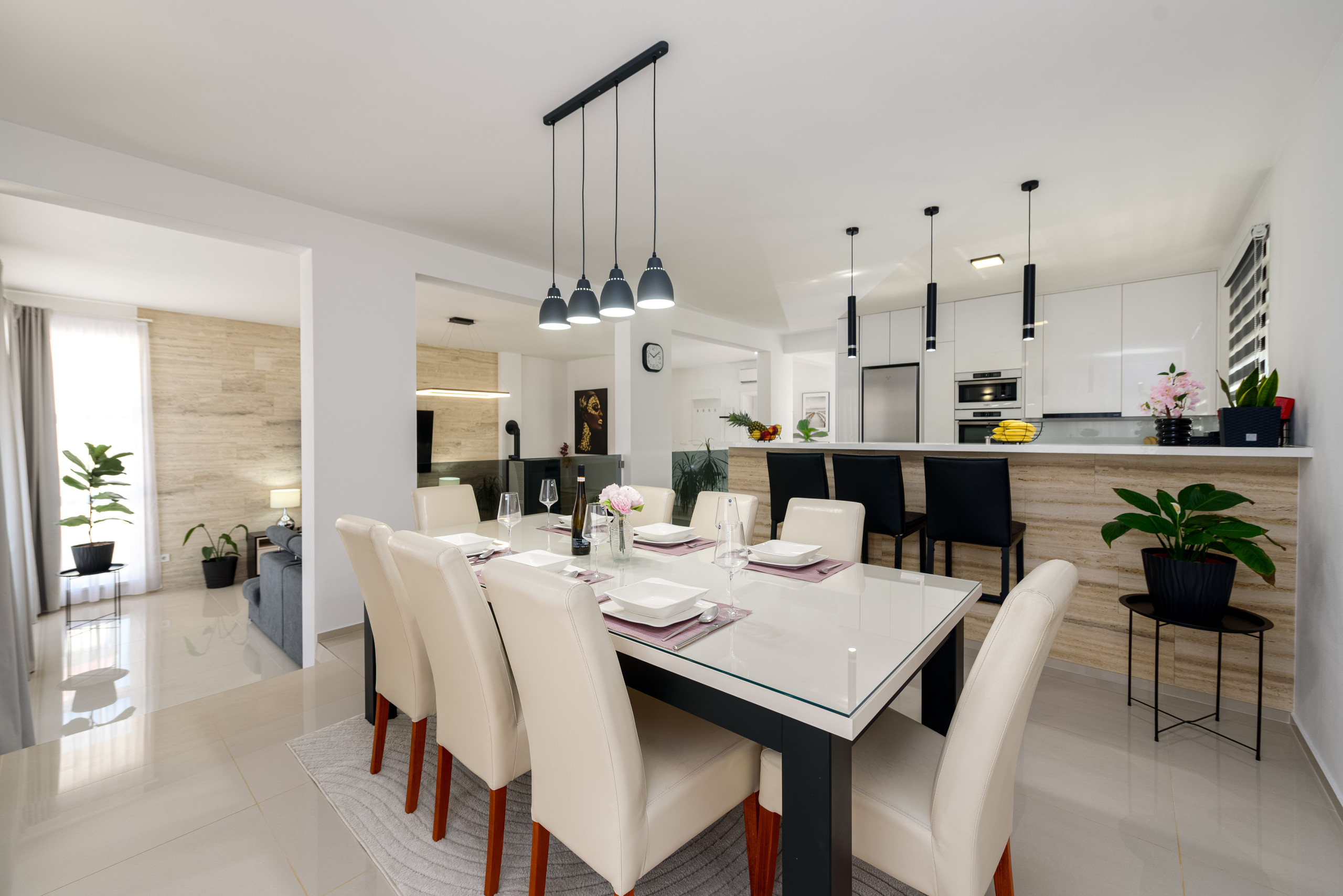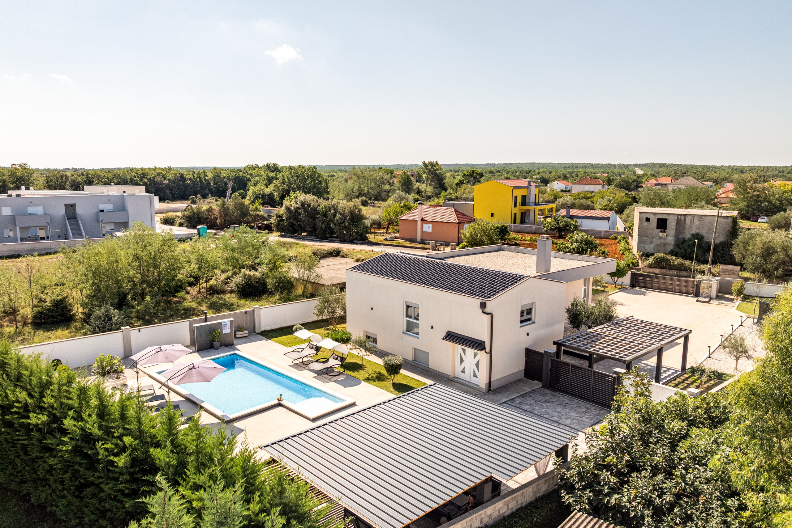 Diese moderne und funktional gestaltete Villa bietet Platz für bis zu sechs Gäste und verfügt über drei komfortable Schlafzimmer, jeweils mit einem Doppelbett. Die Gäste haben Zugang zu zwei voll ausgestatteten Badezimmern sowie zu einer eleganten, modernen Küche, die sich nahtlos in einen offenen Wohnbereich mit einem geräumigen und gemütlichen Wohnzimmer einfügt – perfekt zum Entspannen und Geselligkeit.