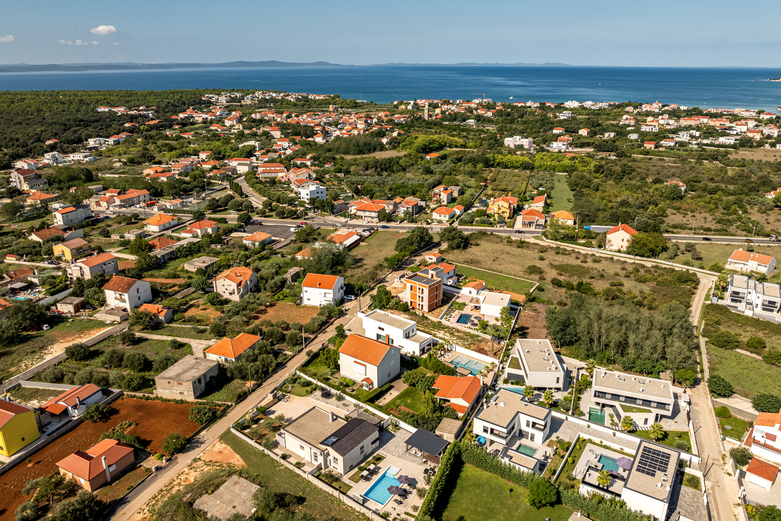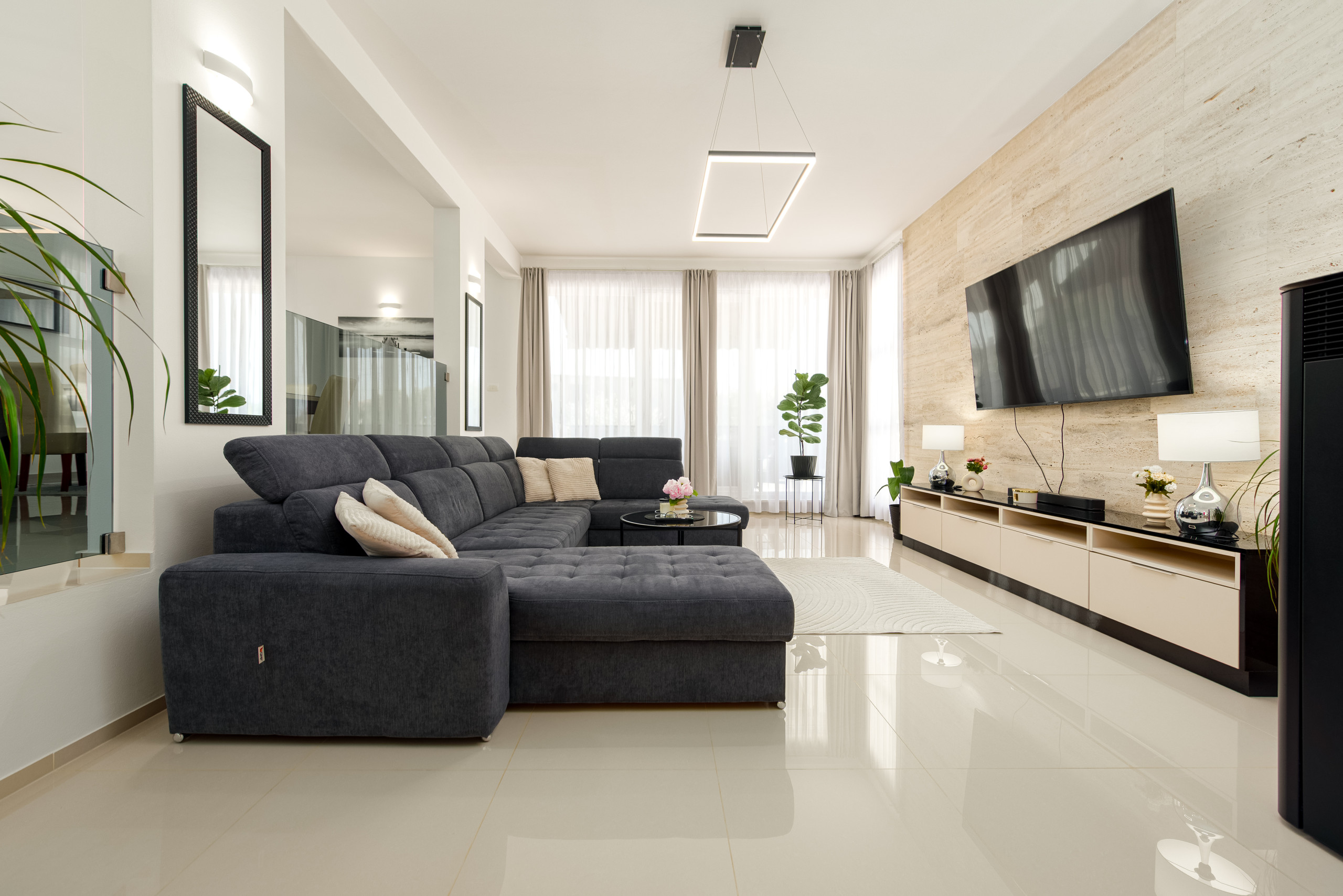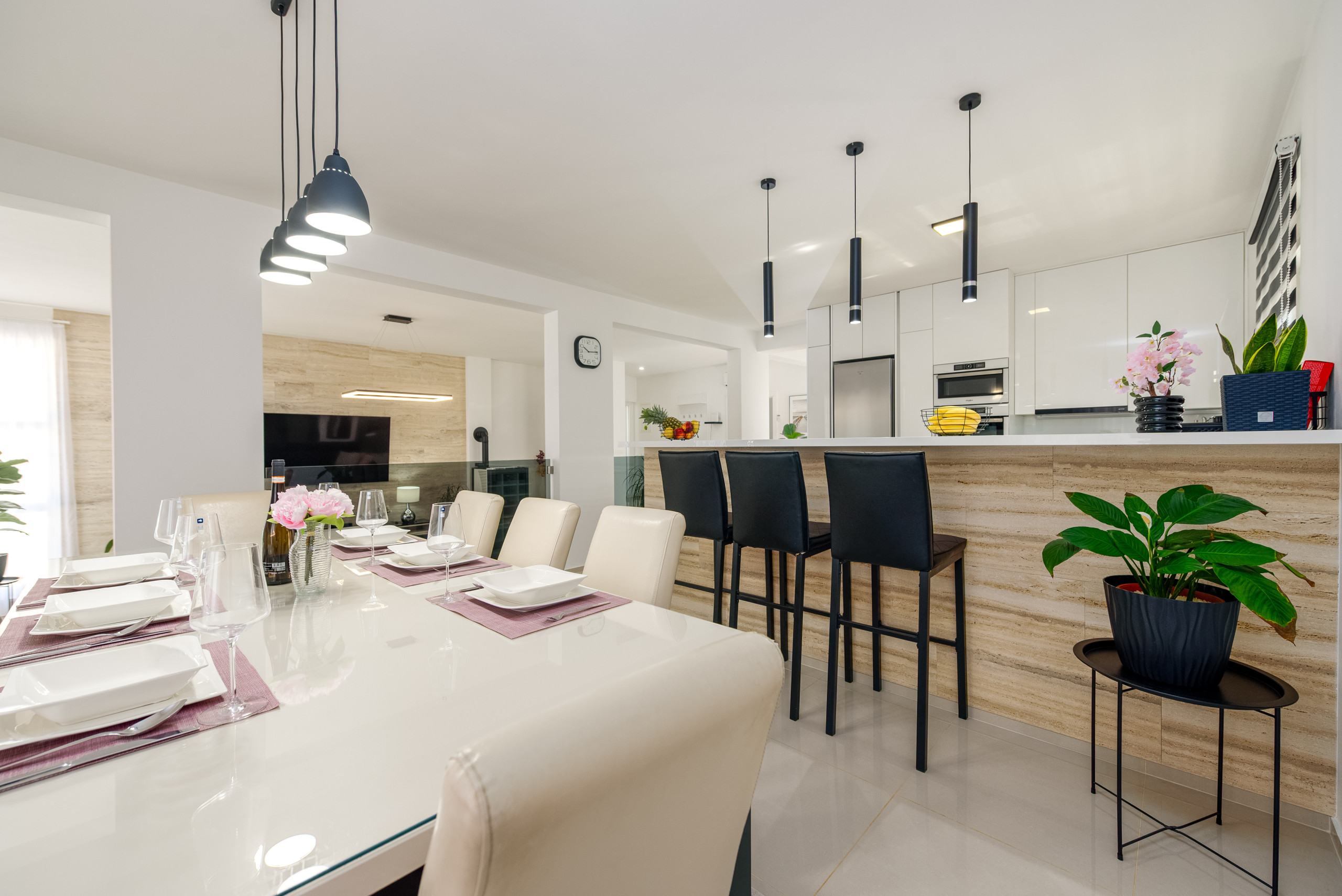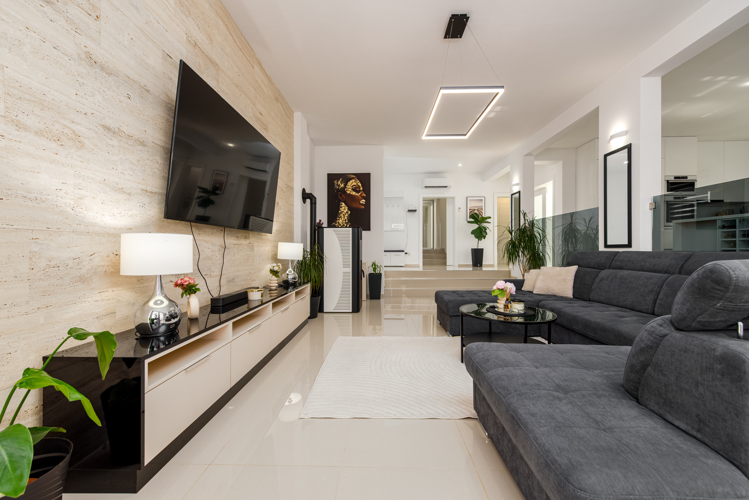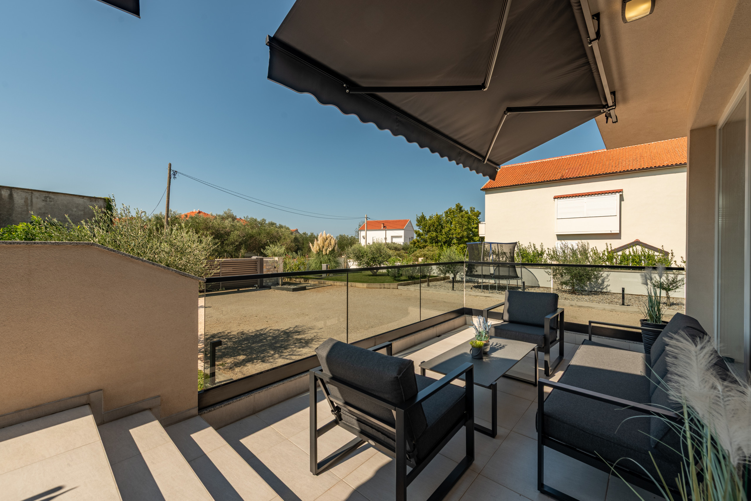 Diese moderne und funktional gestaltete Villa bietet Platz für bis zu sechs Gäste und verfügt über drei komfortable Schlafzimmer, jeweils mit einem Doppelbett. Die Gäste haben Zugang zu zwei voll ausgestatteten Badezimmern sowie zu einer eleganten, modernen Küche, die sich nahtlos in einen offenen Wohnbereich mit einem geräumigen und gemütlichen Wohnzimmer einfügt – perfekt zum Entspannen und Geselligkeit.