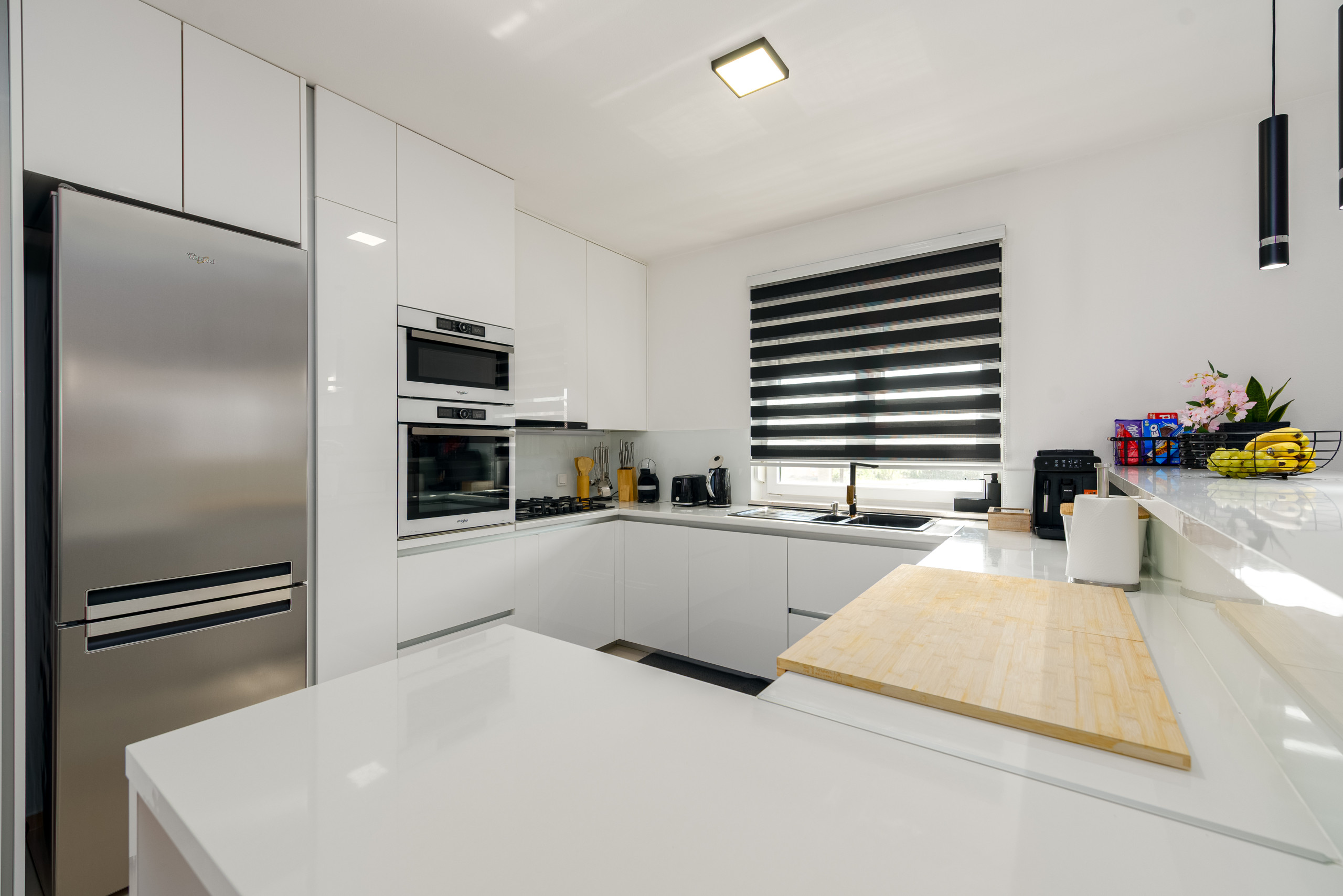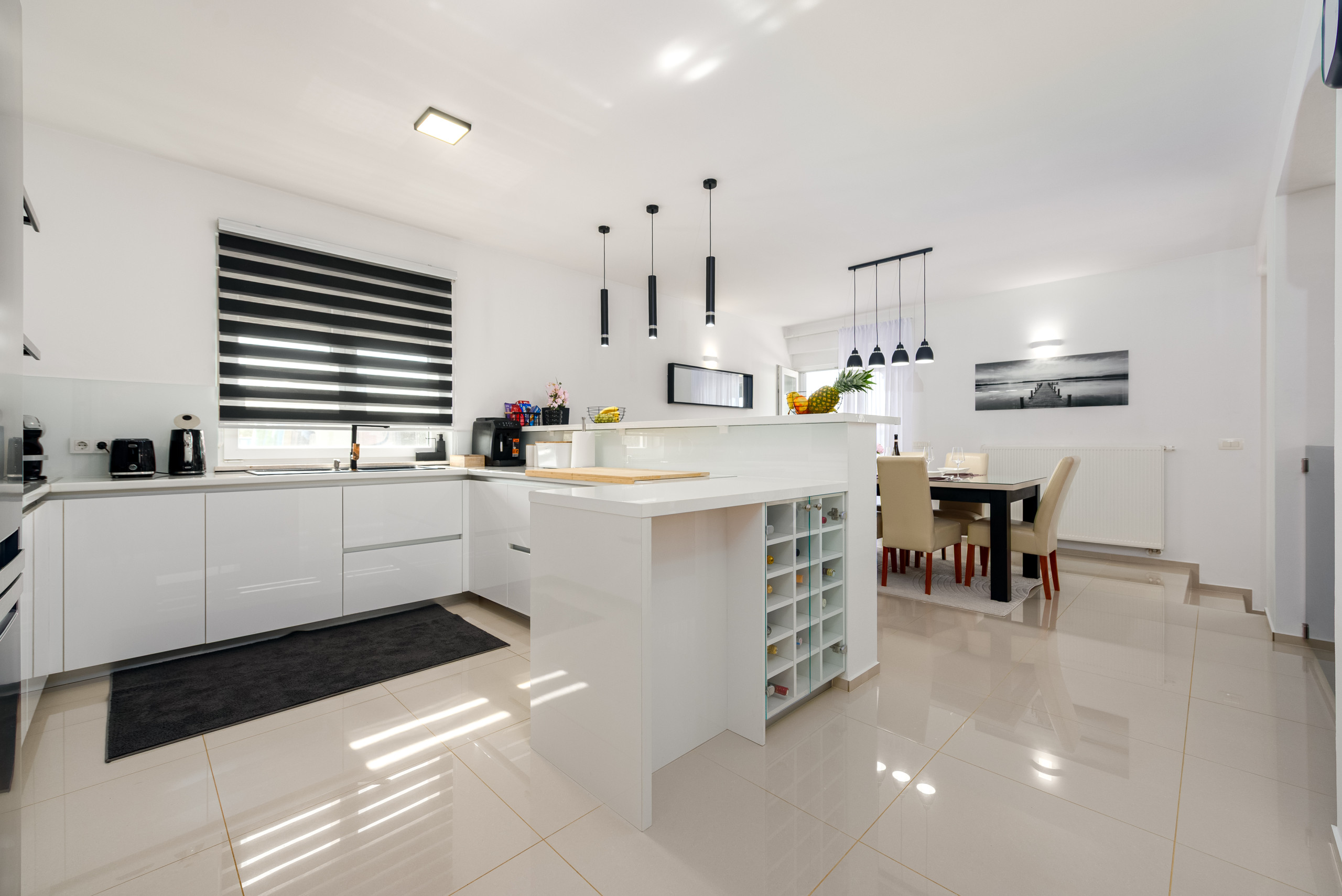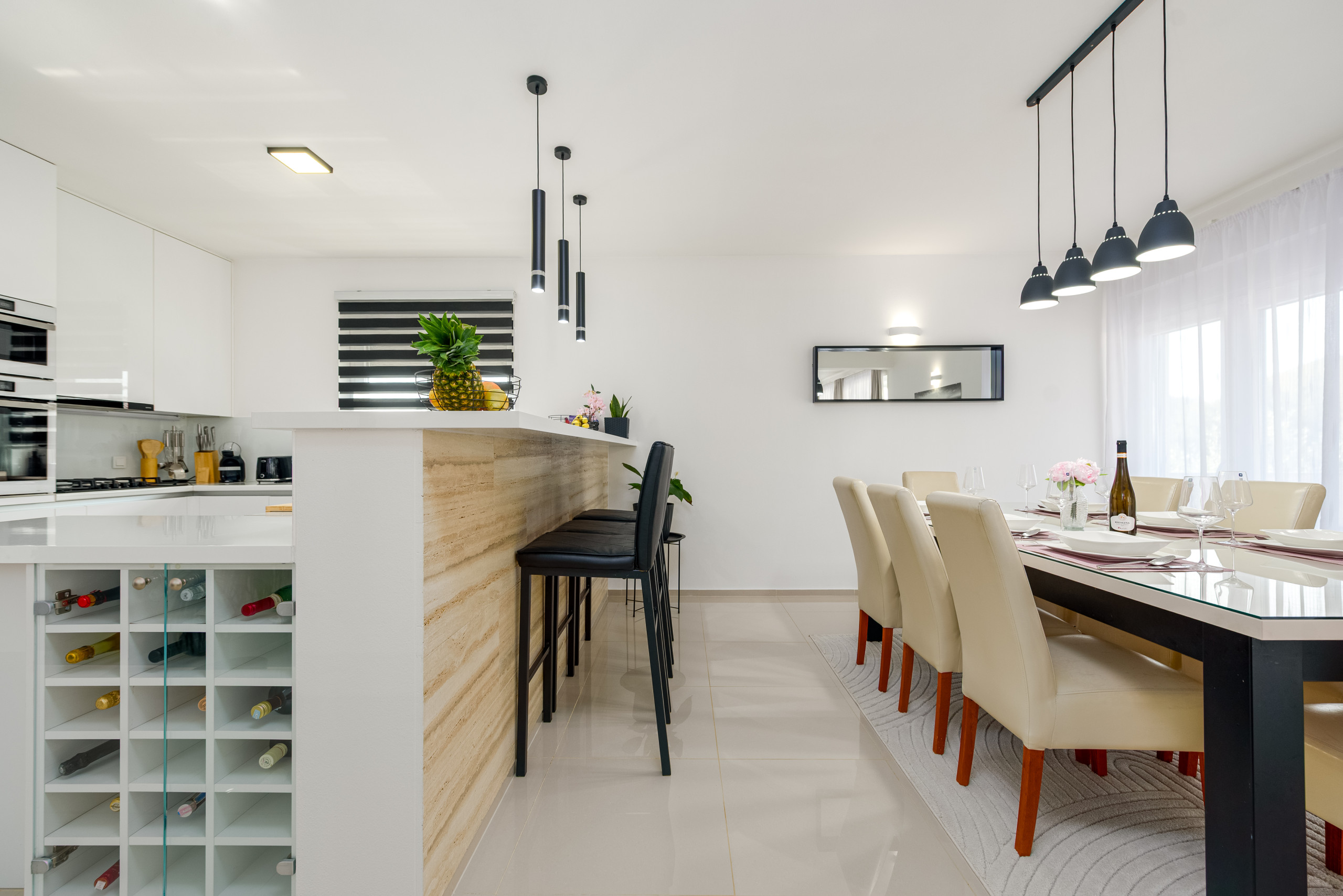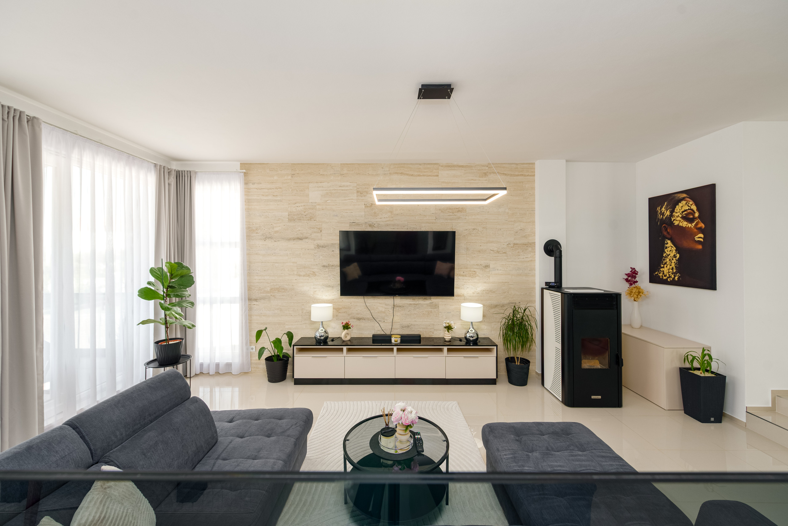 Diese moderne und funktional gestaltete Villa bietet Platz für bis zu sechs Gäste und verfügt über drei komfortable Schlafzimmer, jeweils mit einem Doppelbett. Die Gäste haben Zugang zu zwei voll ausgestatteten Badezimmern sowie zu einer eleganten, modernen Küche, die sich nahtlos in einen offenen Wohnbereich mit einem geräumigen und gemütlichen Wohnzimmer einfügt – perfekt zum Entspannen und Geselligkeit.