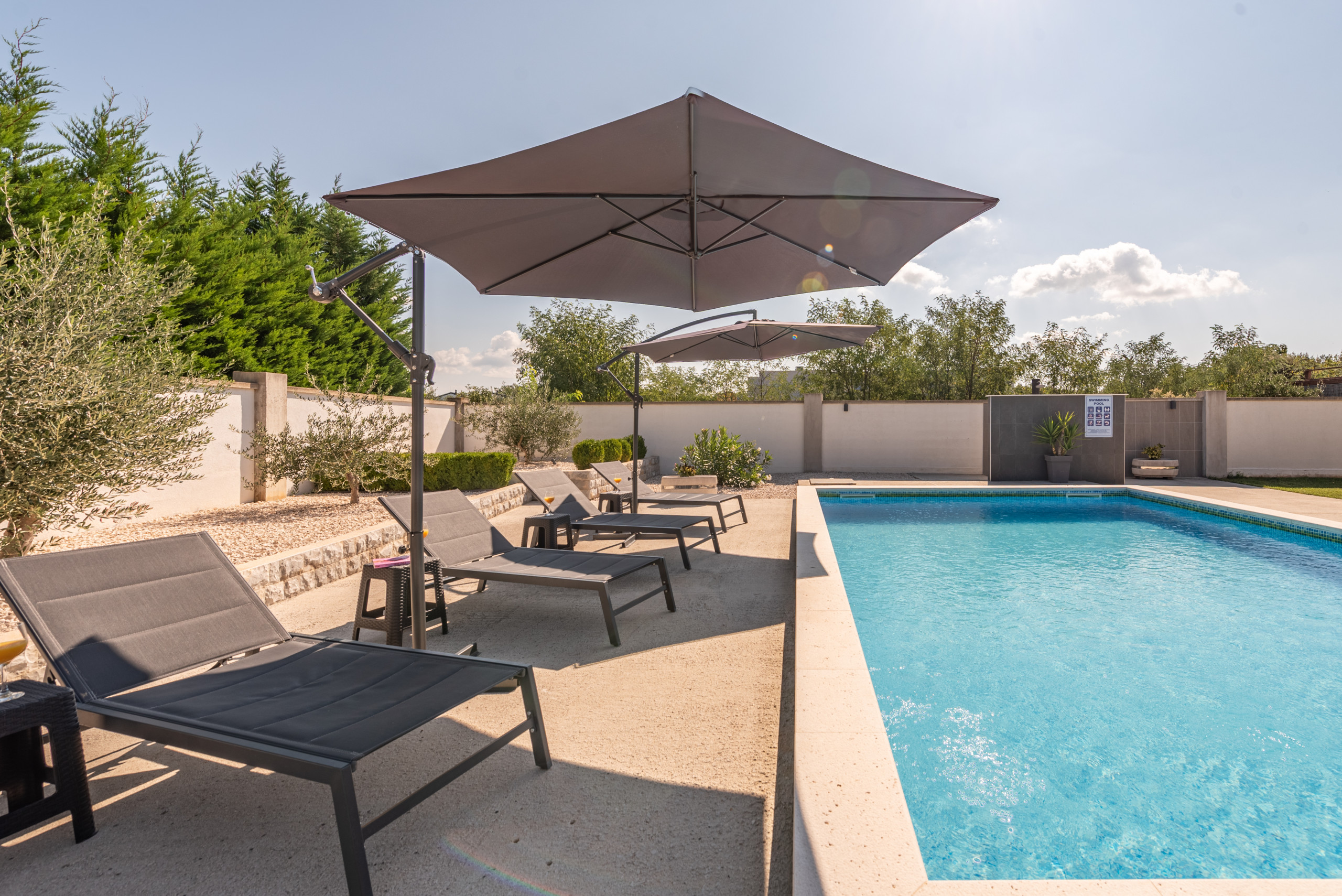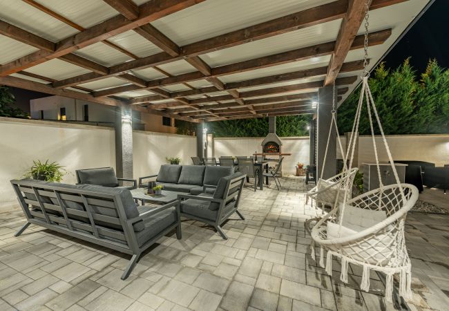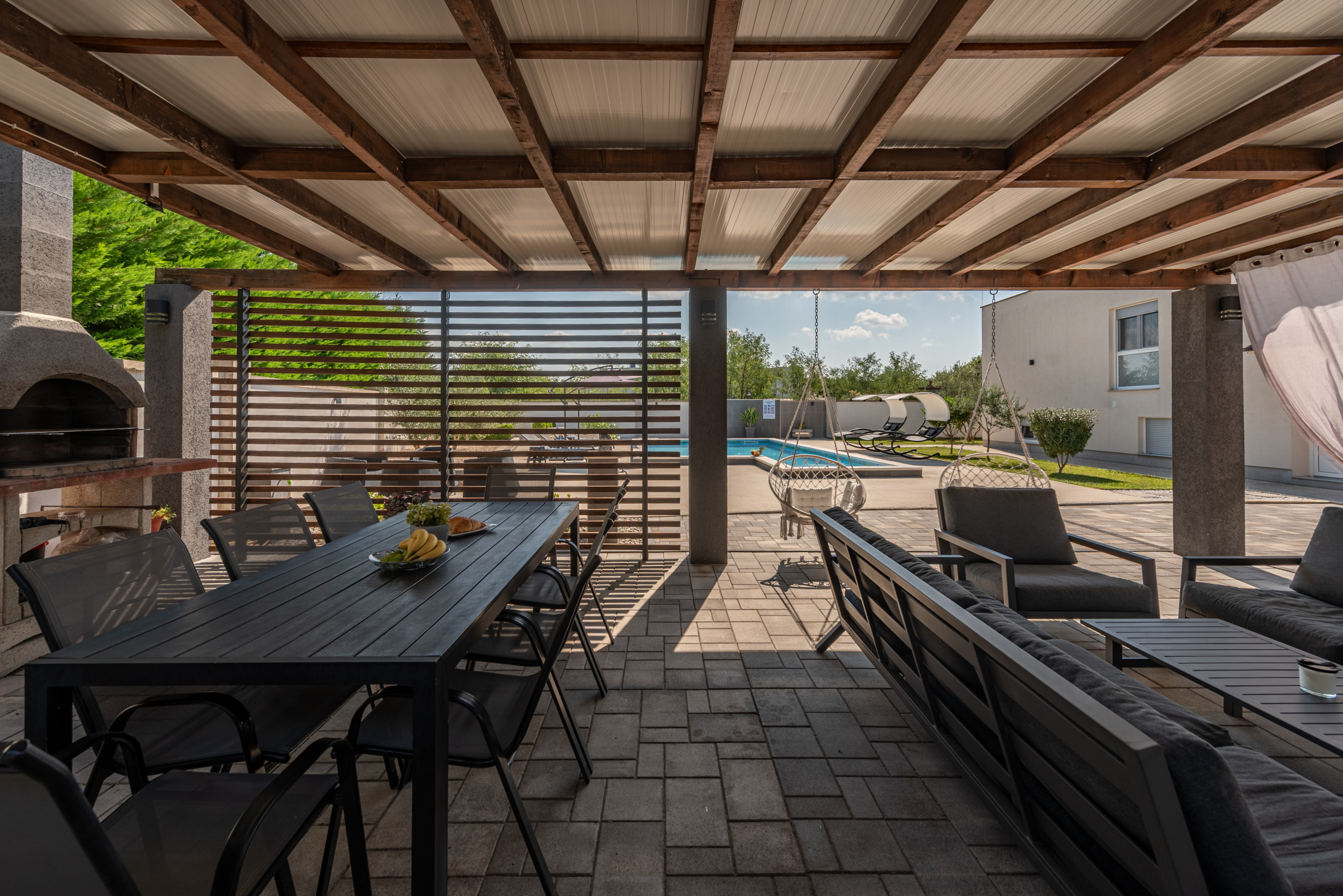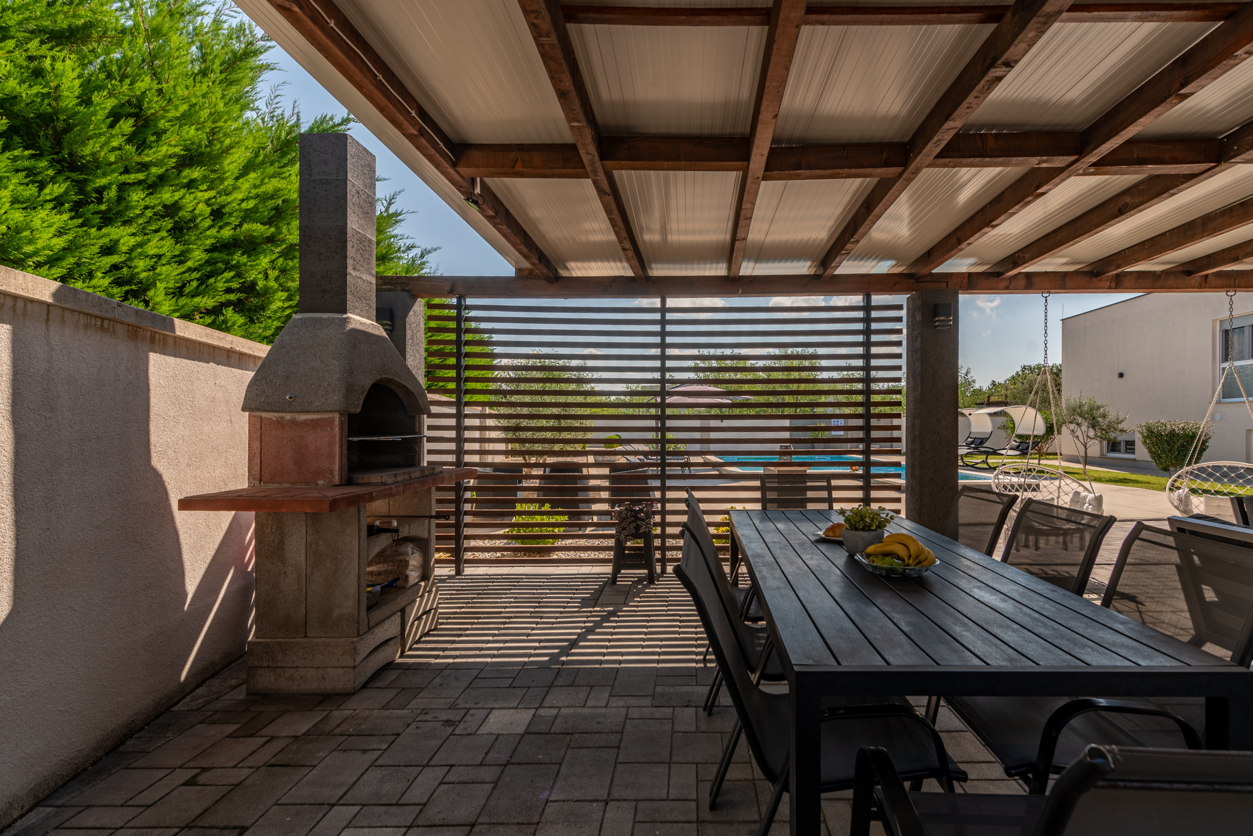 Der Charme der Villa wird durch einen wunderschön gestalteten Garten vervollständigt, der Sie einlädt, Zeit im Freien zu verbringen. Hier finden Sie einen großen Swimmingpool, umgeben von Sonnenliegen, perfekt zum Abkühlen an heißen Sommertagen. Neben dem Pool befindet sich ein gemütlicher Sitzbereich im Freien und eine Essecke mit Tisch und Stühlen, ideal zum Genießen von Mahlzeiten im Freien. Für Grillliebhaber gibt es auch einen eingebauten Außenkamin/Grill – perfekt zum Zubereiten Ihrer Lieblingsgerichte in entspannter Atmosphäre, während Kinder frei im Garten oder Pool spielen.