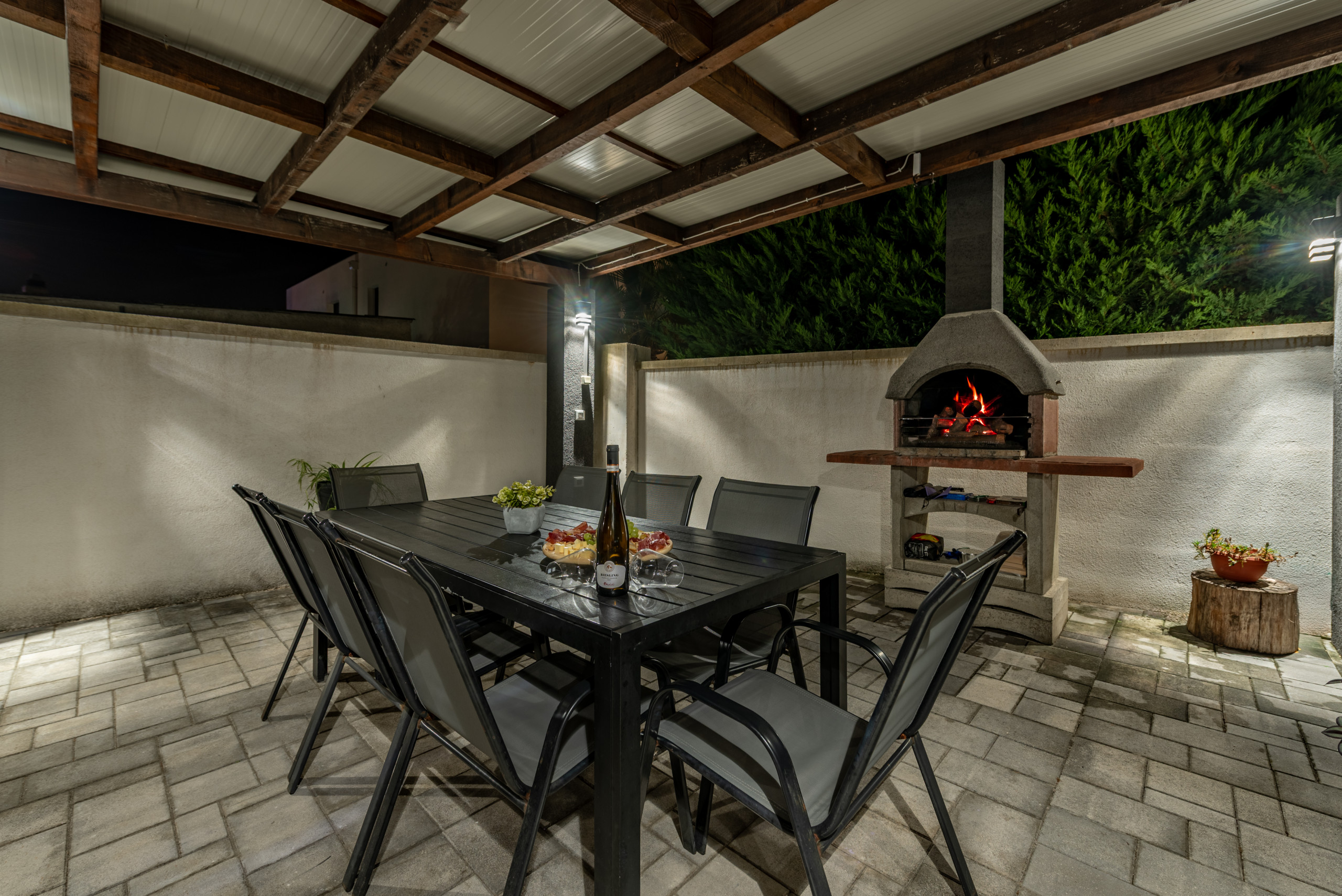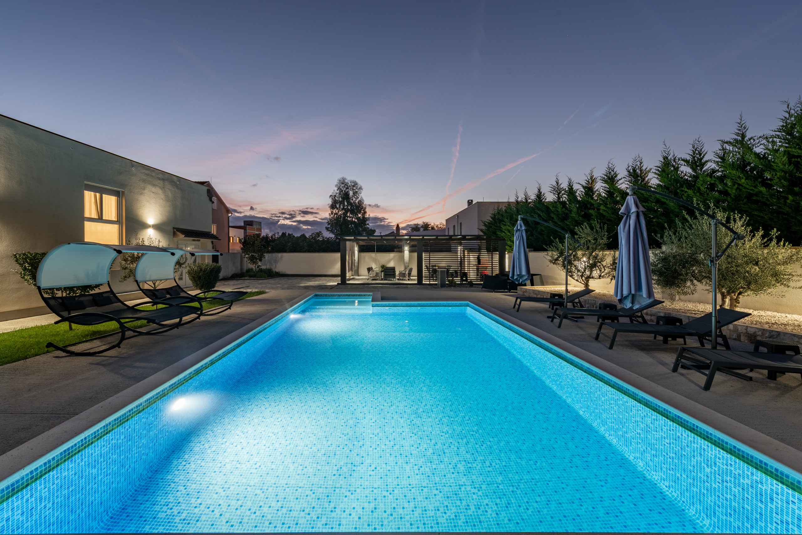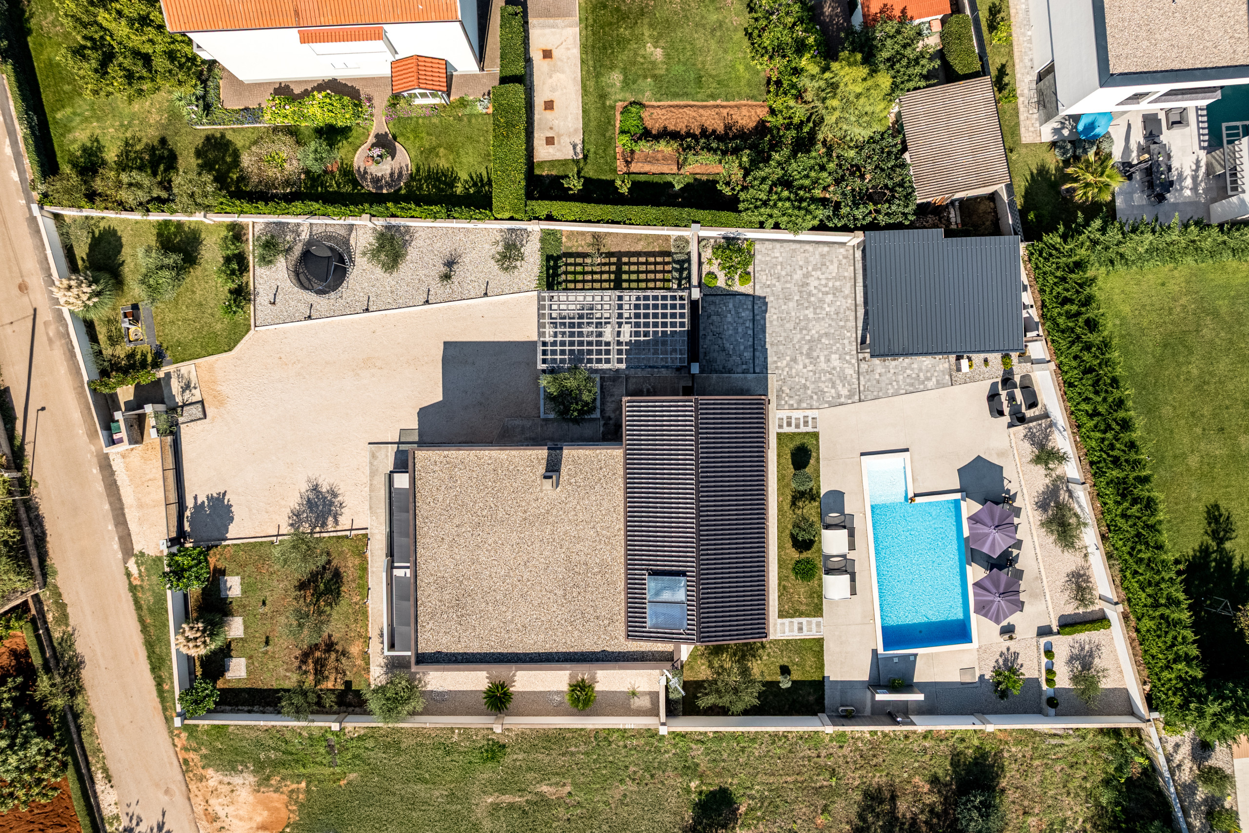 Der Charme der Villa wird durch einen wunderschön gestalteten Garten vervollständigt, der Sie einlädt, Zeit im Freien zu verbringen. Hier finden Sie einen großen Swimmingpool, umgeben von Sonnenliegen, perfekt zum Abkühlen an heißen Sommertagen. Neben dem Pool befindet sich ein gemütlicher Sitzbereich im Freien und eine Essecke mit Tisch und Stühlen, ideal zum Genießen von Mahlzeiten im Freien. Für Grillliebhaber gibt es auch einen eingebauten Außenkamin/Grill – perfekt zum Zubereiten Ihrer Lieblingsgerichte in entspannter Atmosphäre, während Kinder frei im Garten oder Pool spielen.