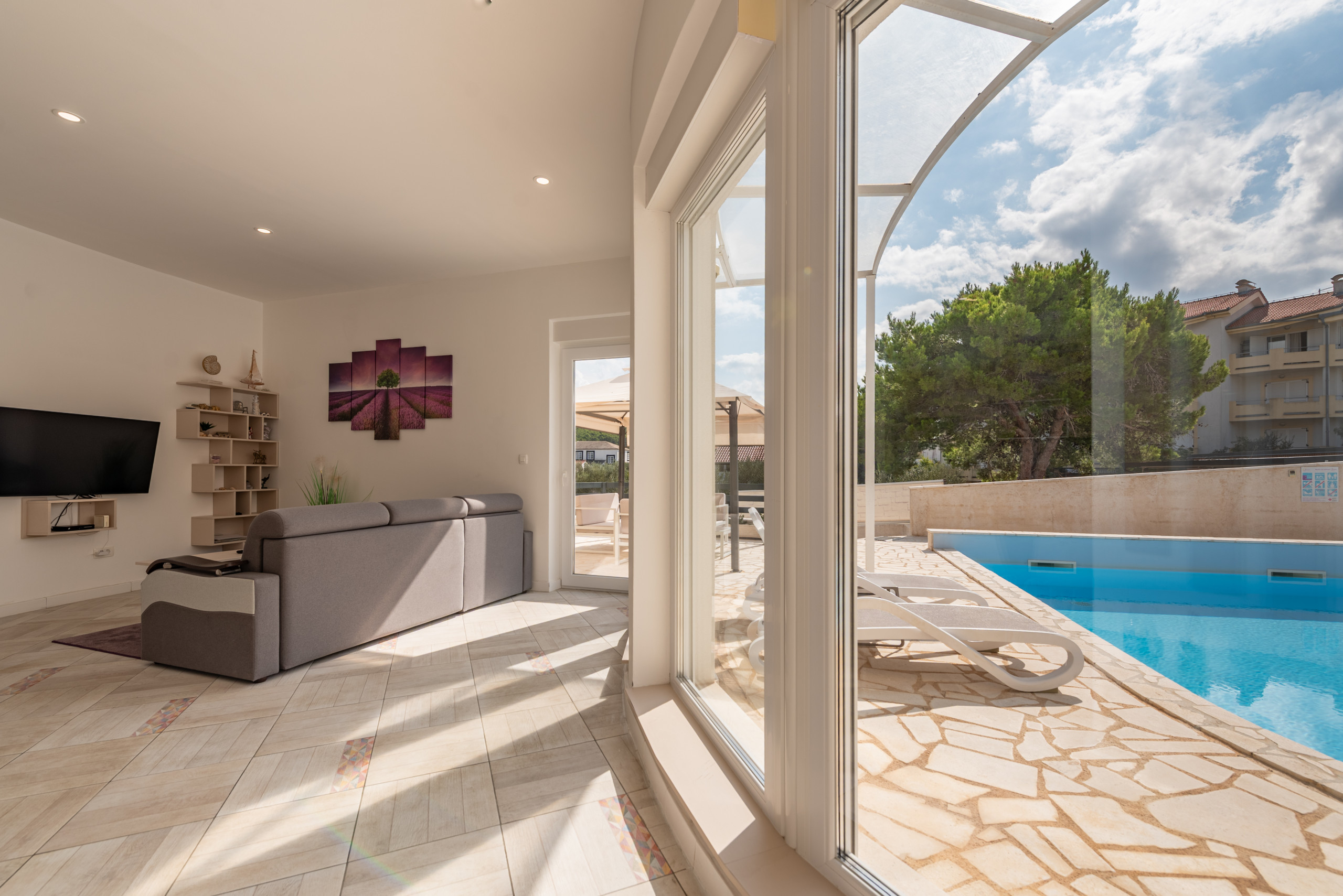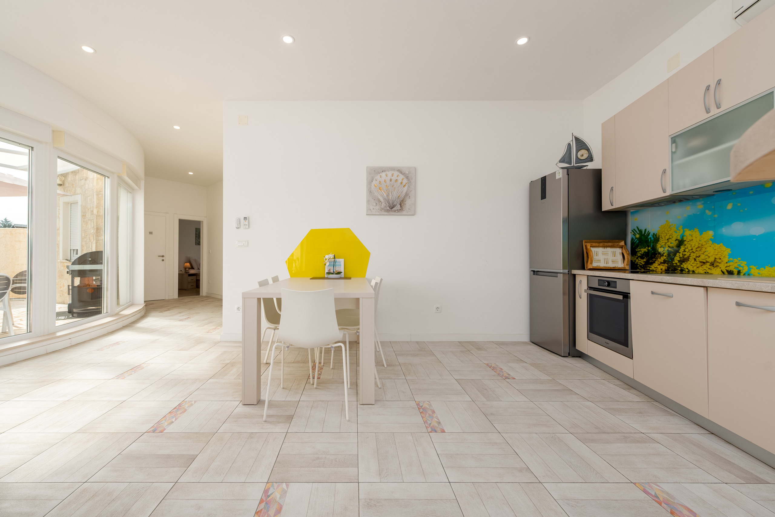 Das Innere der Villa ist in zwei separate Bereiche unterteilt, mit einem Pool als zentralem Element. Das geräumige, offen gestaltete Wohnzimmer mit Küche schafft einen angenehmen Ort für geselliges Beisammensein, während die vier Schlafzimmer maximalen Komfort bieten, jedes mit einem modern ausgestatteten Badezimmer. Beide Bereiche der Villa verfügen über eine Küche mit Essbereich und Wohnzimmer sowie über zwei en-suite Schlafzimmer. Ein Teil der Villa ist speziell für Menschen mit Behinderungen angepasst und ermöglicht einen barrierefreien Zugang für Rollstuhlfahrer. Alle Räume sind klimatisiert, und in den Badezimmern sorgt eine Fußbodenheizung für ganzjährigen Komfort. Zwischen den beiden Wohnbereichen befindet sich ein voll ausgestattetes Büro, das auch als Rezeption für die Begrüßung der Gäste dient – ideal für Besucher, die Erholung mit beruflichen Verpflichtungen verbinden möchten.