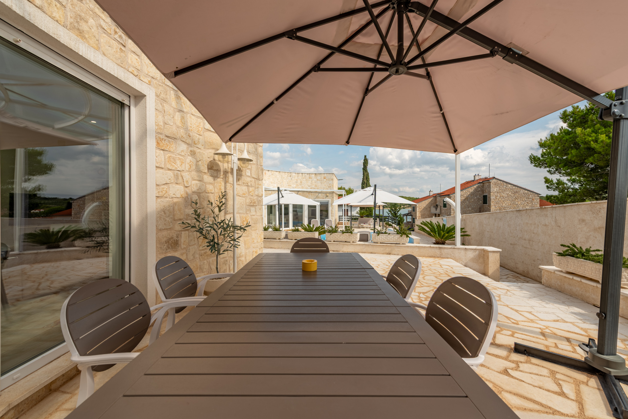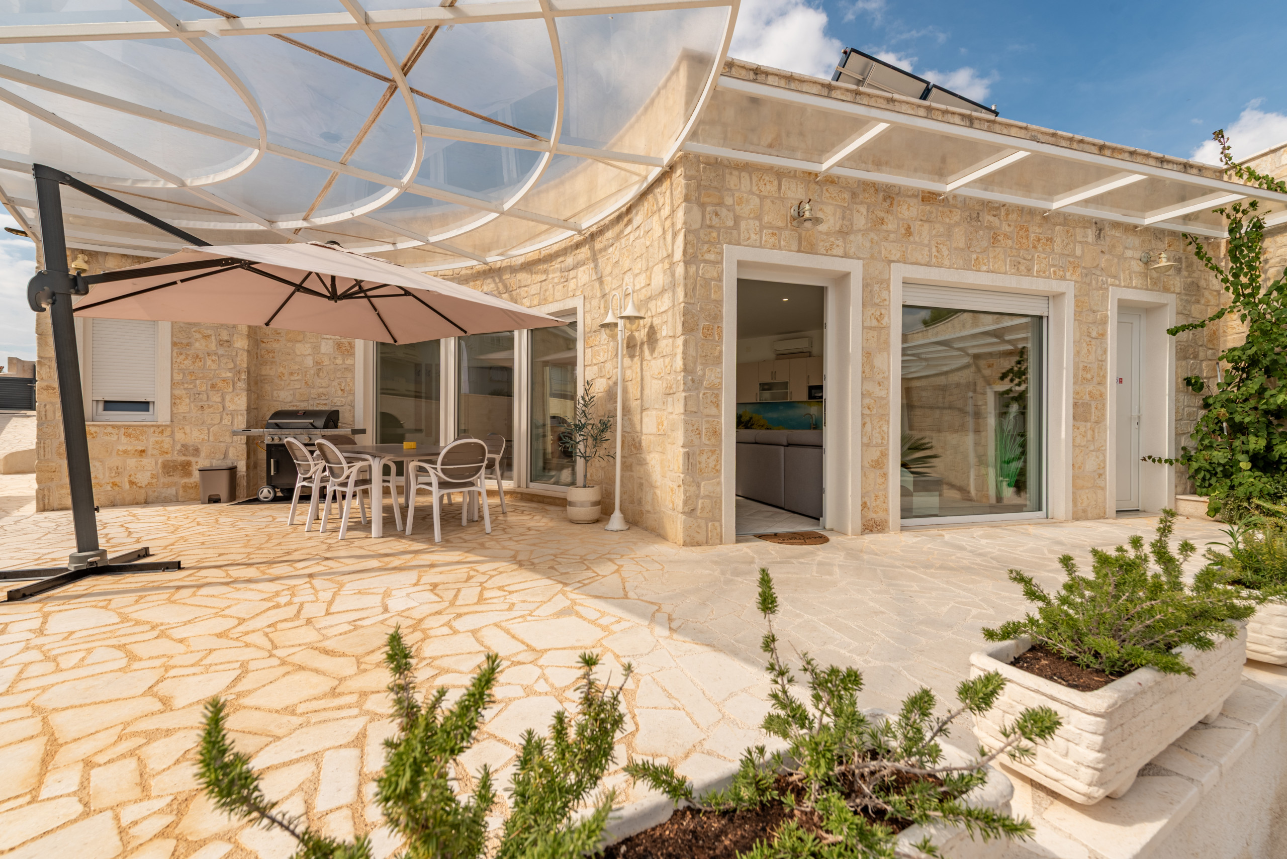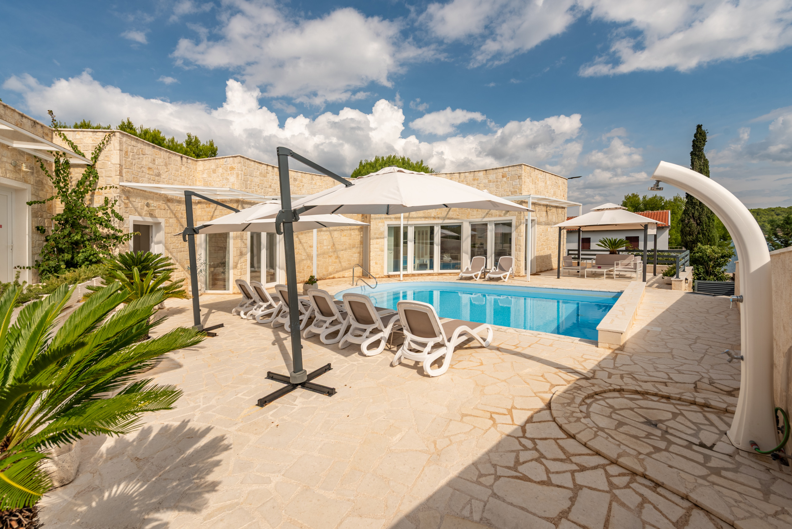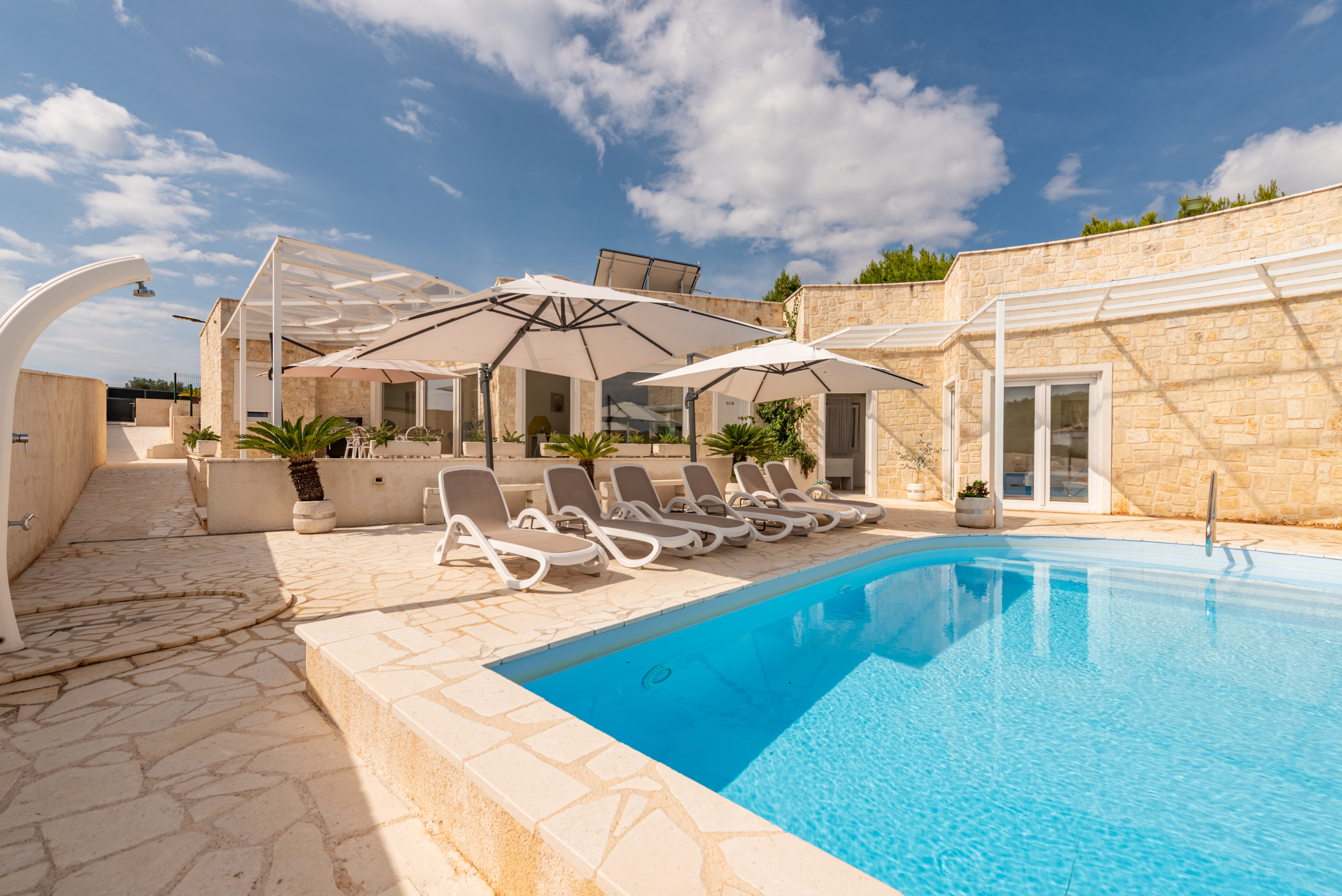 Der Außenbereich der Villa ist ebenso beeindruckend wie das Innere. Das gesamte Anwesen ist eingezäunt, und in dem wunderschönen mediterranen Garten wachsen Rosmarin, Zitronen, Orangen und Oliven, die eine ruhige und angenehme Atmosphäre schaffen. Ein Pool mit Außendusche lädt zur Entspannung ein, während sich im Hof ein Kinderspielplatz mit Rutsche befindet. Für die Erkundung der Insel stehen den Gästen außerdem zwei Fahrräder zur Verfügung.