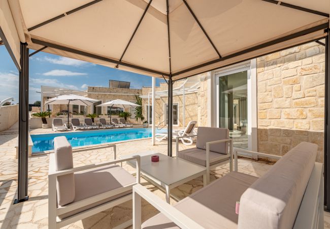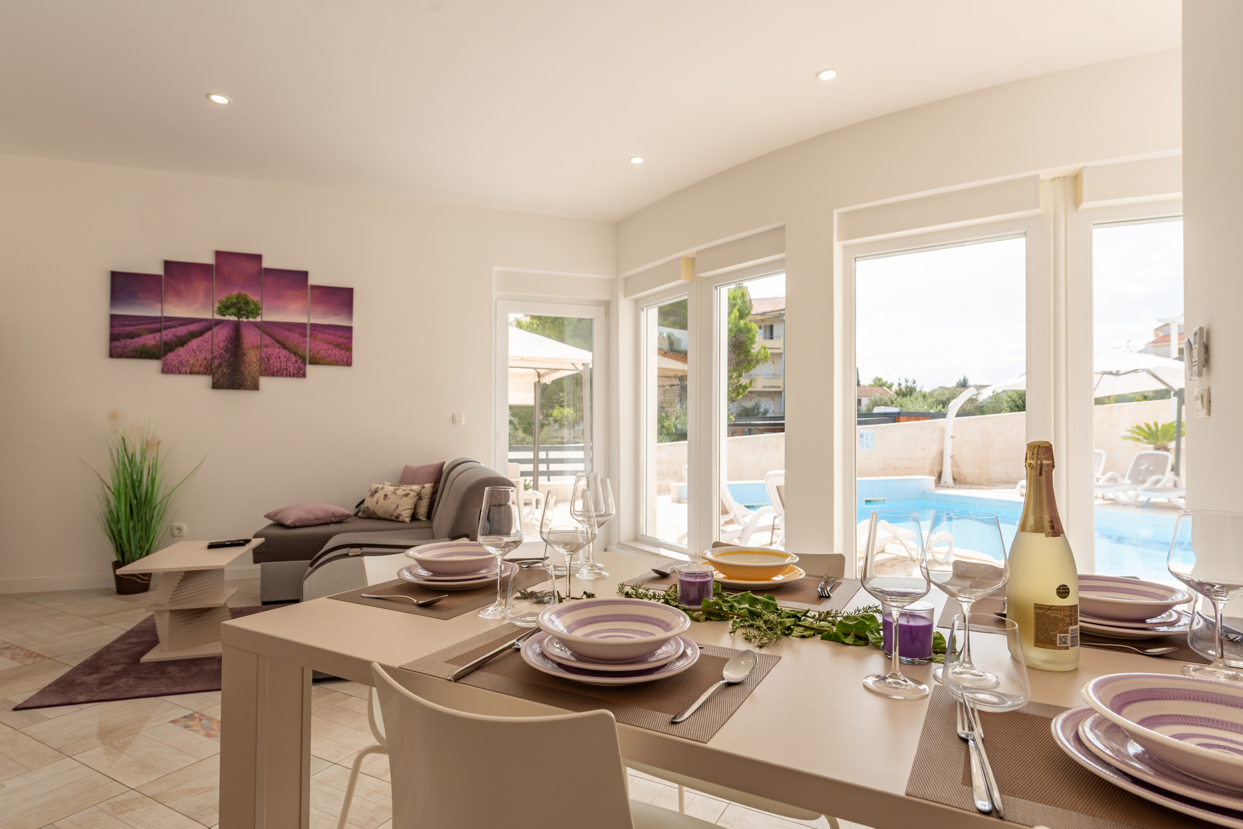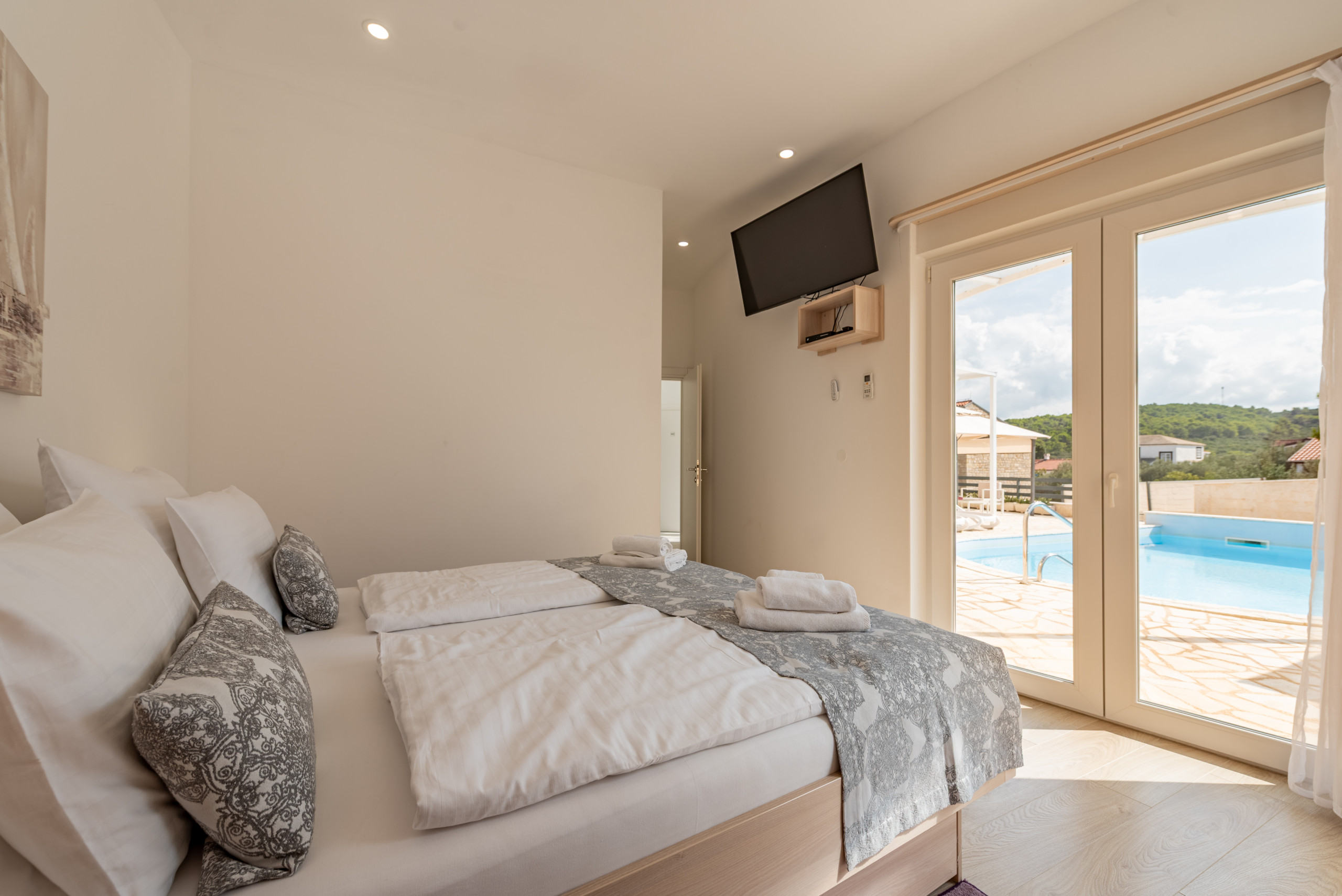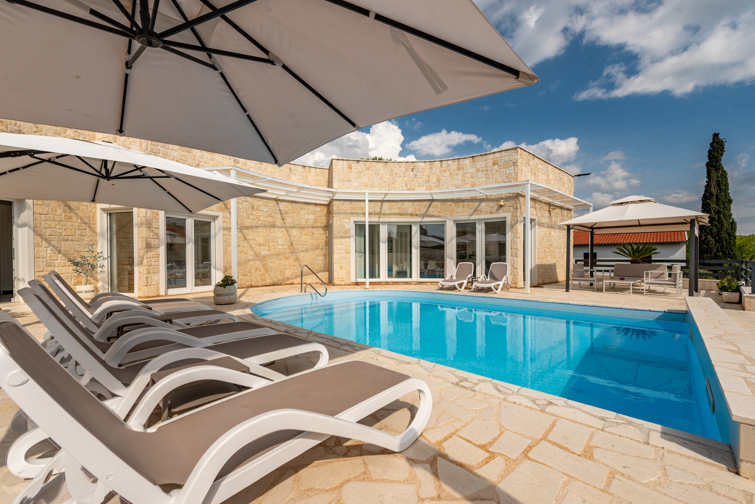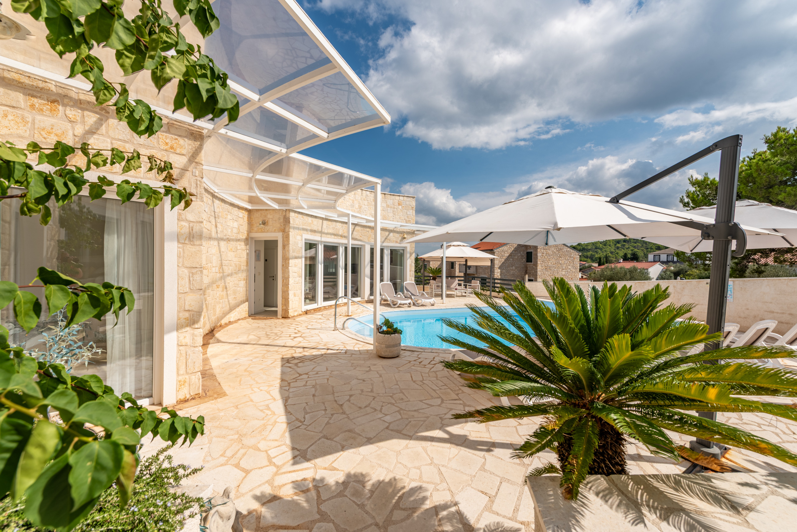 Der Außenbereich der Villa ist ebenso beeindruckend wie das Innere. Das gesamte Anwesen ist eingezäunt, und in dem wunderschönen mediterranen Garten wachsen Rosmarin, Zitronen, Orangen und Oliven, die eine ruhige und angenehme Atmosphäre schaffen. Ein Pool mit Außendusche lädt zur Entspannung ein, während sich im Hof ein Kinderspielplatz mit Rutsche befindet. Für die Erkundung der Insel stehen den Gästen außerdem zwei Fahrräder zur Verfügung.