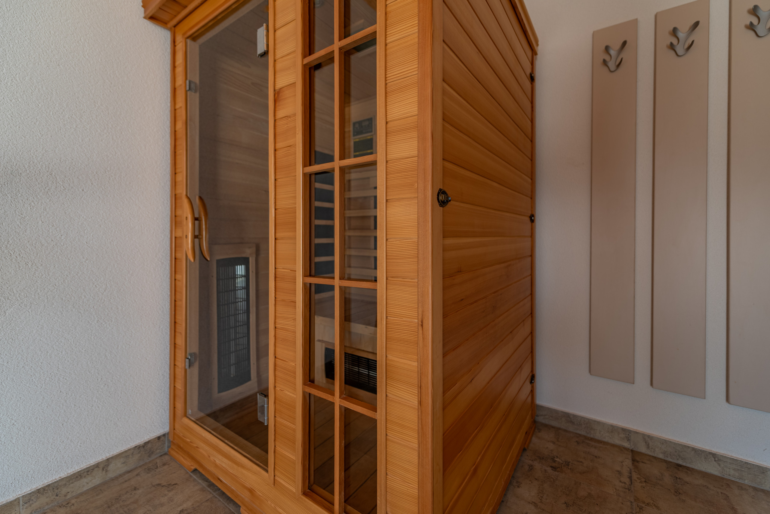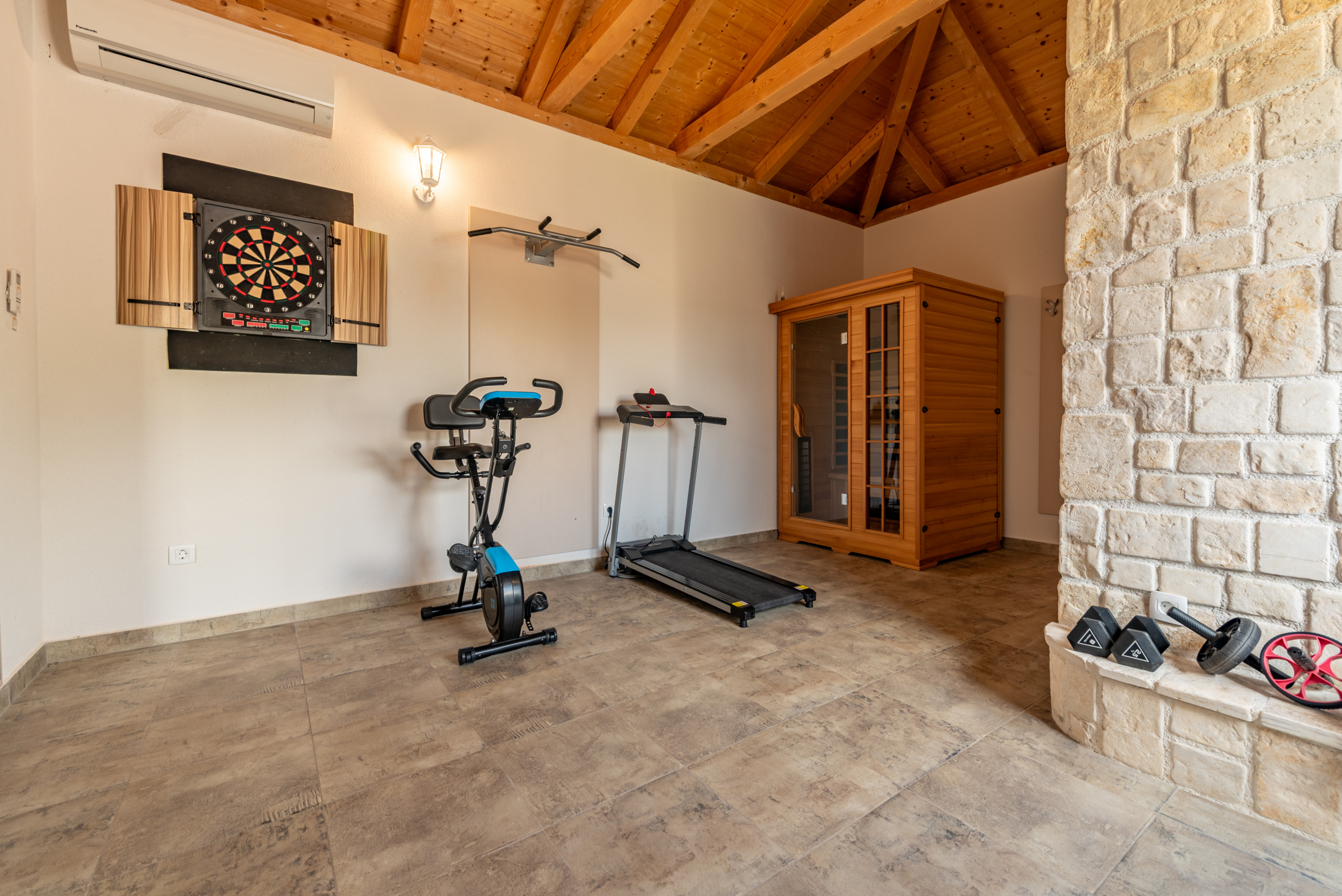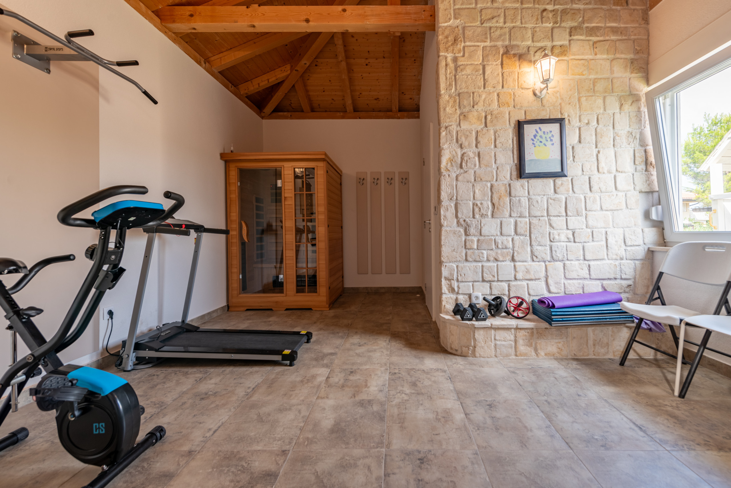 Den Gästen steht ein komplett ausgestatteter Fitnessraum mit Sauna und eigenem Bad zur Verfügung.