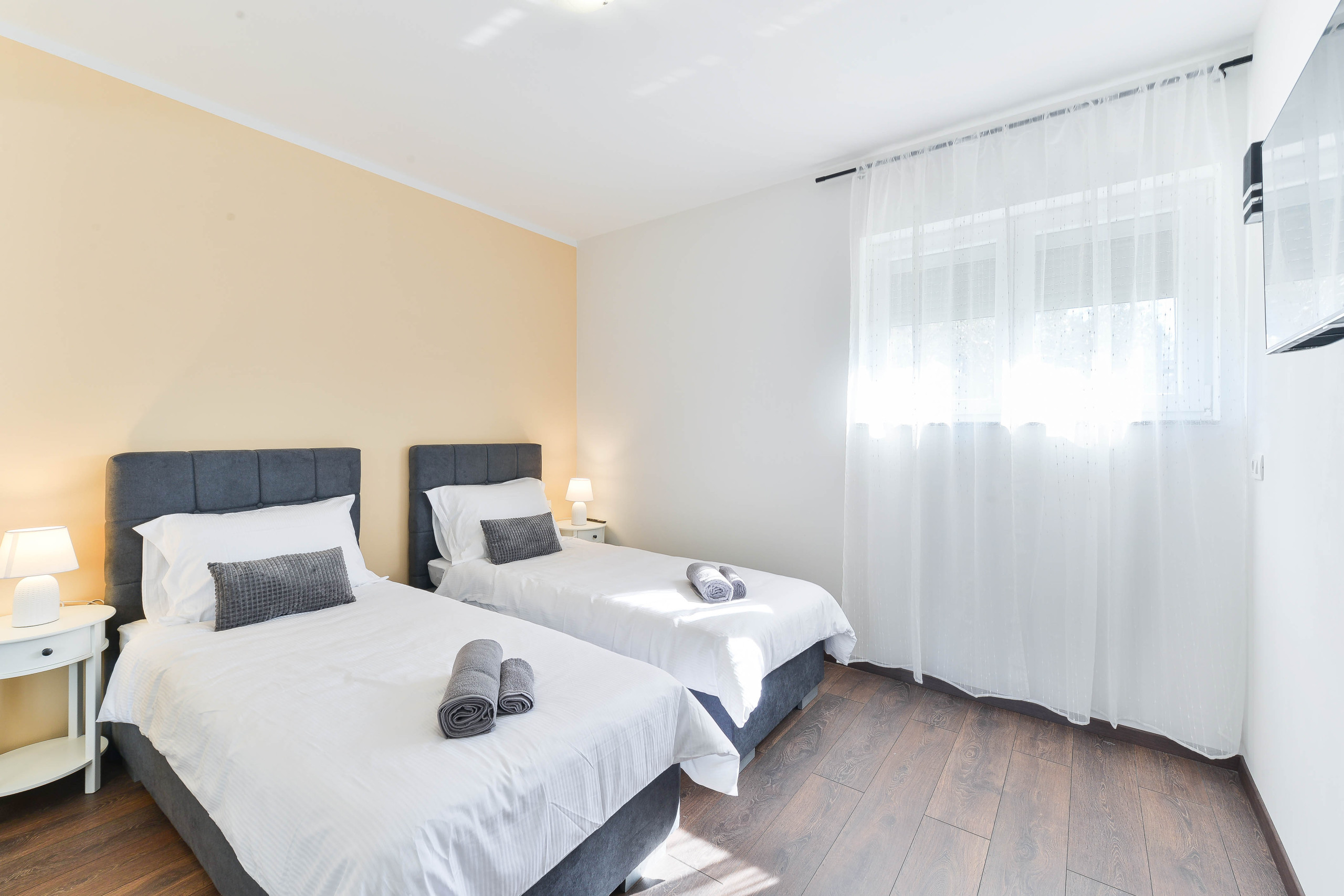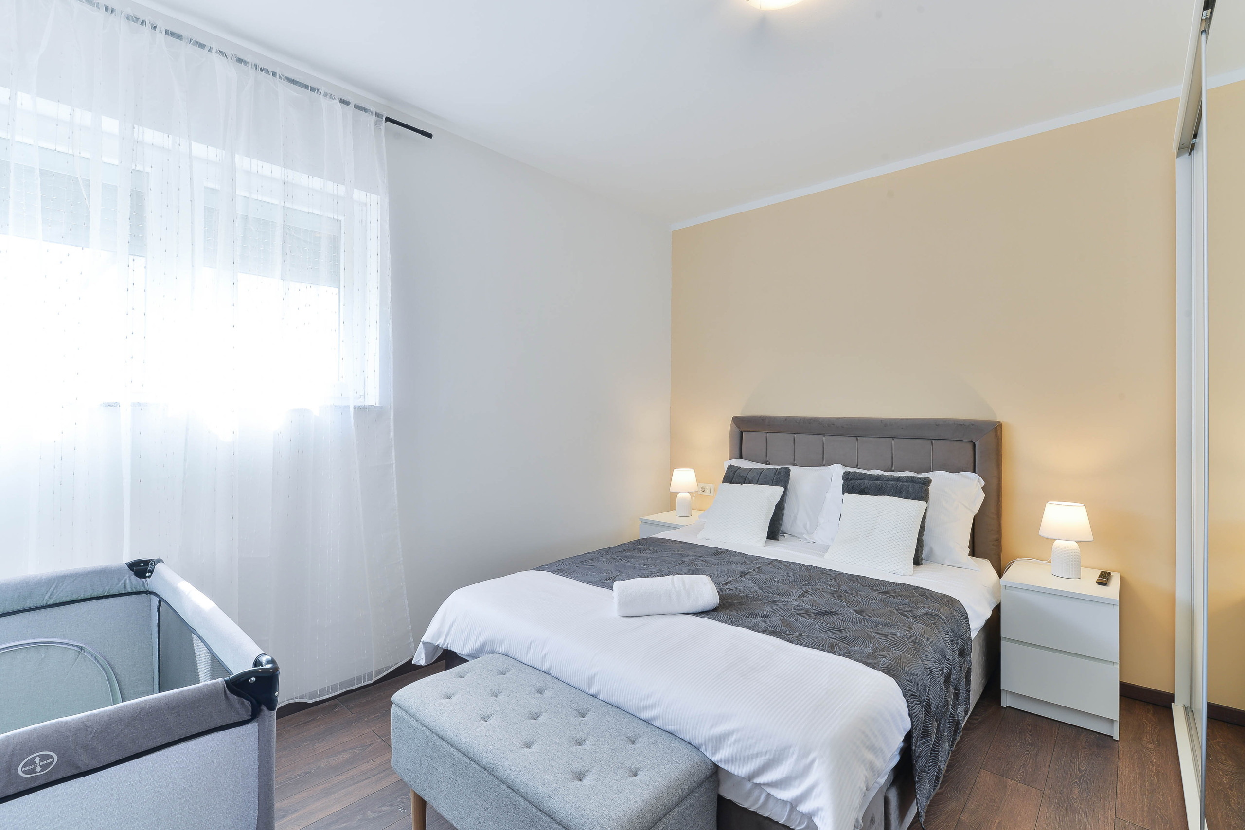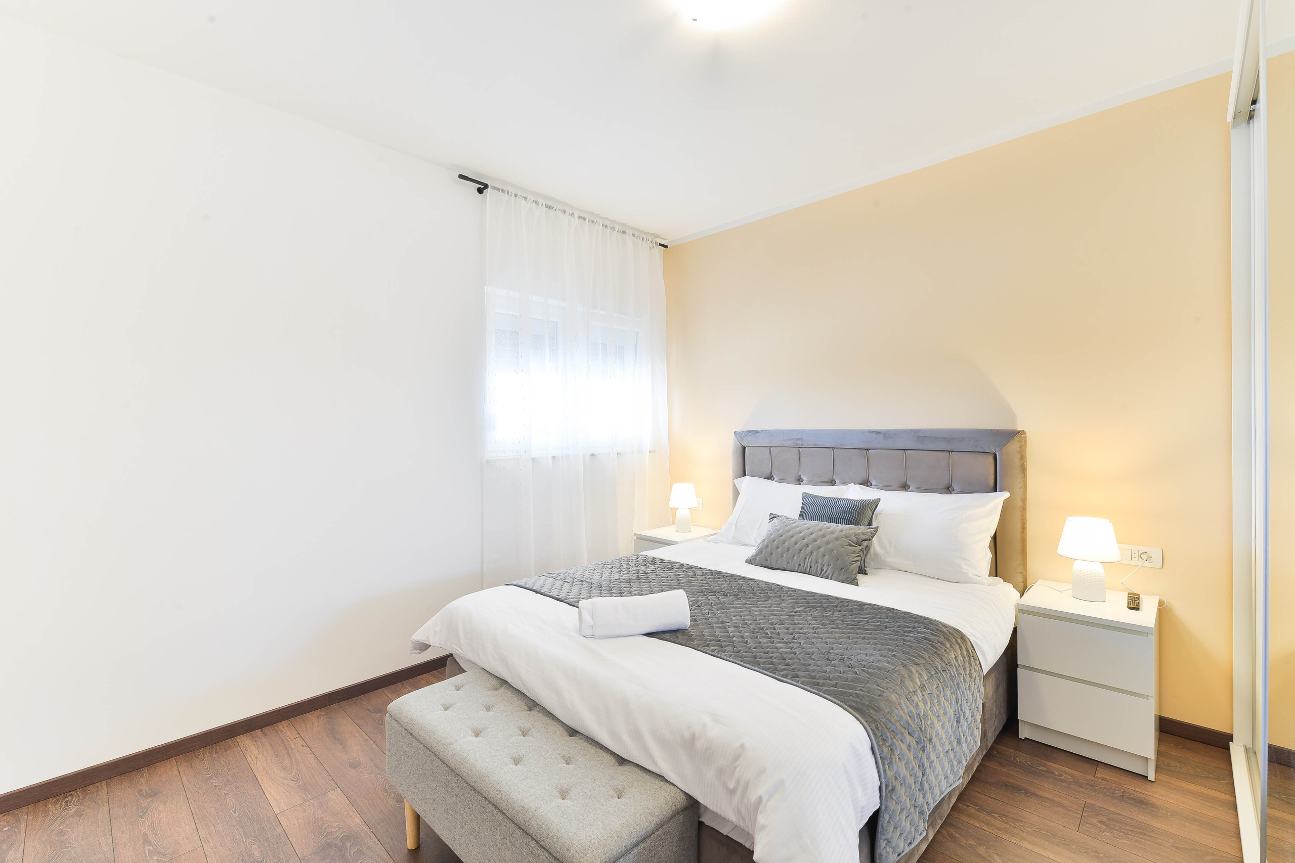An additional sofa bed in the living room allows for accommodation for up to 8 guests in total, along with two modern bathrooms with showers for added comfort.