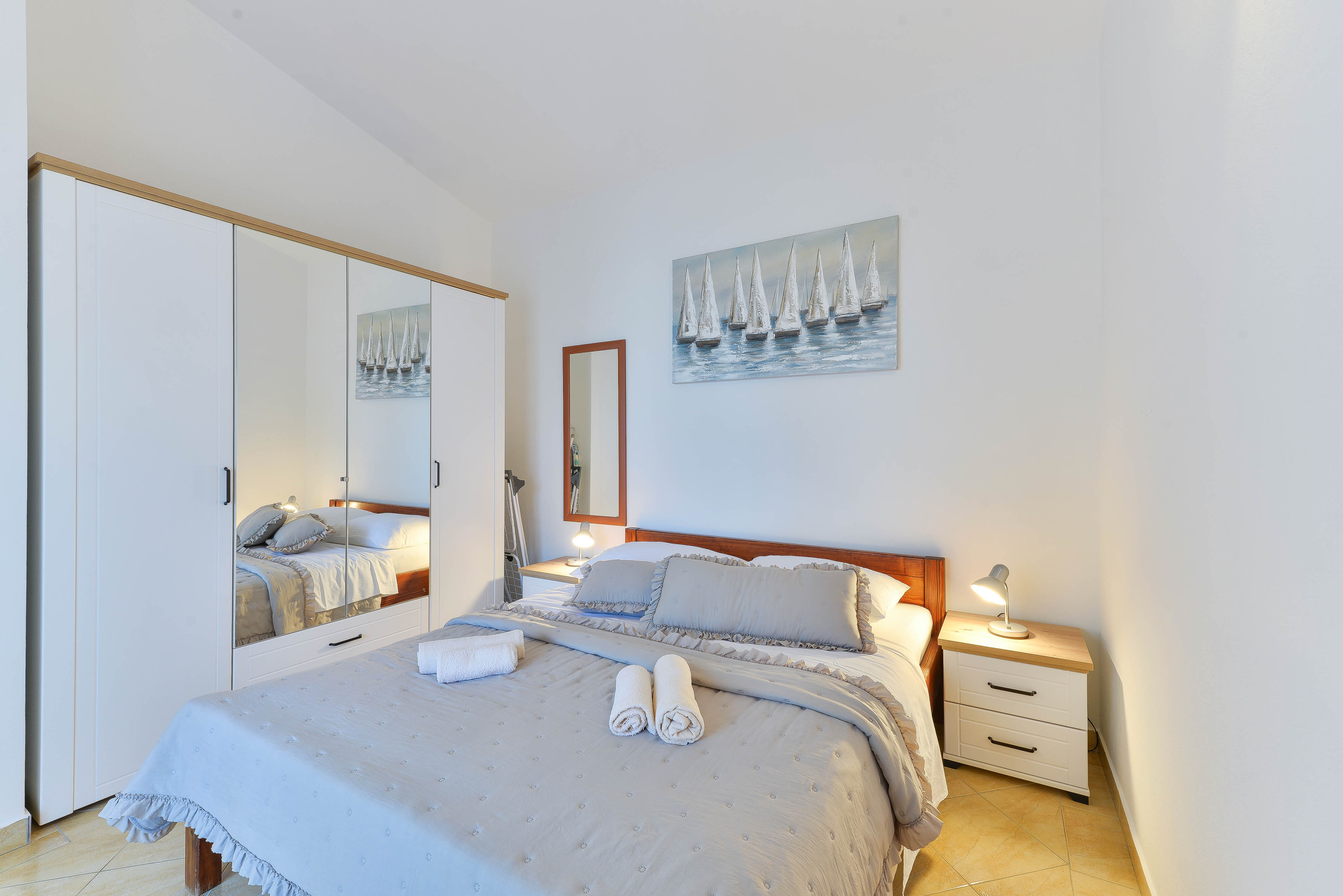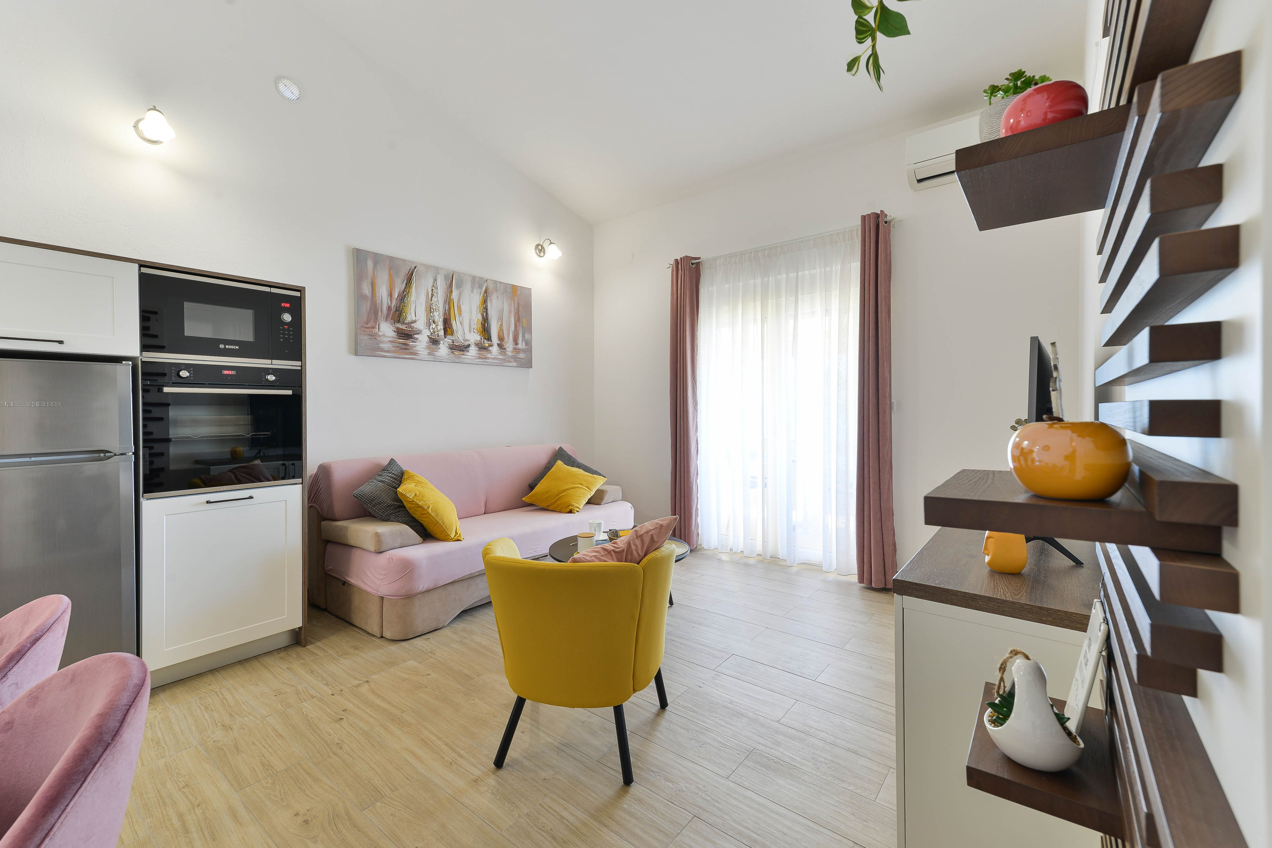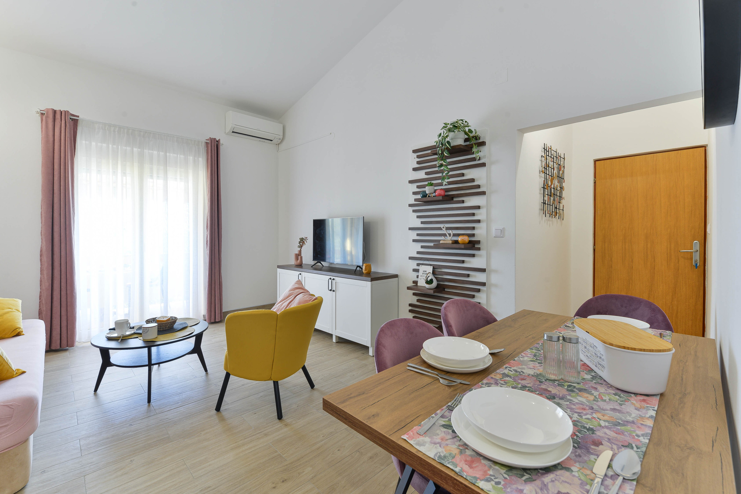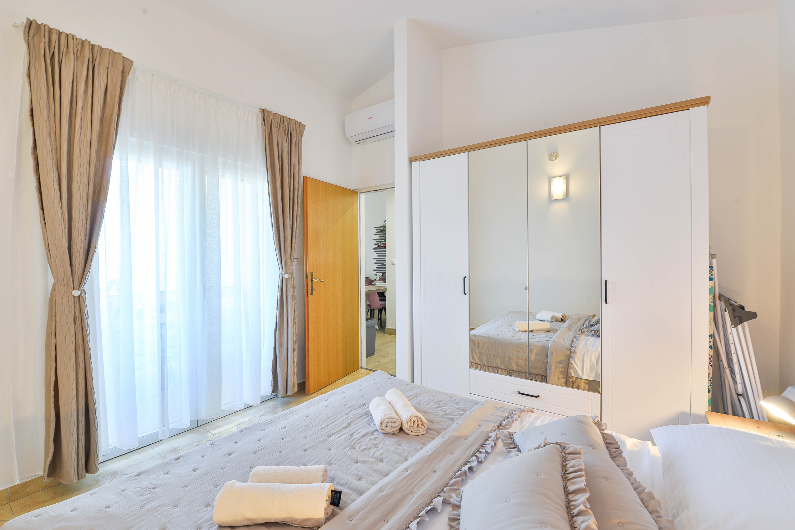 The house with 4 apartments is situated only few meters from the beach on island Vir. The island is connected to the mainland with a bridge. There are restaurants, bars and great beaches on this island. Concerts and happenings are organized during the whole season. The house itself is situated in a nice residential area but the center of the place is easy accessible. Beautiful garden surrounds the house, there is a grill, lounges, outdoor dining area and direct exit from garden to the beach. This apartment is situated in apartment house on the first floor. There are 4 apartments in the house. This apartment accommodates up to 4 guests. It has one bedroom with double bed, one bathroom and additional sofa bed for 2 person in living room.