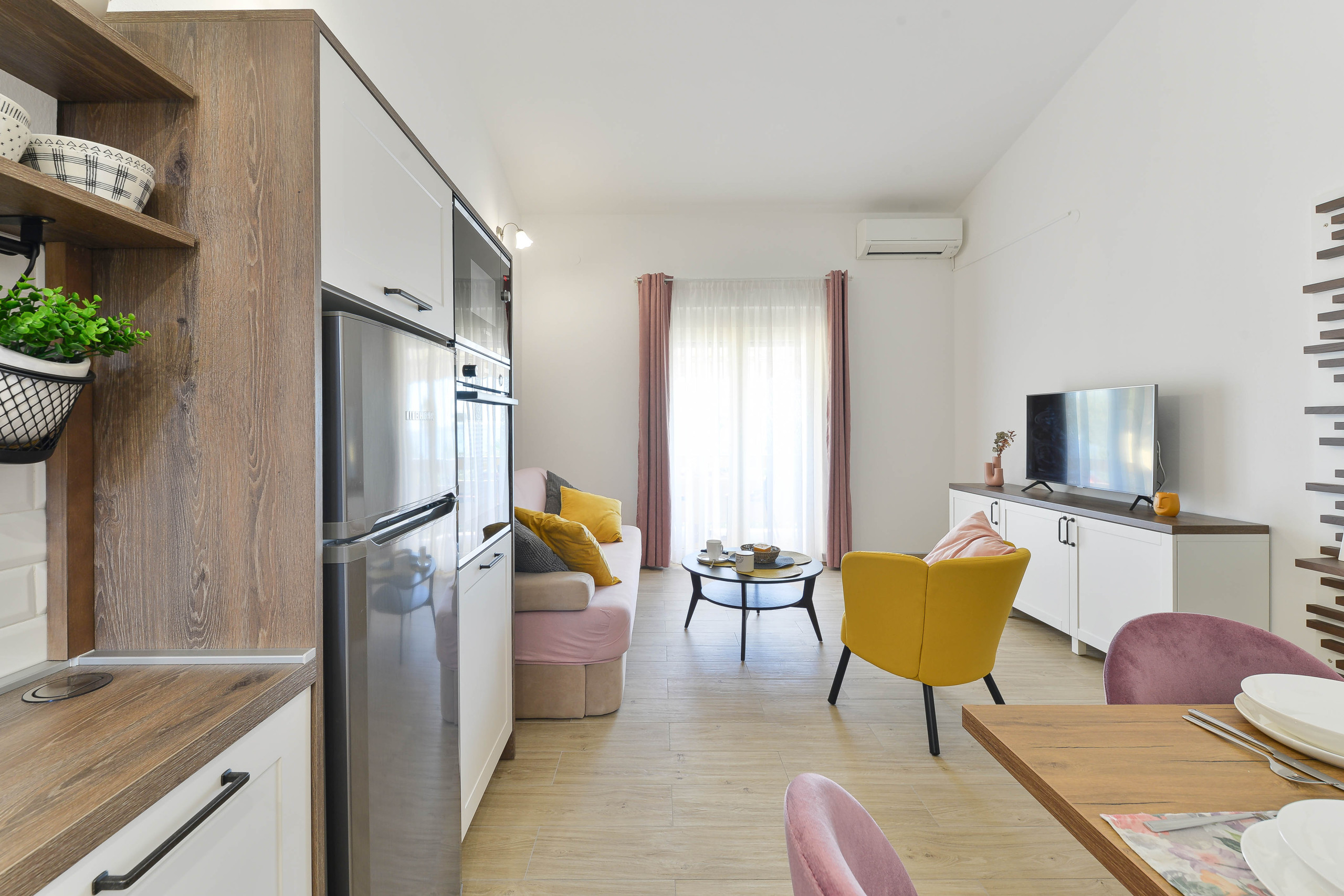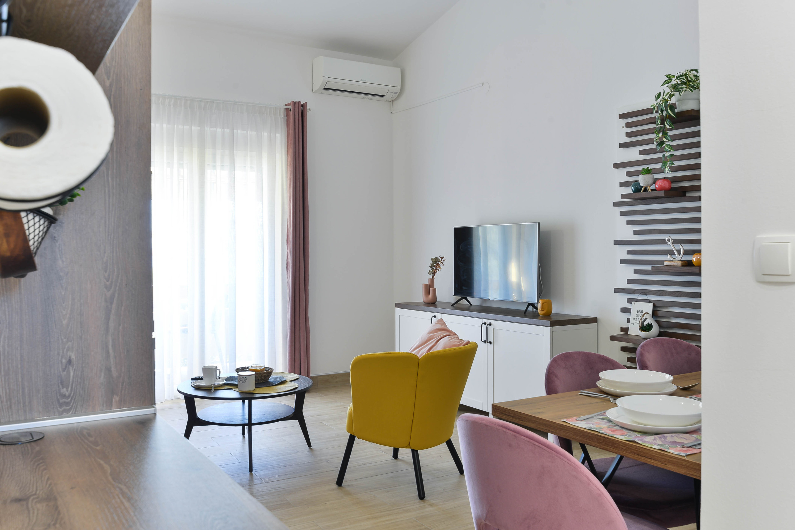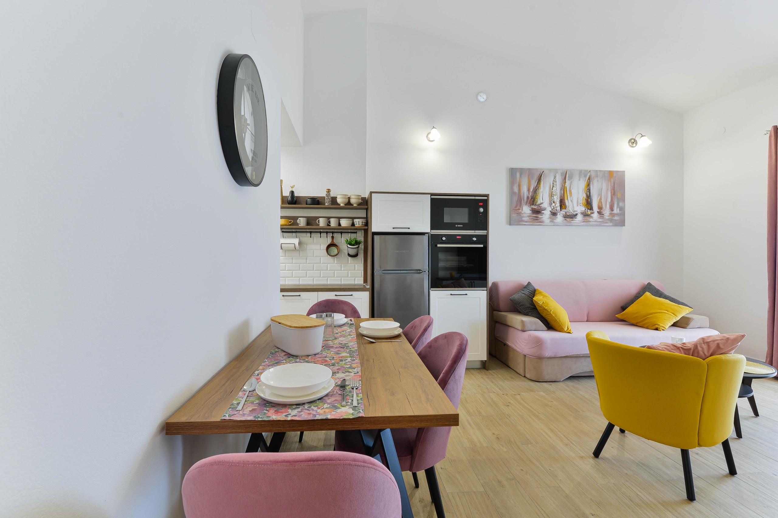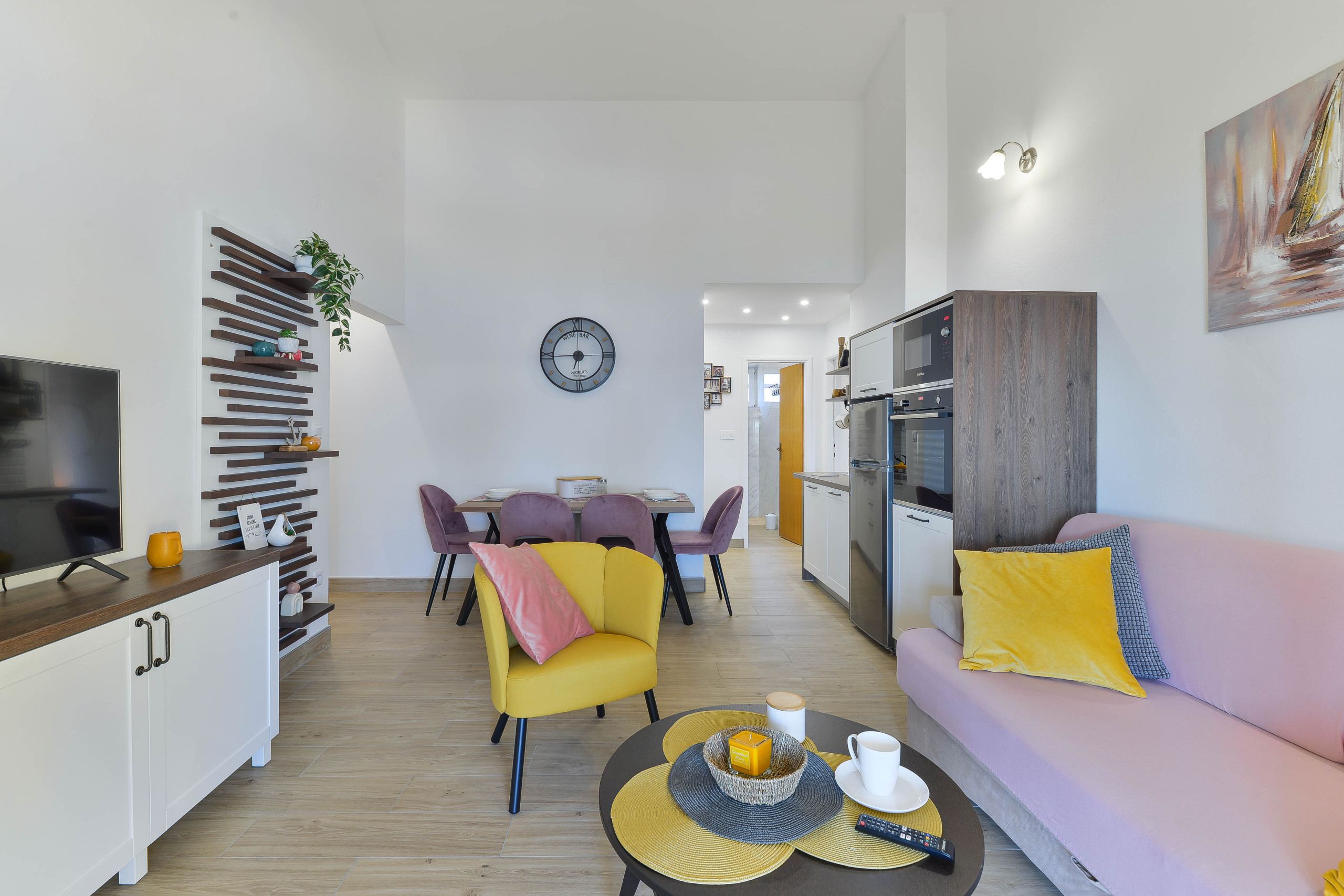 The house with 4 apartments is situated only few meters from the beach on island Vir. The island is connected to the mainland with a bridge. There are restaurants, bars and great beaches on this island. Concerts and happenings are organized during the whole season. The house itself is situated in a nice residential area but the center of the place is easy accessible. Beautiful garden surrounds the house, there is a grill, lounges, outdoor dining area and direct exit from garden to the beach. This apartment is situated in apartment house on the first floor. There are 4 apartments in the house. This apartment accommodates up to 4 guests. It has one bedroom with double bed, one bathroom and additional sofa bed for 2 person in living room.