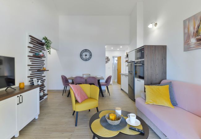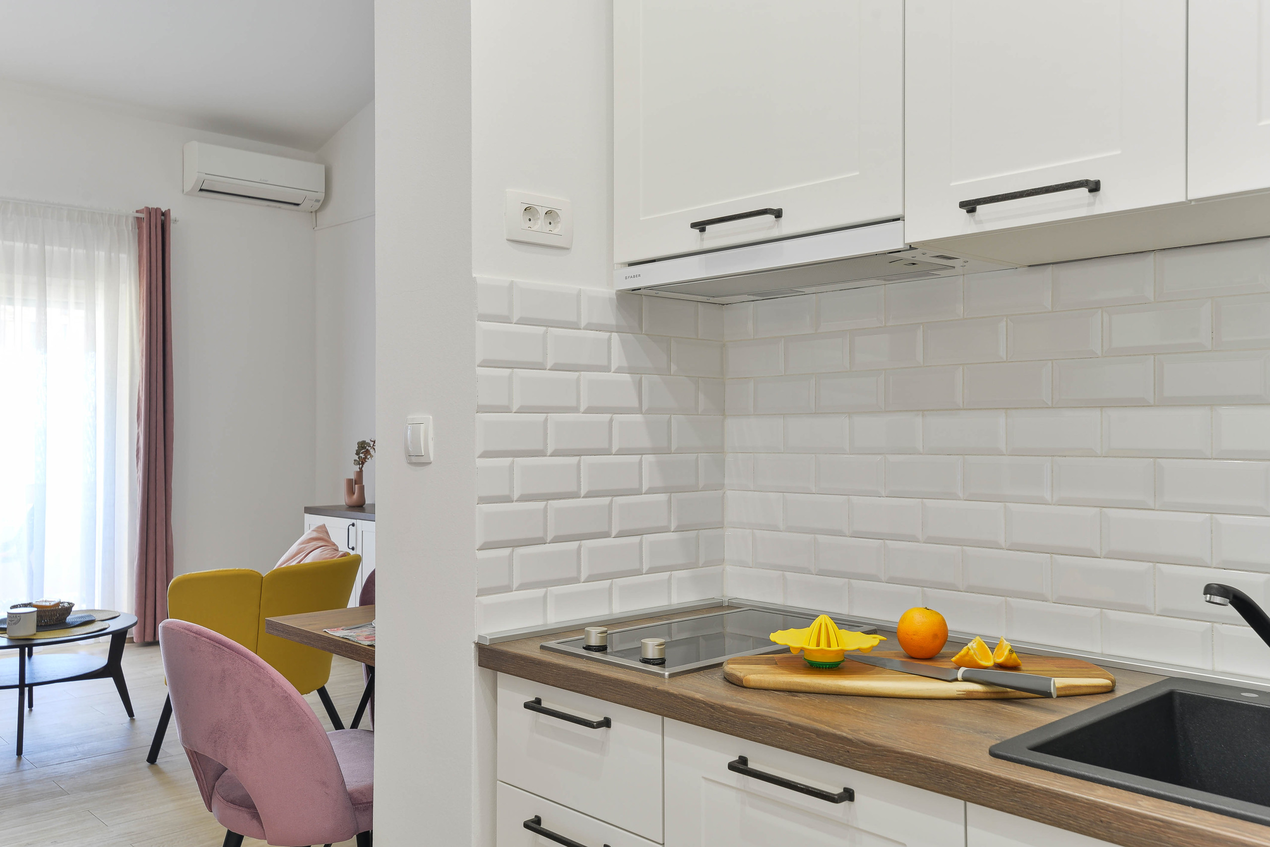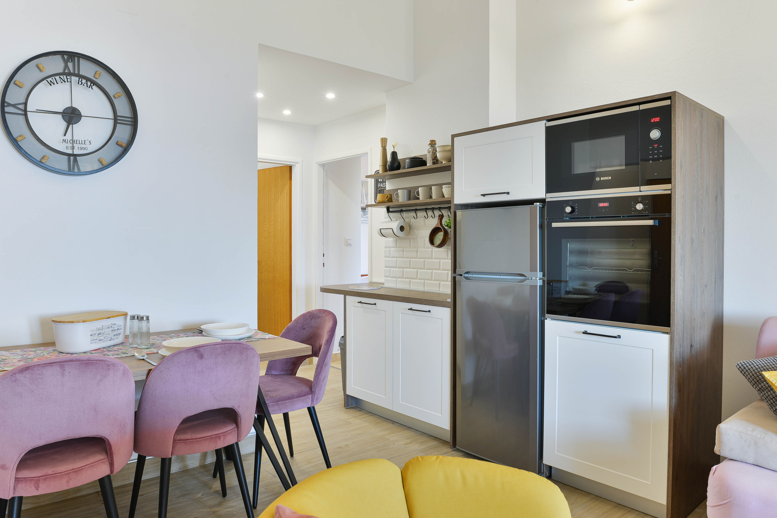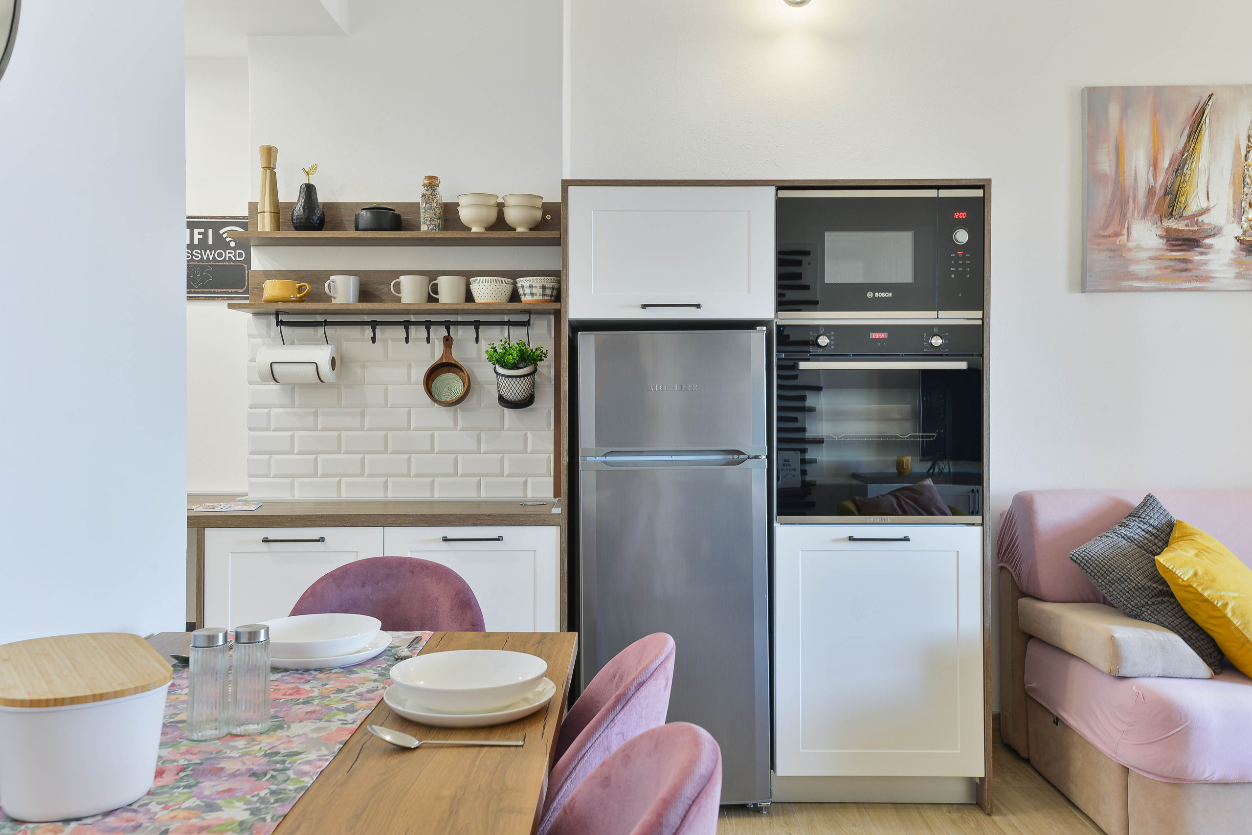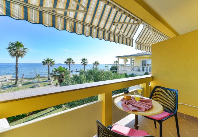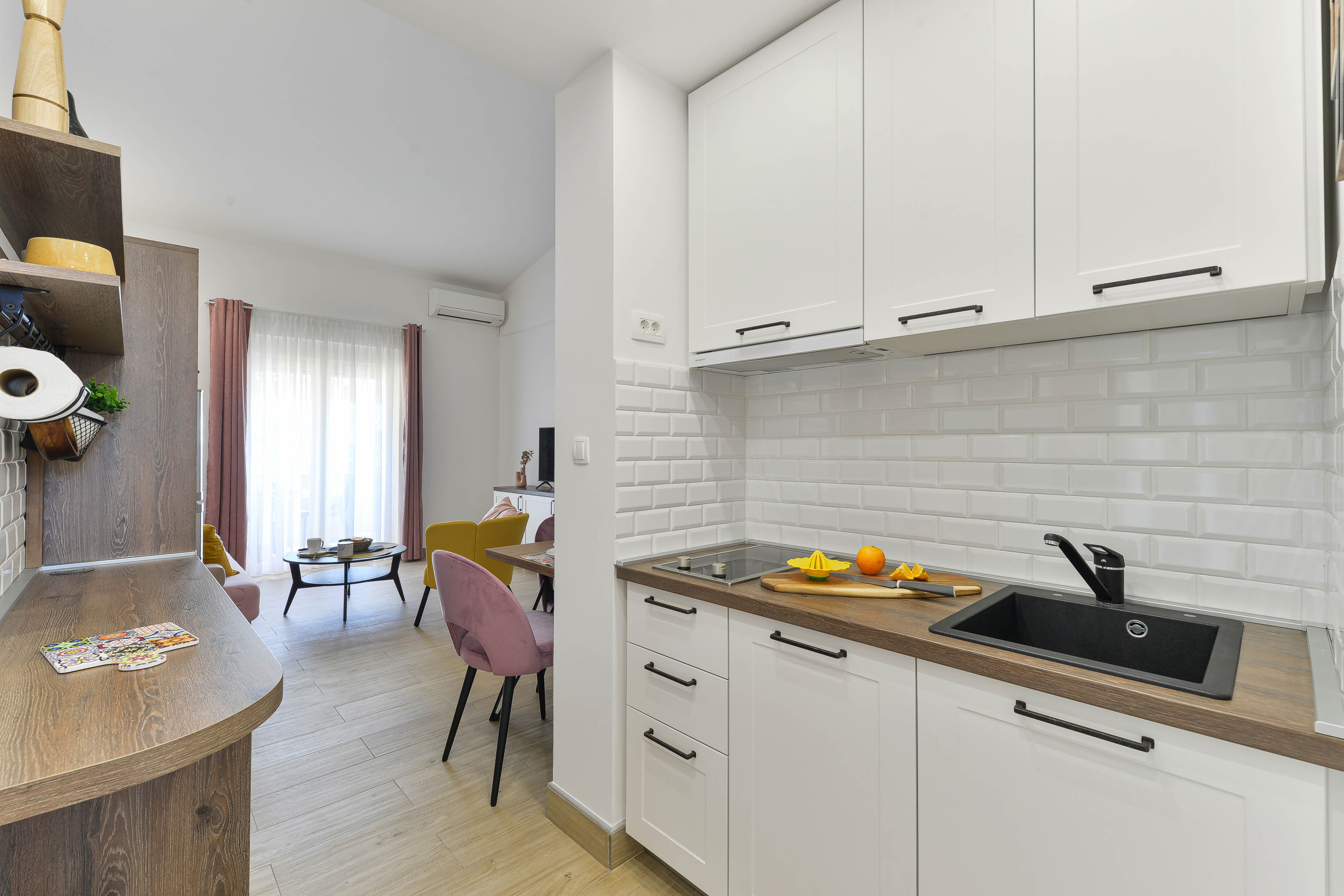 The house with 4 apartments is situated only few meters from the beach on island Vir. The island is connected to the mainland with a bridge. There are restaurants, bars and great beaches on this island. Concerts and happenings are organized during the whole season. The house itself is situated in a nice residential area but the center of the place is easy accessible. Beautiful garden surrounds the house, there is a grill, lounges, outdoor dining area and direct exit from garden to the beach. This apartment is situated in apartment house on the first floor. There are 4 apartments in the house. This apartment accommodates up to 4 guests. It has one bedroom with double bed, one bathroom and additional sofa bed for 2 person in living room.