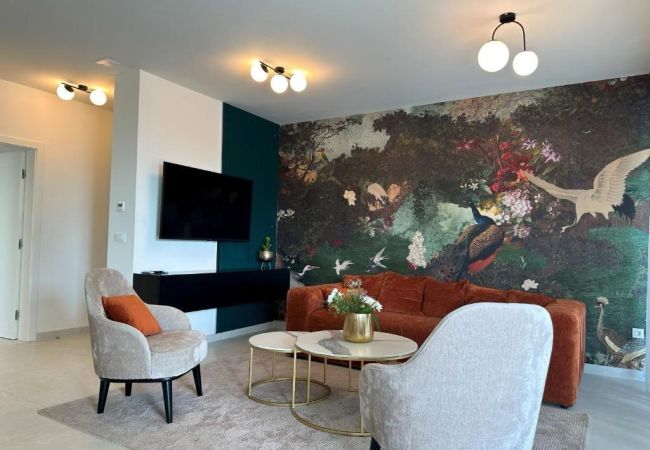 The apartment features an elegant bedroom and a spacious living room with a comfortable sofa bed for two additional guests. The open-plan layout of the living room, kitchen, and dining area creates a bright and airy atmosphere, while large glass walls allow plenty of natural light to fill the space, adding a touch of sophistication.