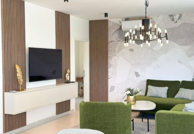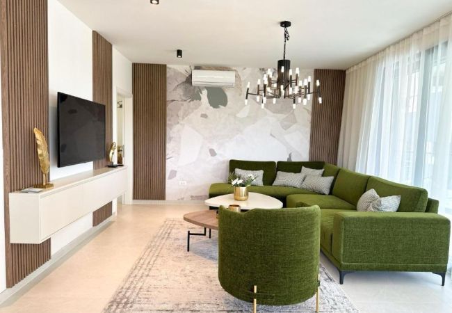 It features three luxurious master bedrooms with 160x200 cm double beds. Two bedrooms have private balconies, while the third offers a captivating sea view. The apartment accommodates up to 7 guests (6+1), making it an ideal choice for families or groups seeking premium comfort and privacy.