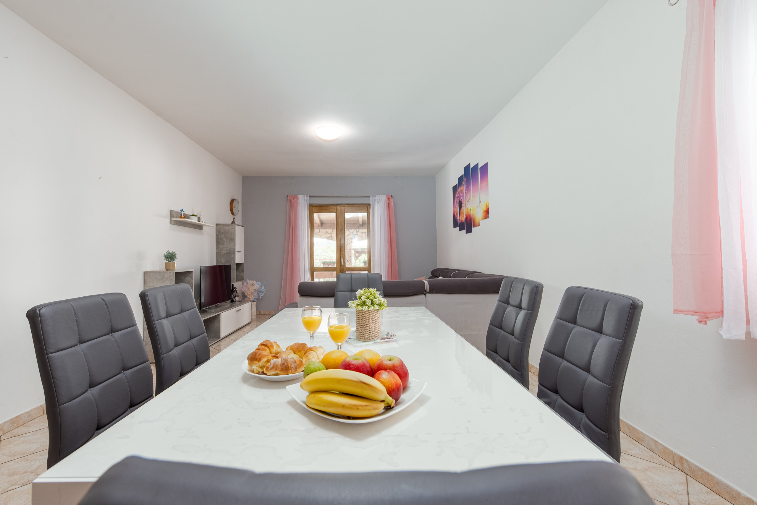 The indoor space features an open concept living area with kitchen, dining room and living room in one room. Three bedrooms with double beds provide sleeping places for 6 guests, and a convertible sofa in the living room can accommodate 2 more guests.
