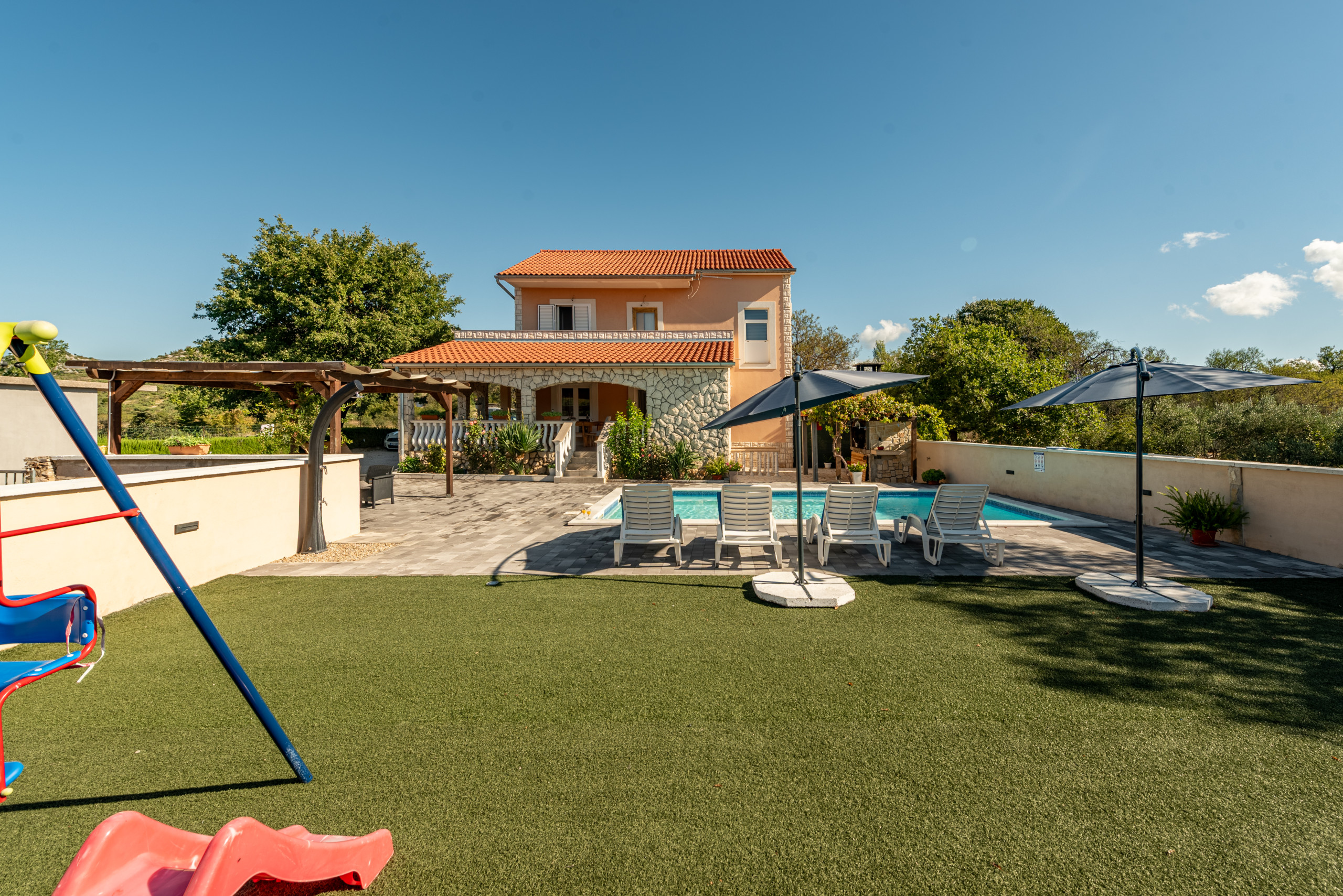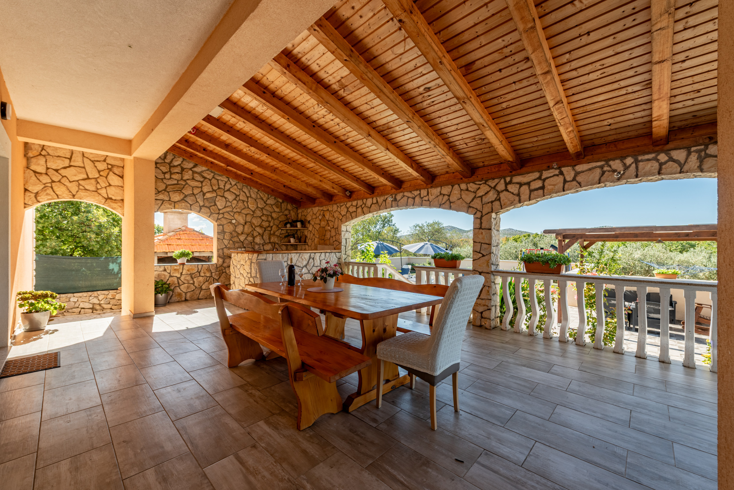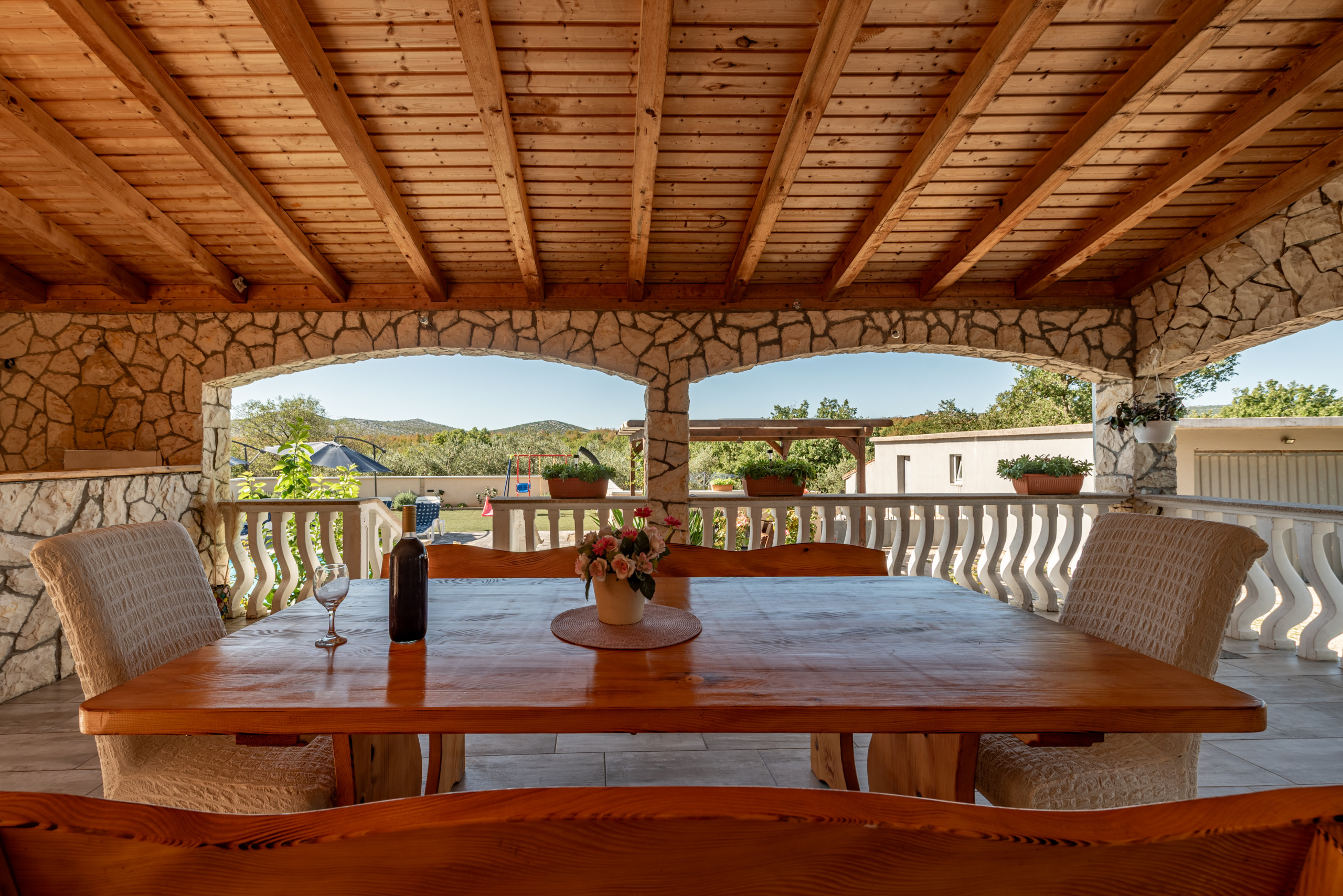 The house is situated in a fenced property and it`s outdoors will amaze you. A pool area with sun umbrellas and sunloungers, a rustic barbecue area, children play area and a covered wooden furniture terrace that was hand-made by the homeowners. But one space will make you want to never leave - a spacious covered terrace with full shade, a small summer kitchen and a big dining and seating area, all together providing a space to truly take advantageevery part of the day.