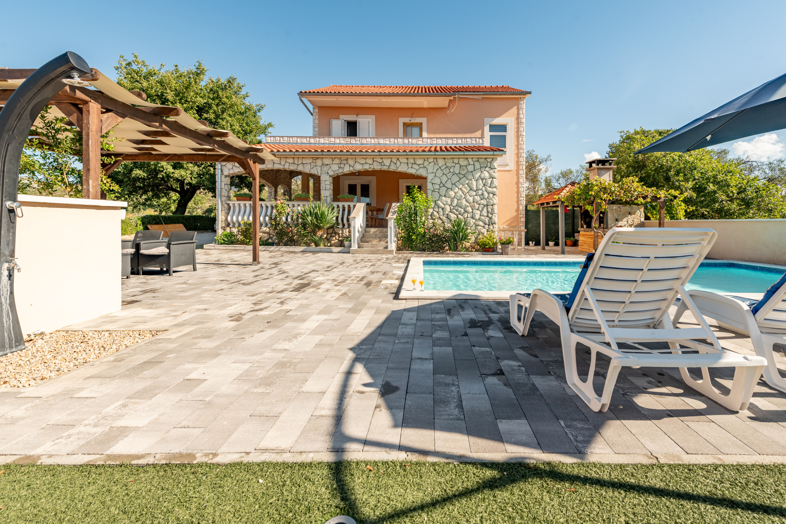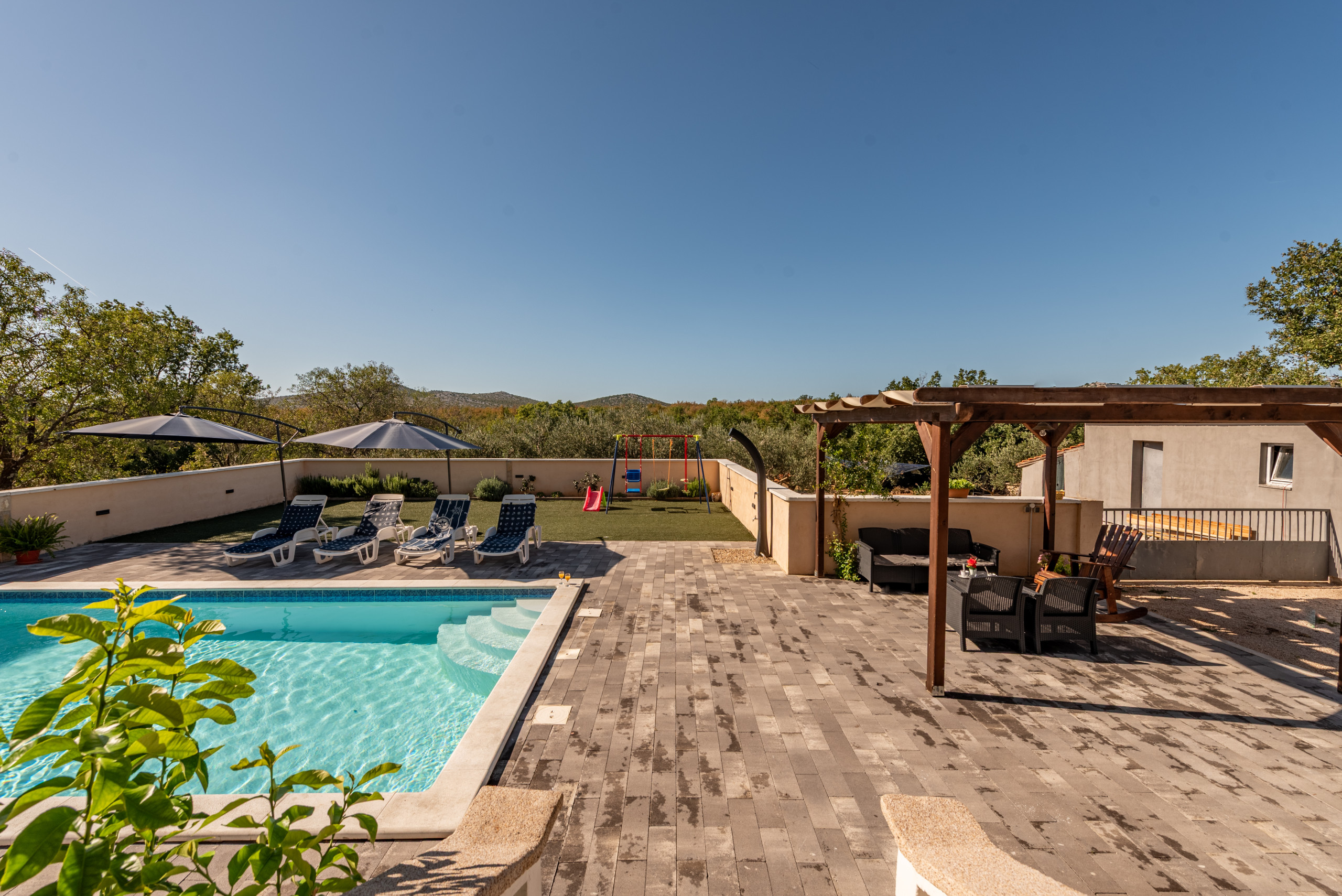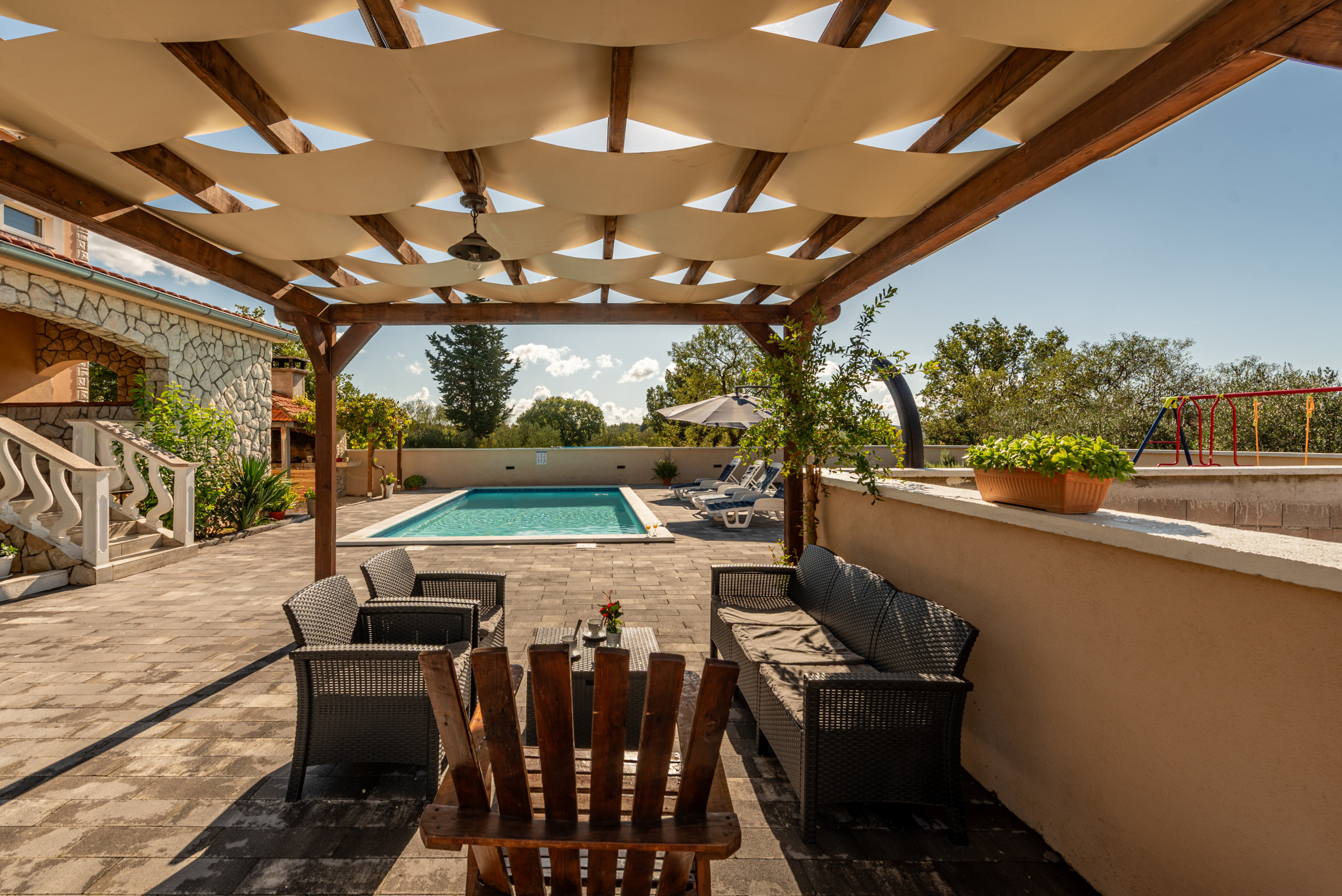The house is situated in a fenced property and it`s outdoors will amaze you. A pool area with sun umbrellas and sunloungers, a rustic barbecue area, children play area and a covered wooden furniture terrace that was hand-made by the homeowners. But one space will make you want to never leave - a spacious covered terrace with full shade, a small summer kitchen and a big dining and seating area, all together providing a space to truly take advantageevery part of the day.