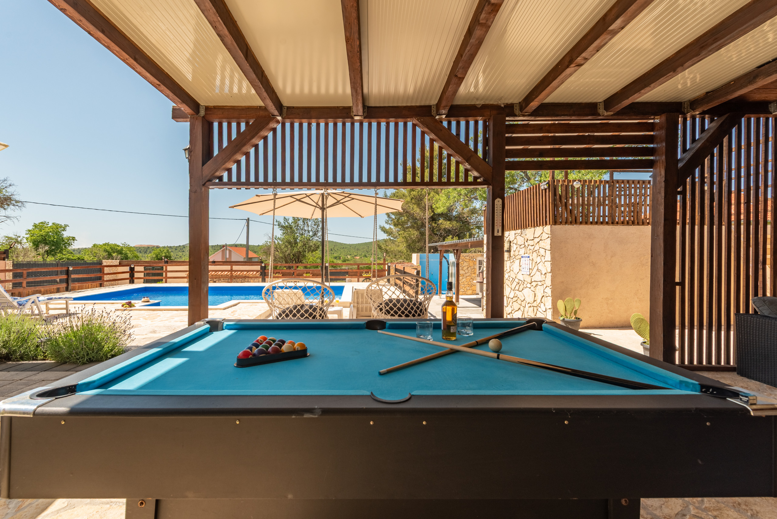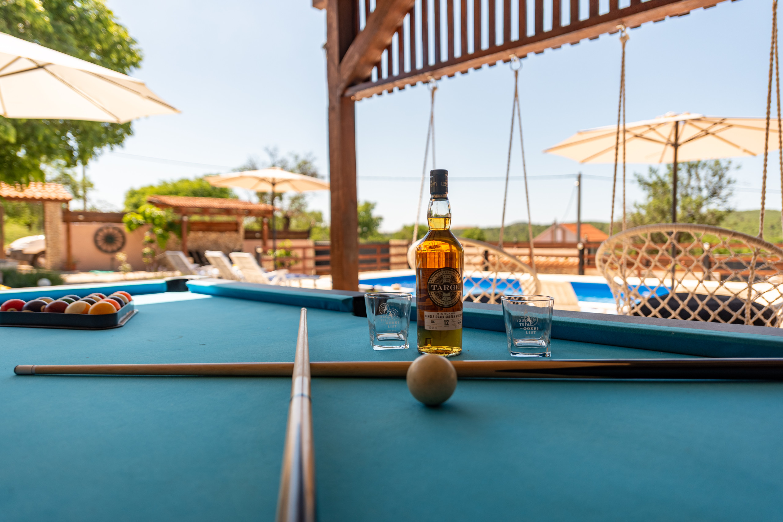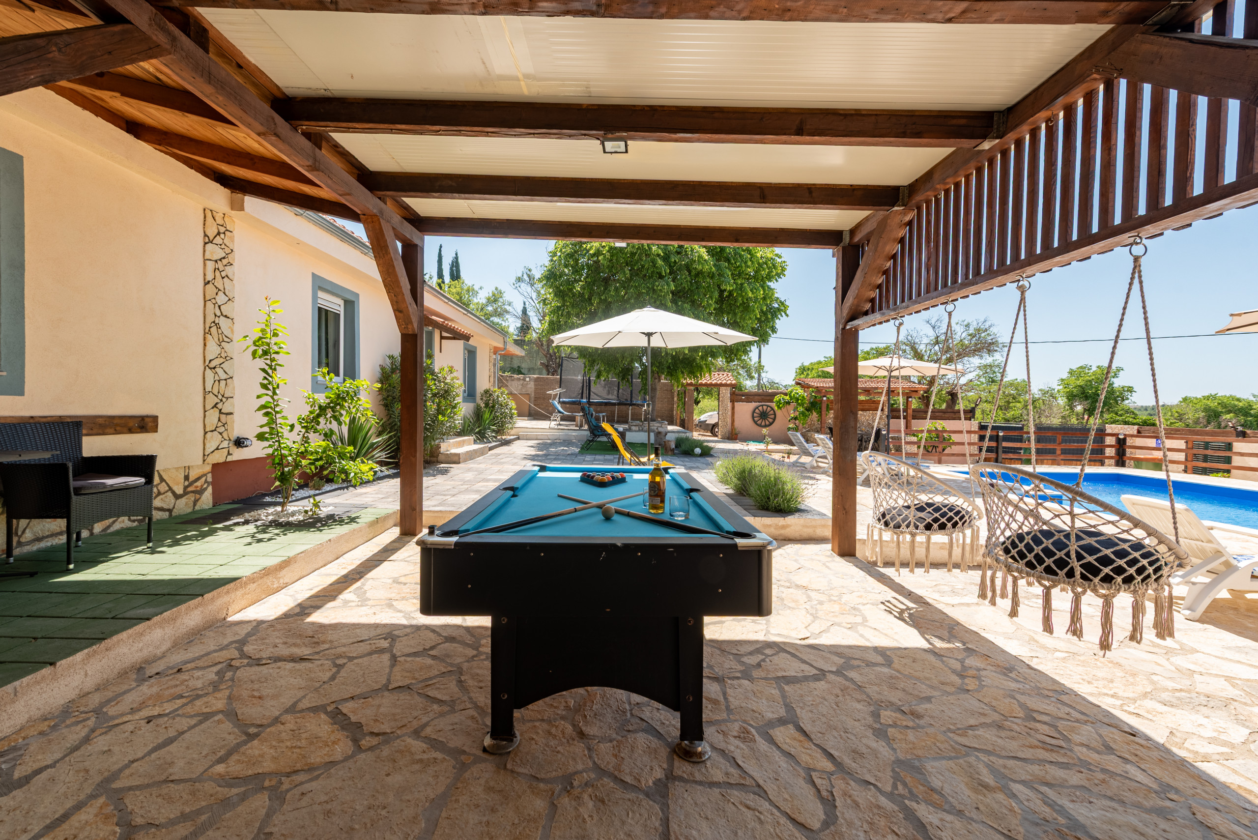 The sun-soaked pool area is designed for maximum comfort and fun, complete with loungers, parasols, a trampoline, and a billiards table. Shaded terraces provide cozy spots for afternoon reading or a nap, while the spacious outdoor dining area with an additional summer kitchen and barbecue invites you to enjoy long, relaxed meals with family or friends. For added convenience, the property also includes an additional outdoor toilet and an outdoor shower, perfect after a refreshing dip in the pool.