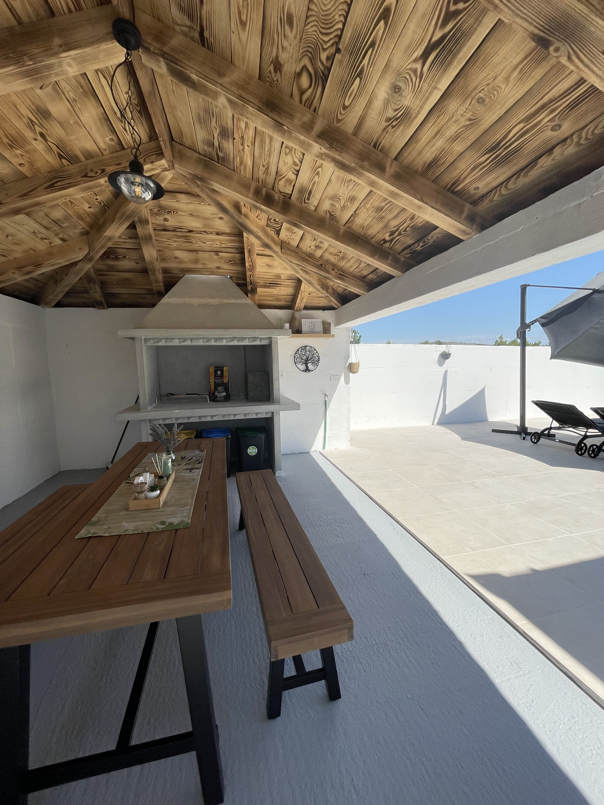 The property is set on a large, fully fenced plot offering both privacy and safety. The outdoor area includes two spacious terraces, a swimming pool with sun loungers and umbrellas, an outdoor shower, a dining table, and a stone barbecue for preparing meals outside. Children can enjoy the playground, and an additional outdoor toilet provides extra convenience.