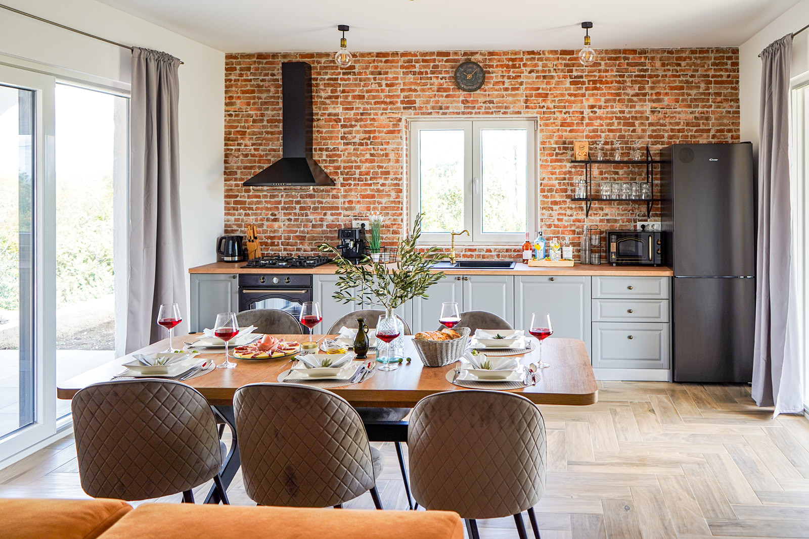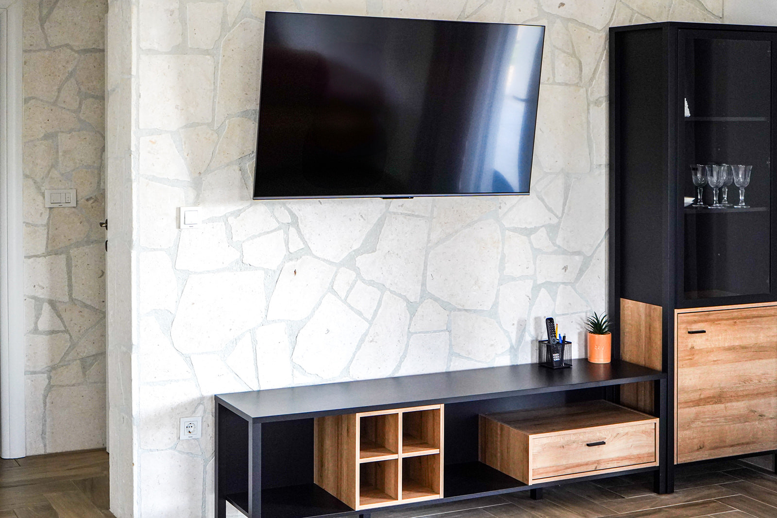 The house can accommodate up to six guests and is ideal for families or small groups of friends. It features two comfortable bedrooms with double beds and TVs, and a sofa bed in the living room for one additional person. There is also a third room with a single bed, which has a separate entrance from the outside, suitable for guests who prefer more privacy. The modern kitchen is fully equipped with everything needed to prepare meals, while the living room with an indoor fireplace and the dining area provide a warm and welcoming space for spending time together.