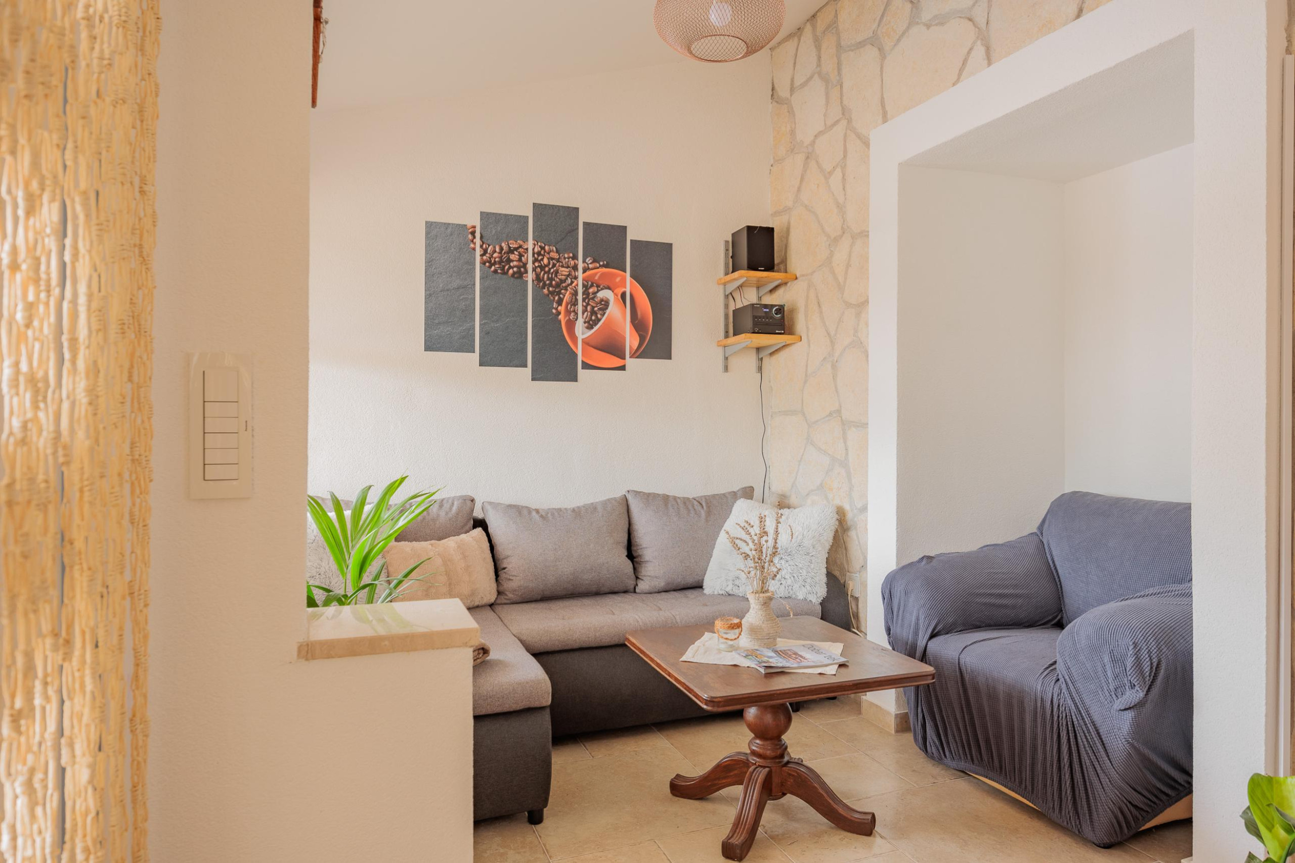 A comfortable living room with a sofa, satellite TV and a game console allows you to relax after a long day.