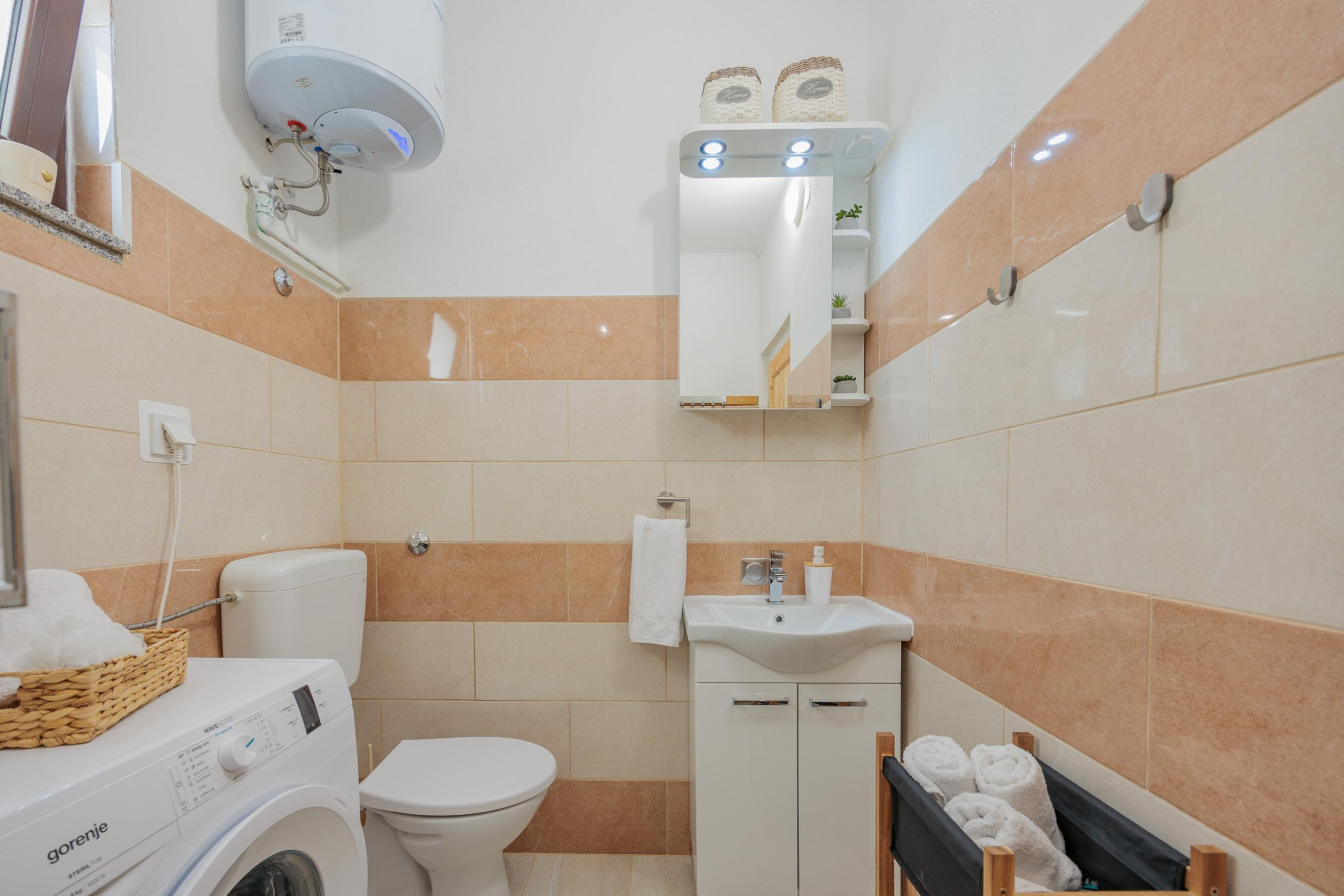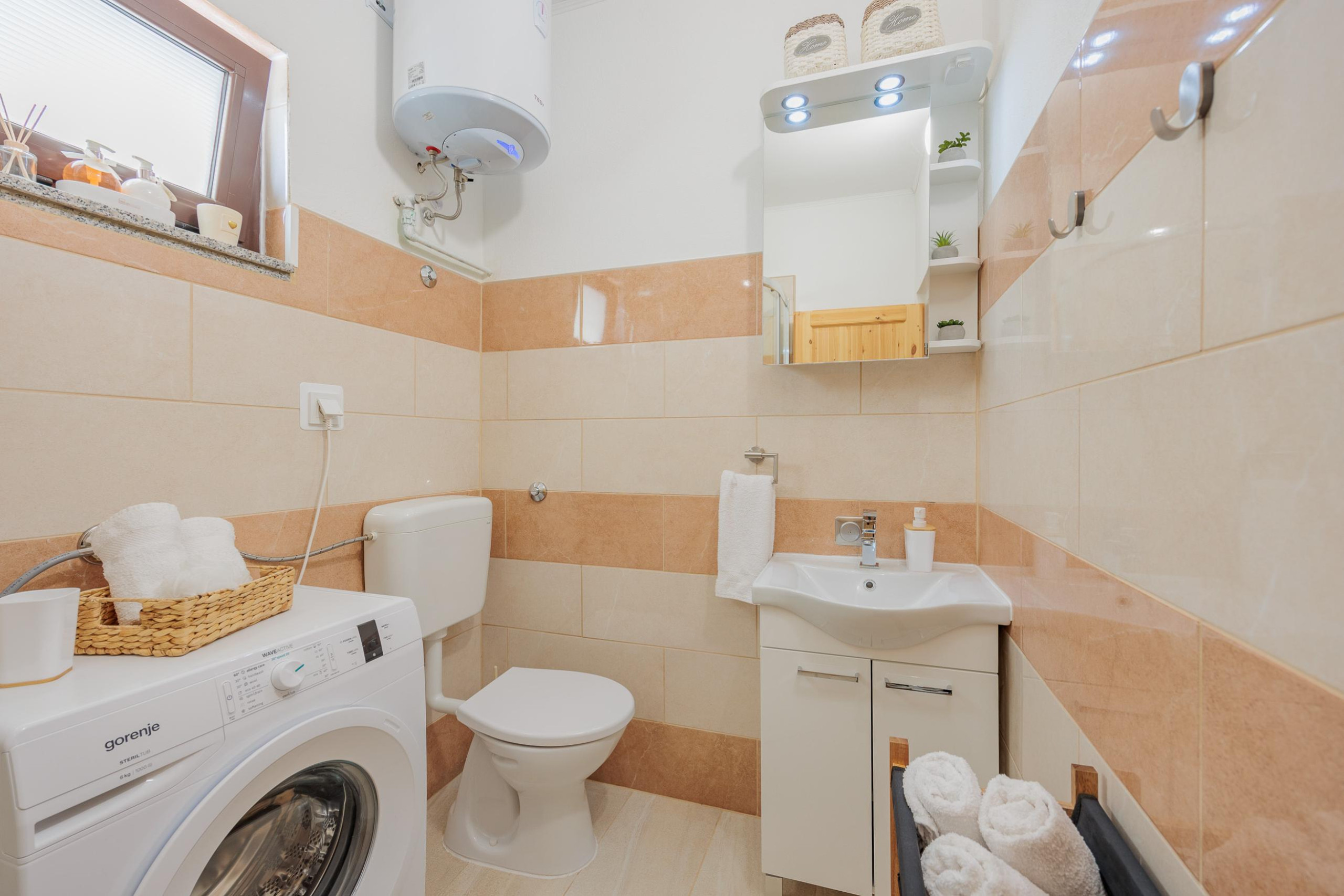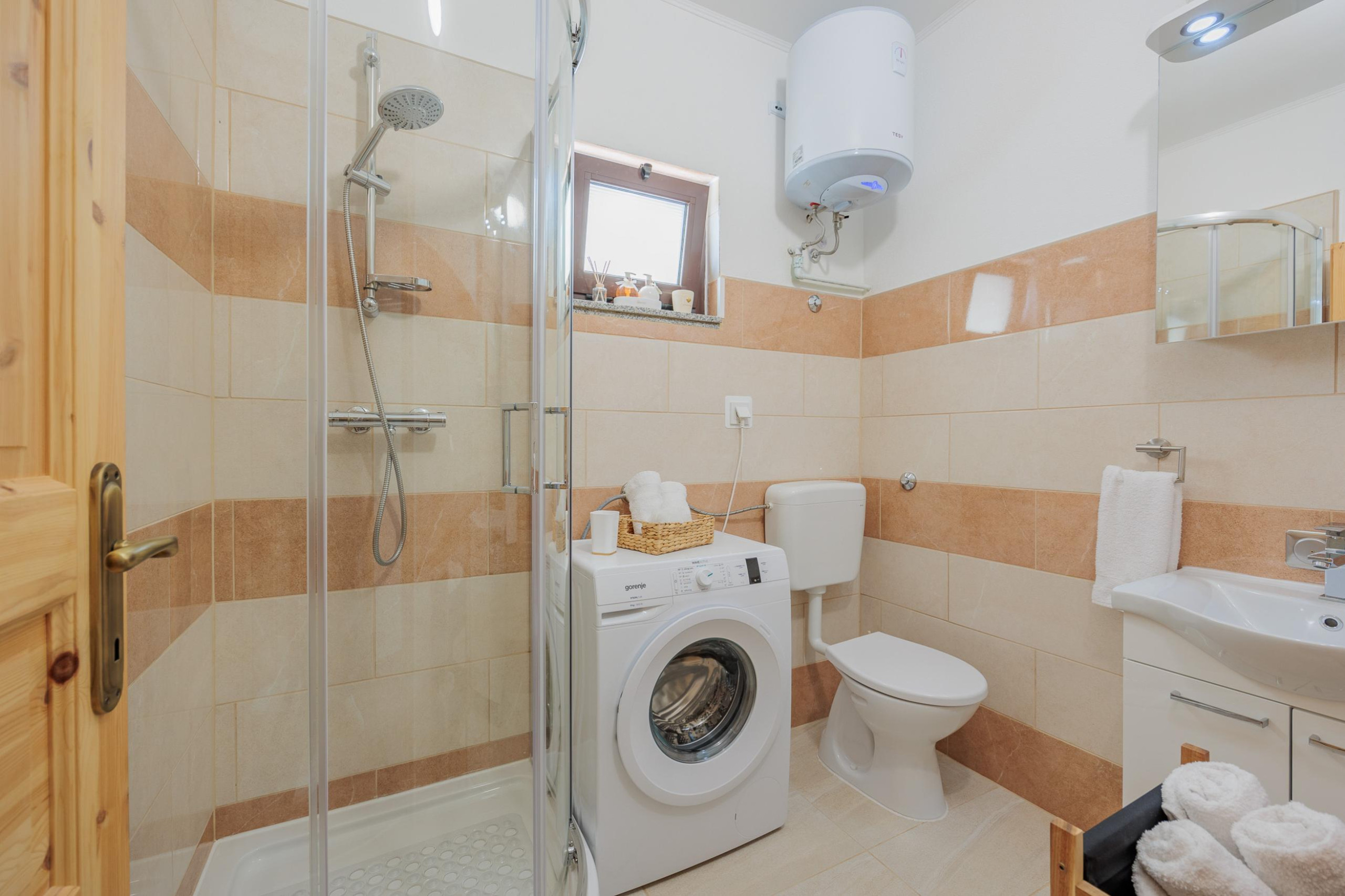 The bathroom has a sink, toilet, shower and washing machine.