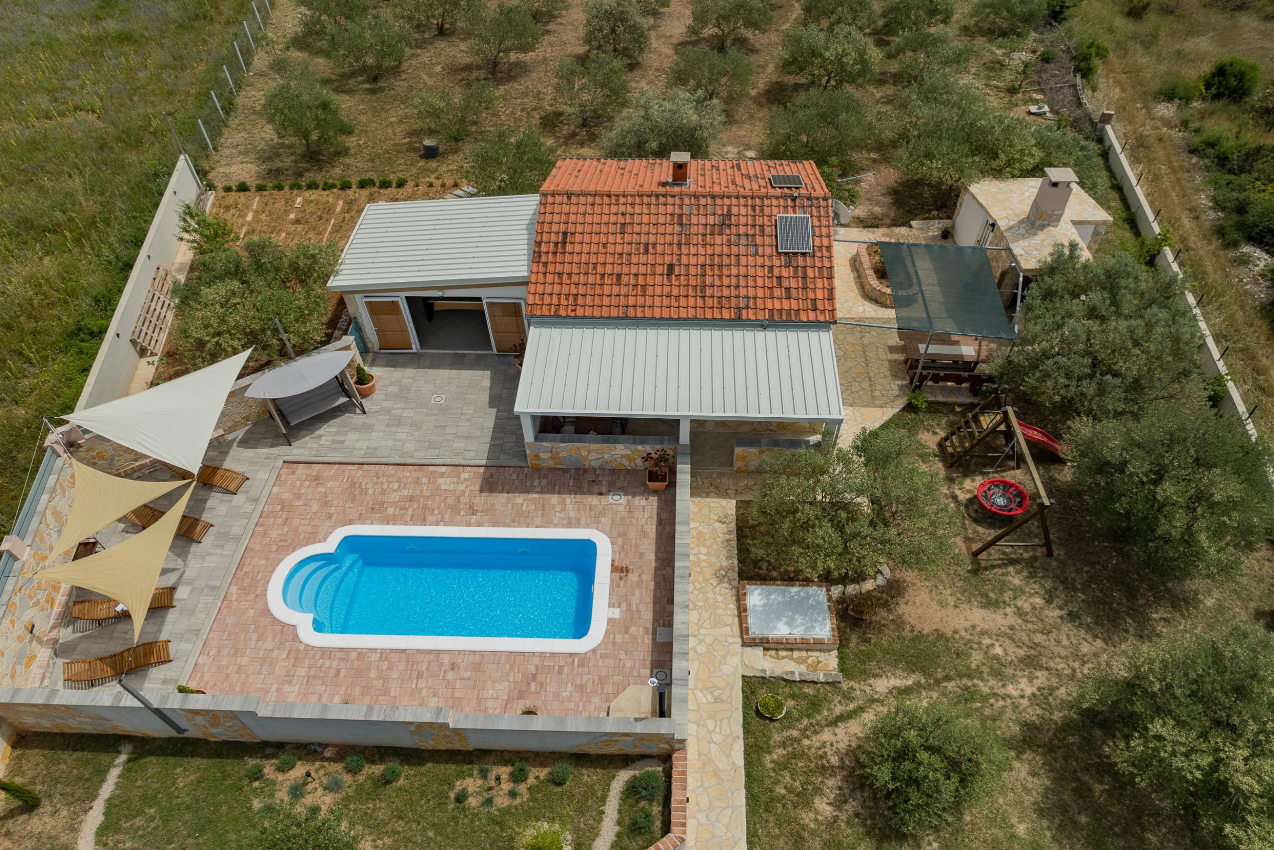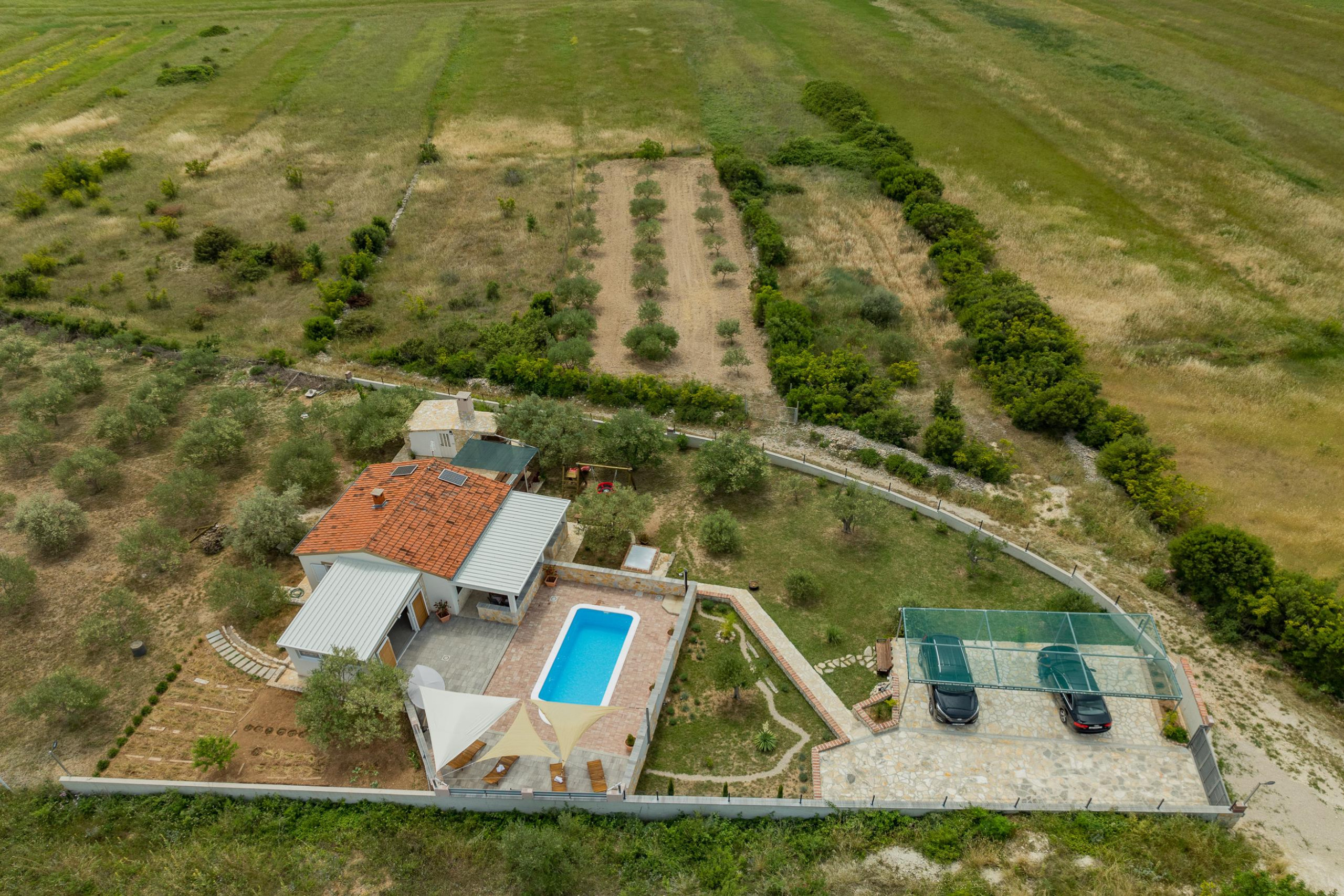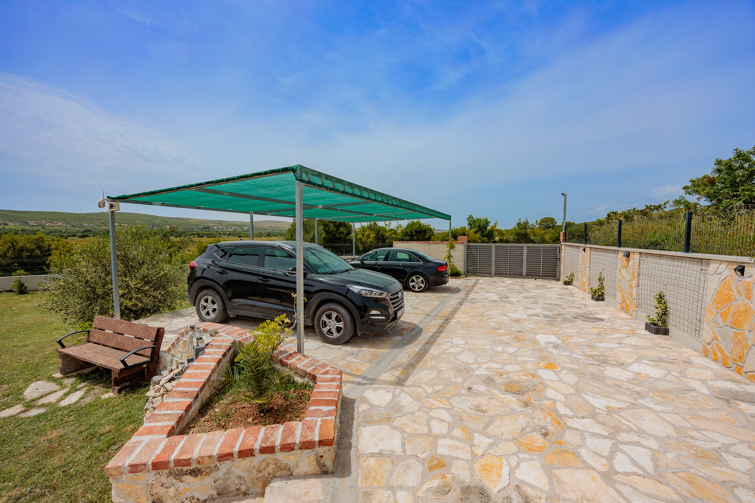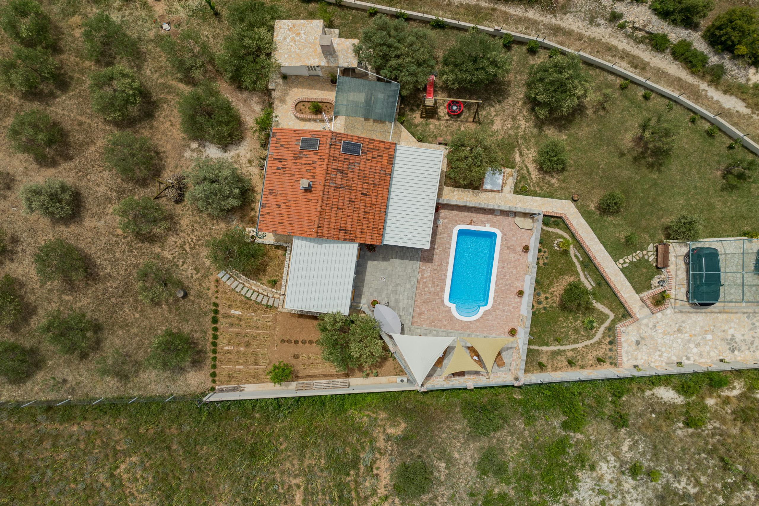 The outdoor area of Villa Fjaka covers an area of 2300 m2 and is completely fenced. The private pool of 21 m2 guarantees refreshment and complete relaxation of all senses. There is also a grill for preparing delicious meals that guests can later enjoy on the covered terrace by the pool. For guests arriving by car, 5 parking spaces are available in front of the villa.