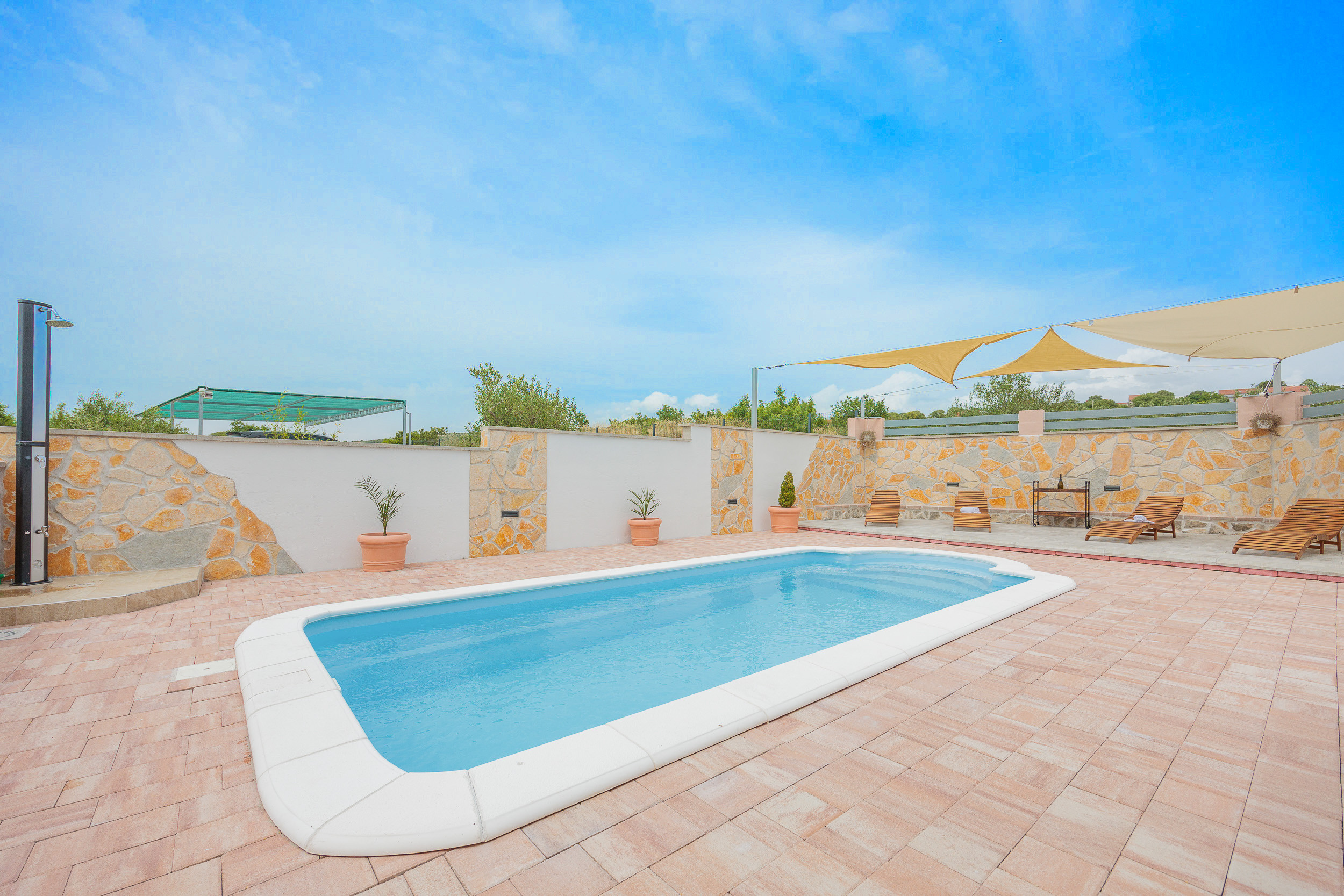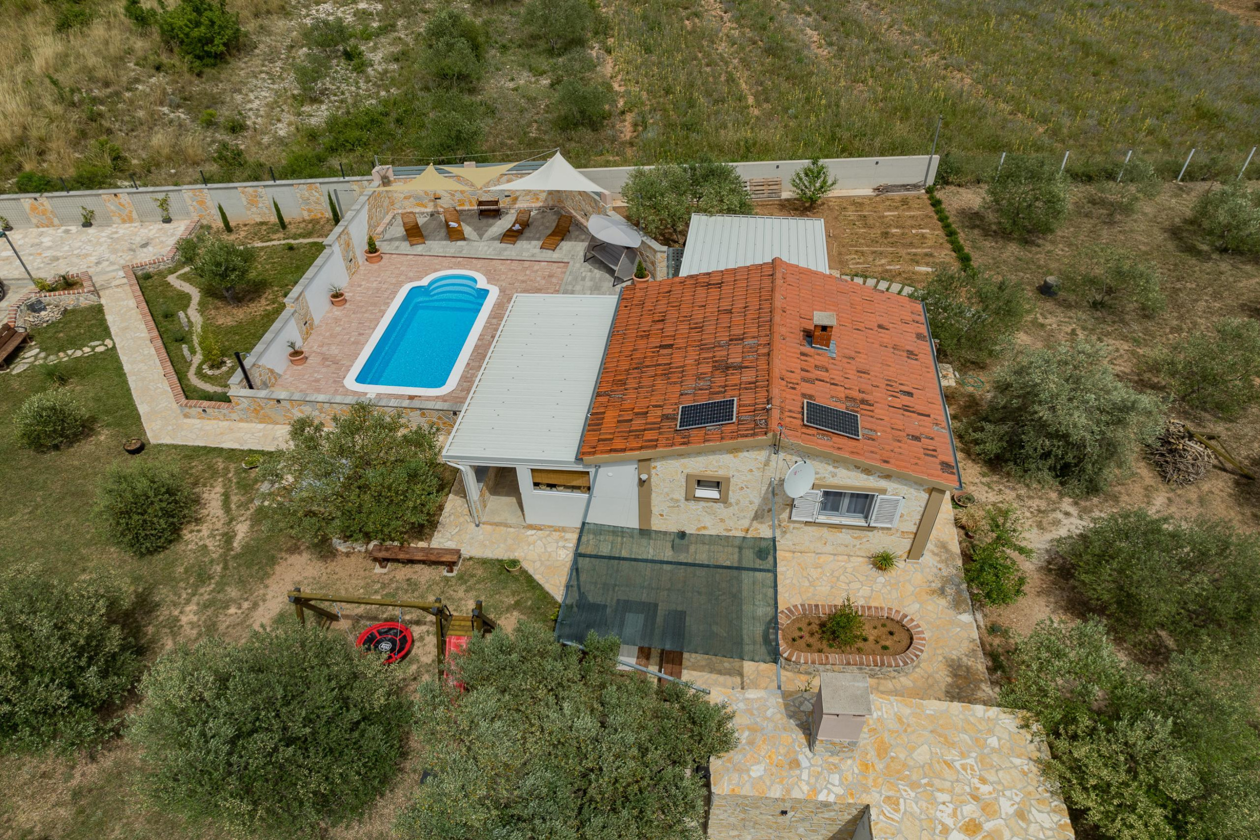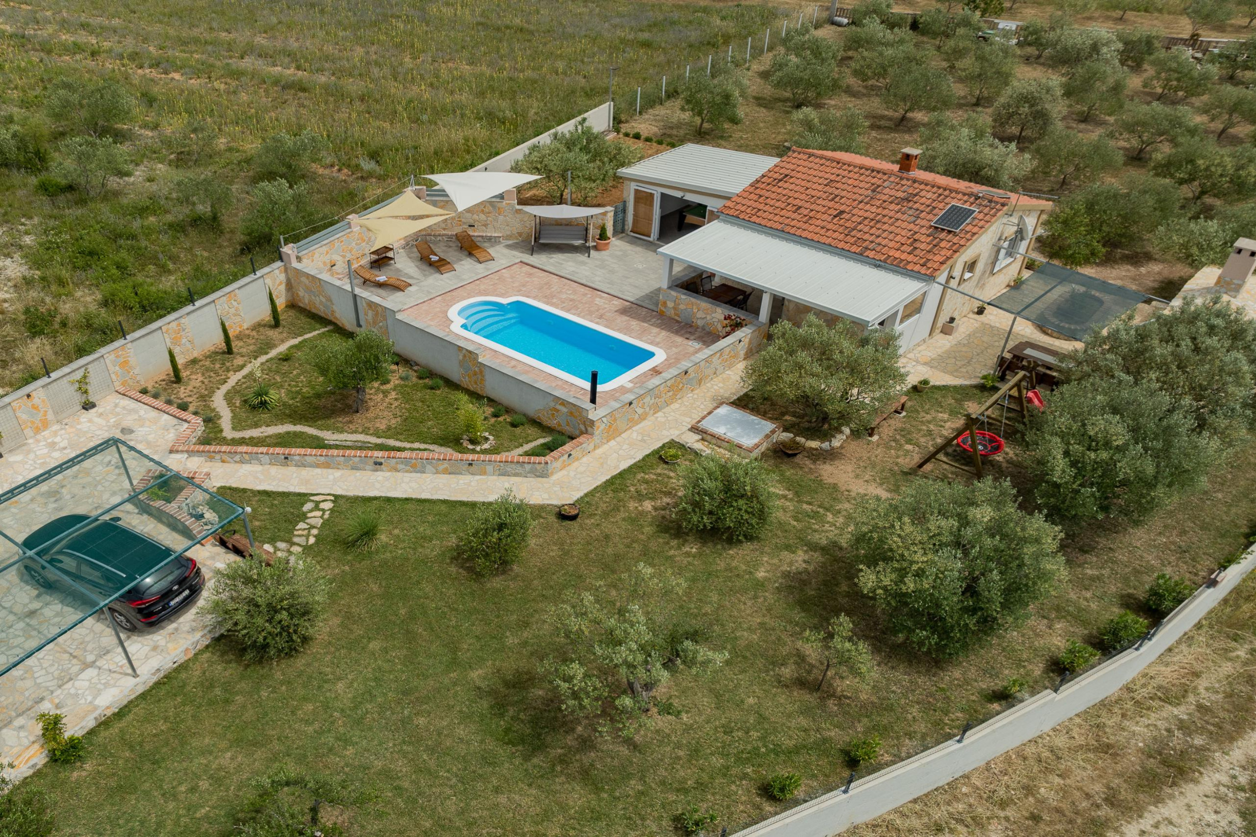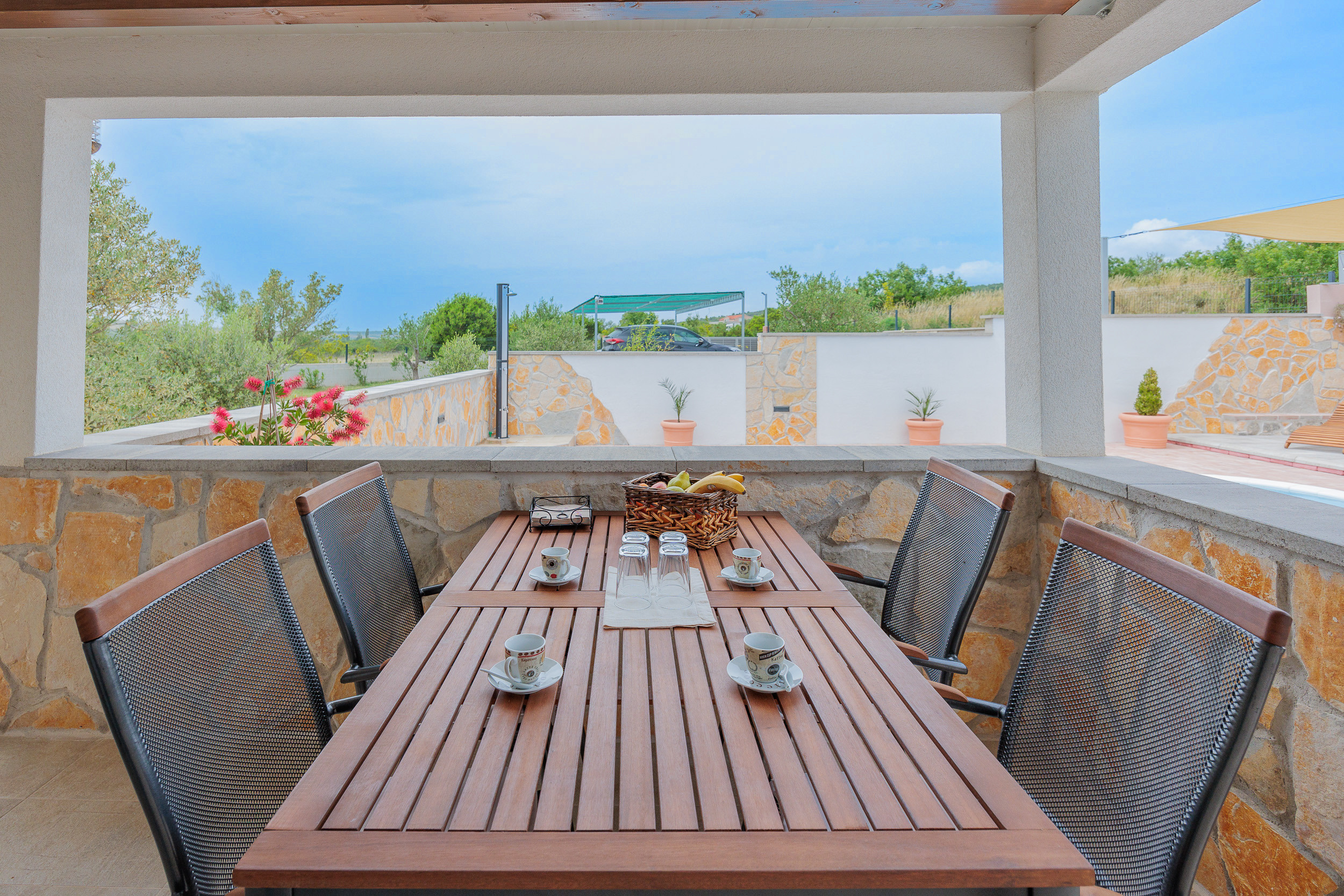 The outdoor area of Villa Fjaka covers an area of 2300 m2 and is completely fenced. The private pool of 21 m2 guarantees refreshment and complete relaxation of all senses. There is also a grill for preparing delicious meals that guests can later enjoy on the covered terrace by the pool. For guests arriving by car, 5 parking spaces are available in front of the villa.