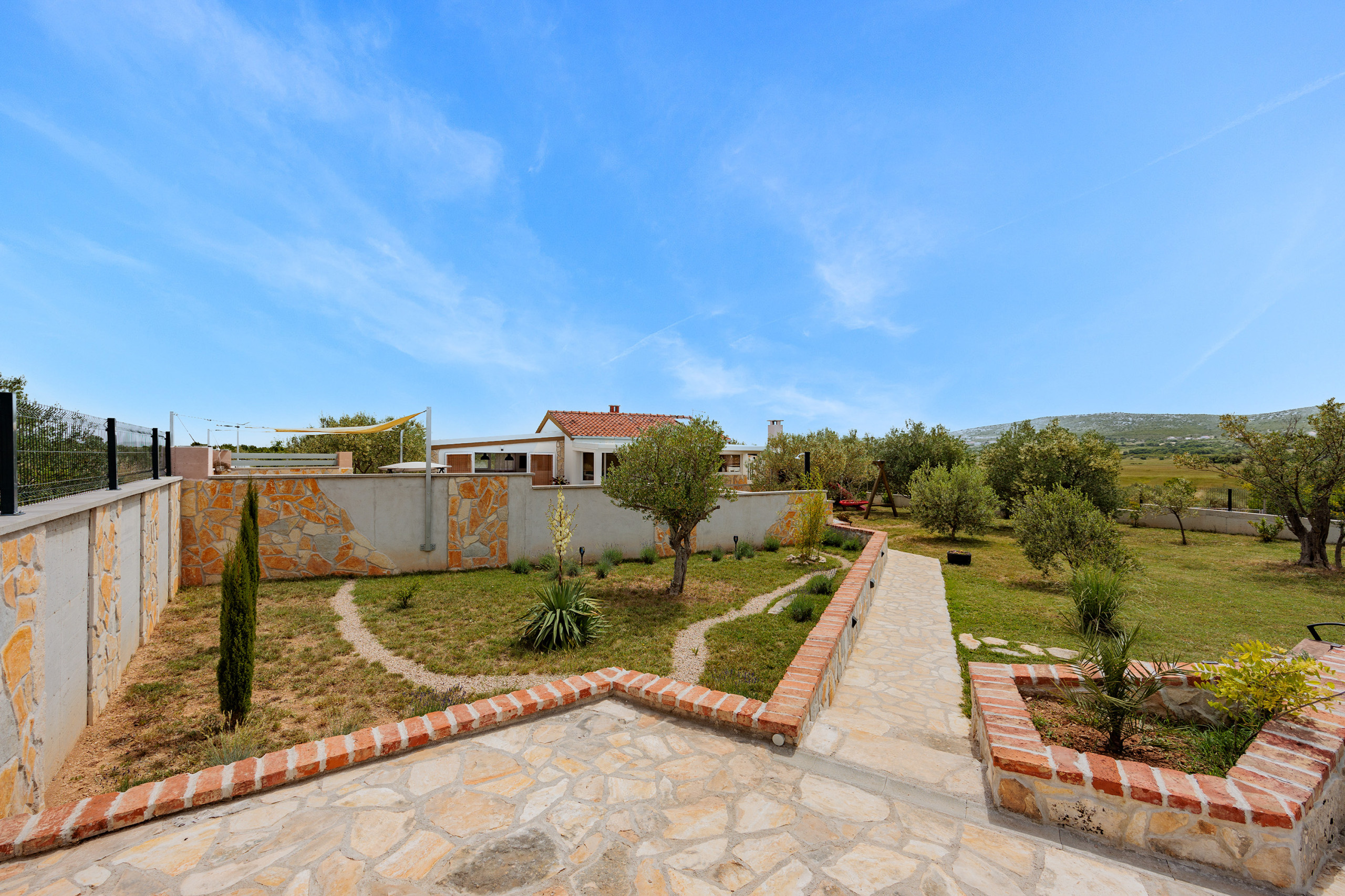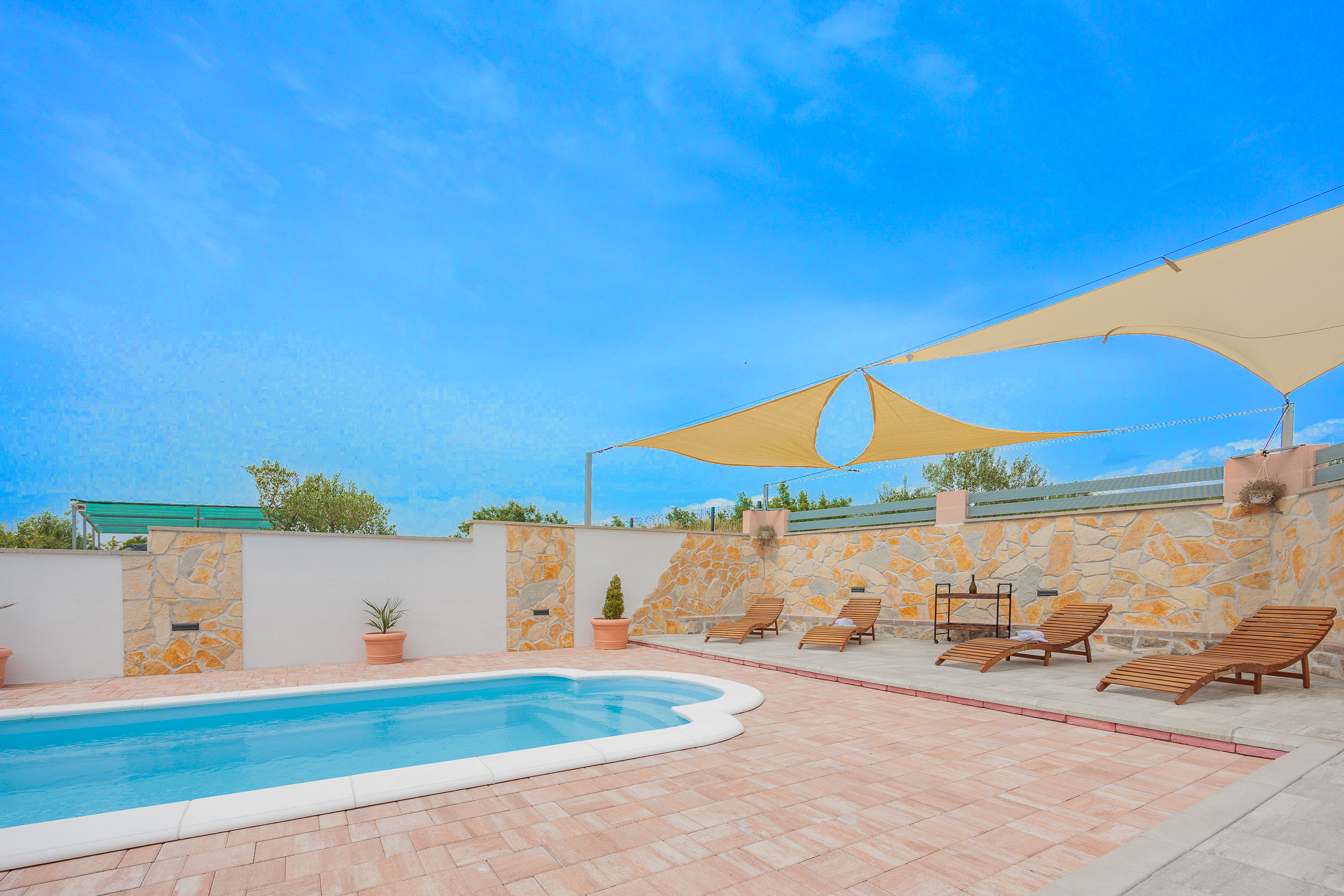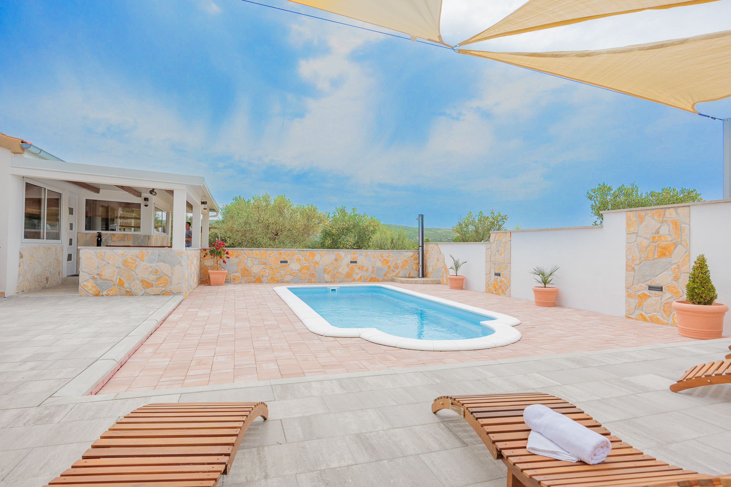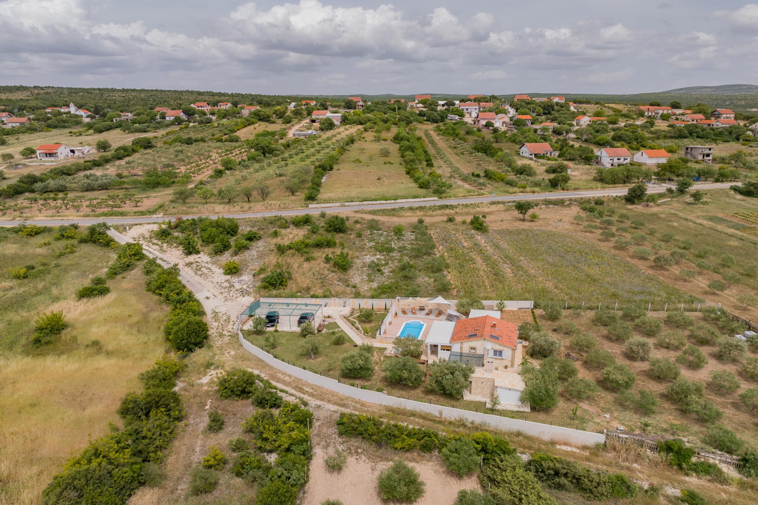 The outdoor area of Villa Fjaka covers an area of 2300 m2 and is completely fenced. The private pool of 21 m2 guarantees refreshment and complete relaxation of all senses. There is also a grill for preparing delicious meals that guests can later enjoy on the covered terrace by the pool. For guests arriving by car, 5 parking spaces are available in front of the villa.