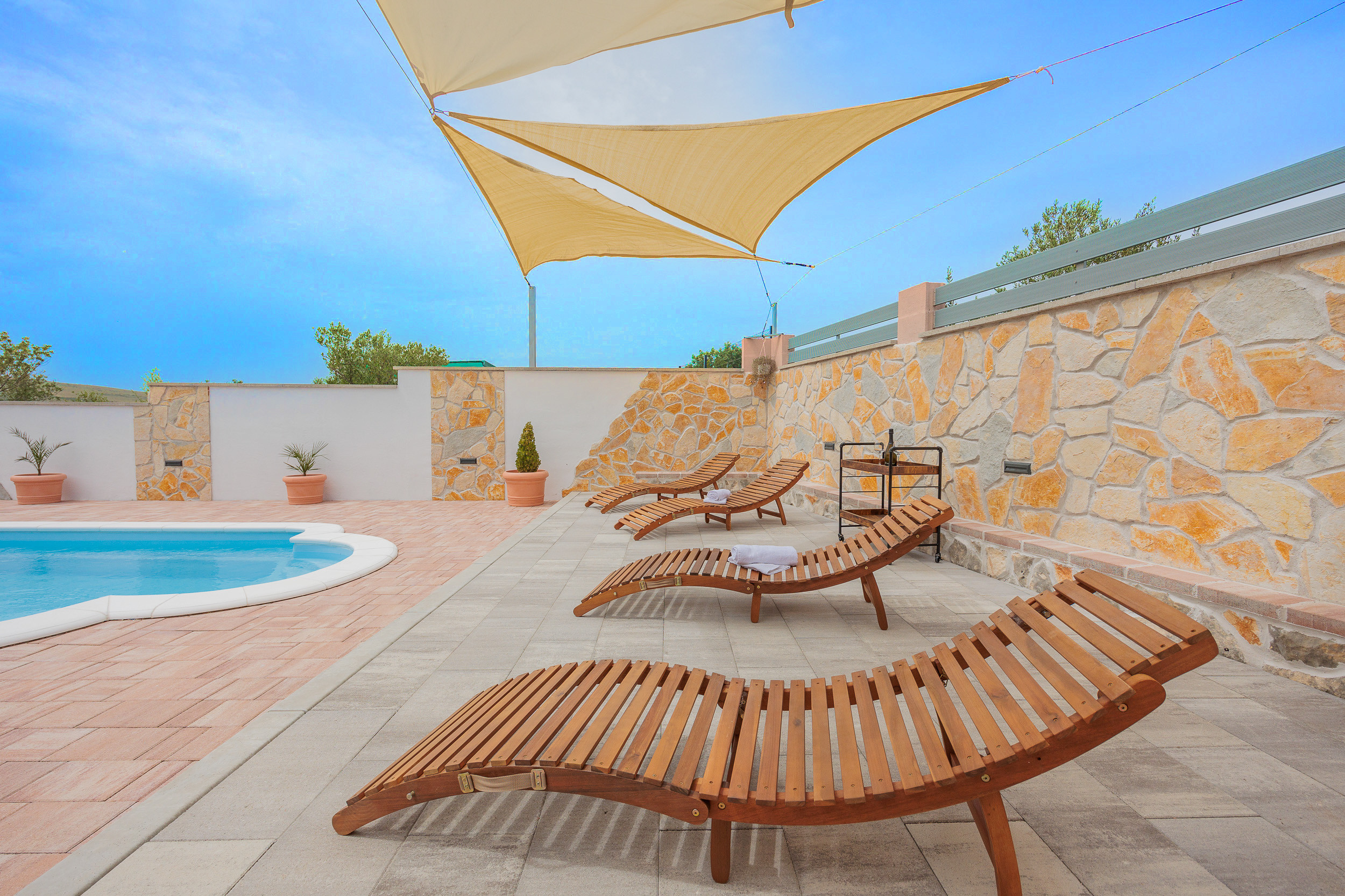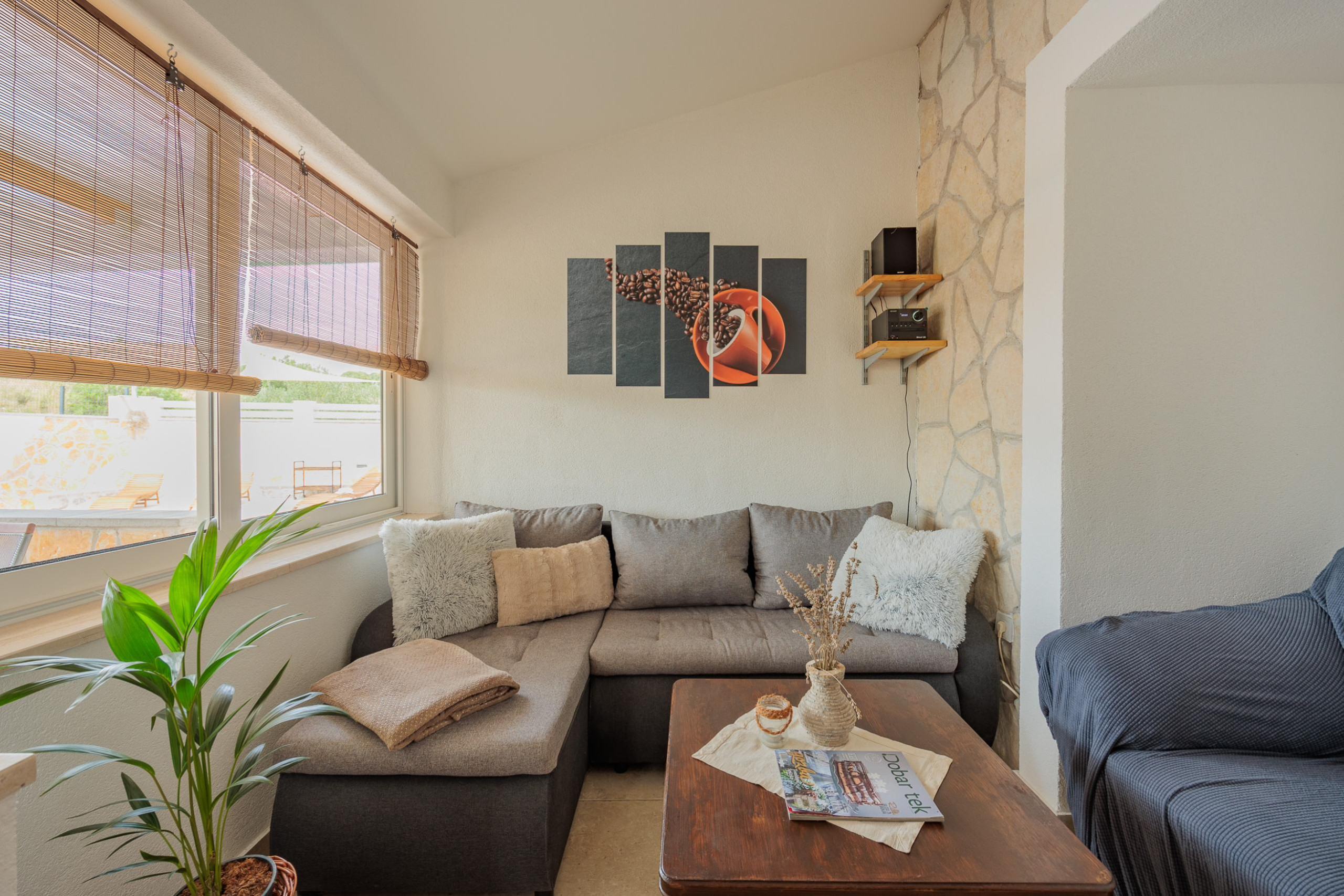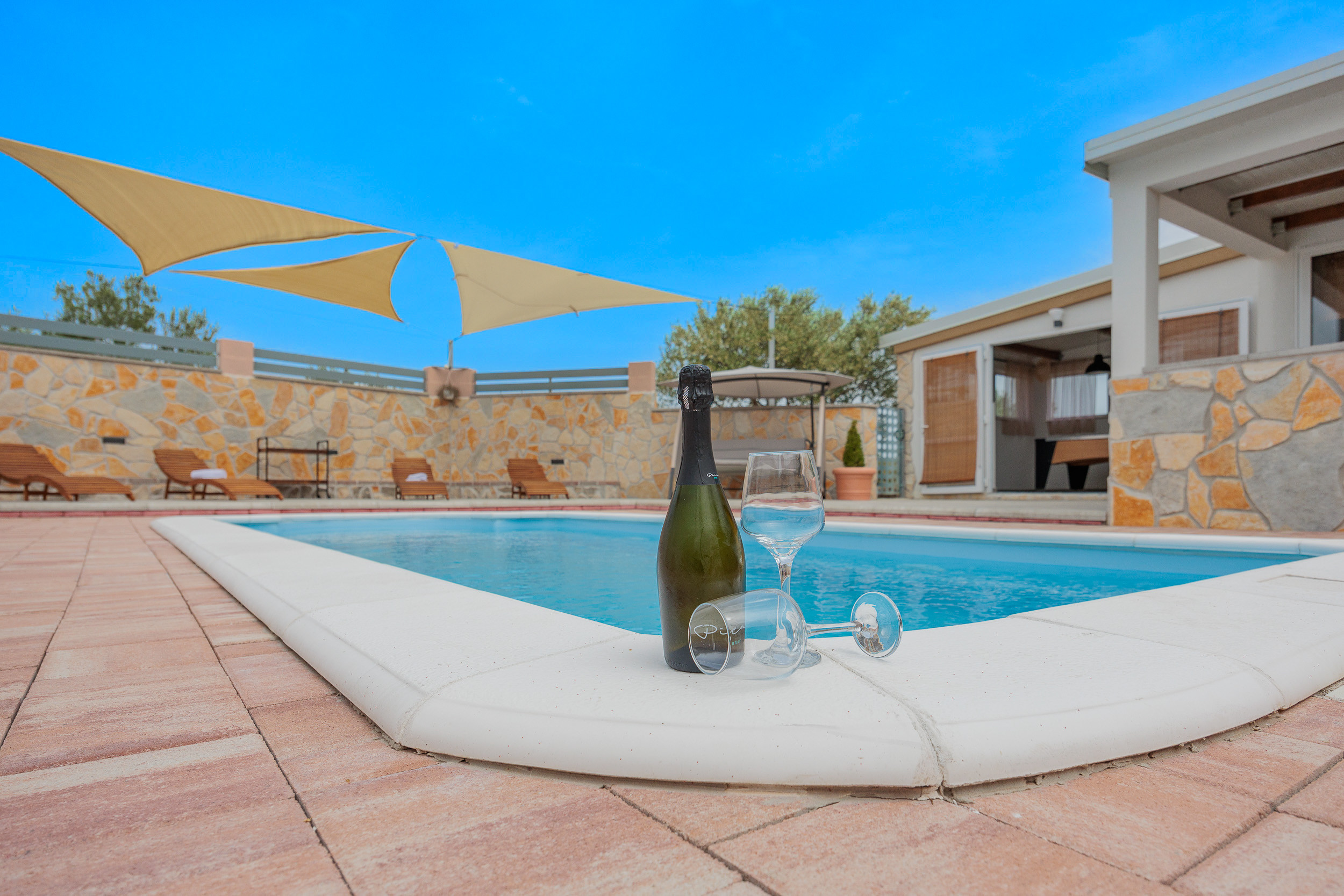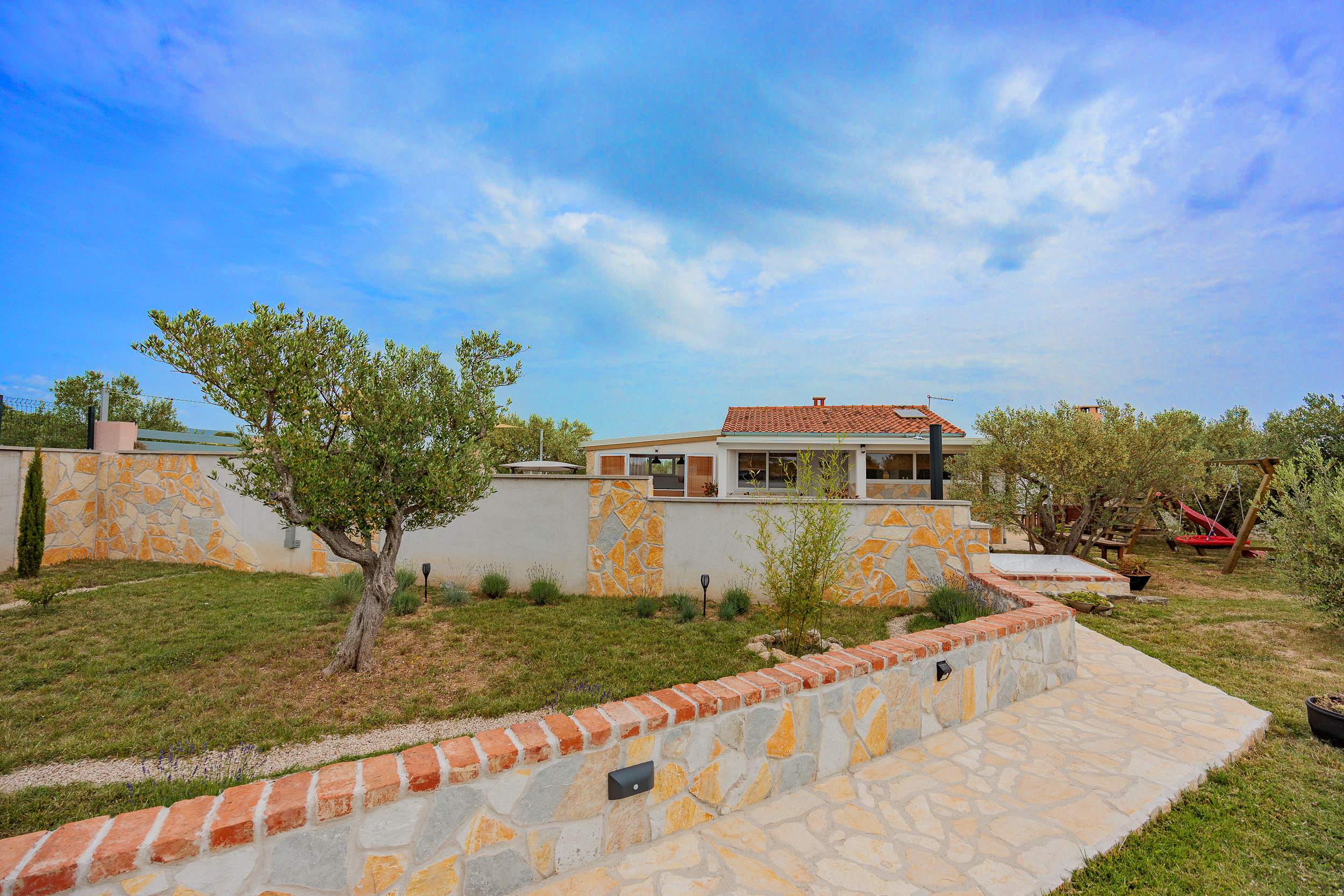 The outdoor area of Villa Fjaka covers an area of 2300 m2 and is completely fenced. The private pool of 21 m2 guarantees refreshment and complete relaxation of all senses. There is also a grill for preparing delicious meals that guests can later enjoy on the covered terrace by the pool. For guests arriving by car, 5 parking spaces are available in front of the villa.