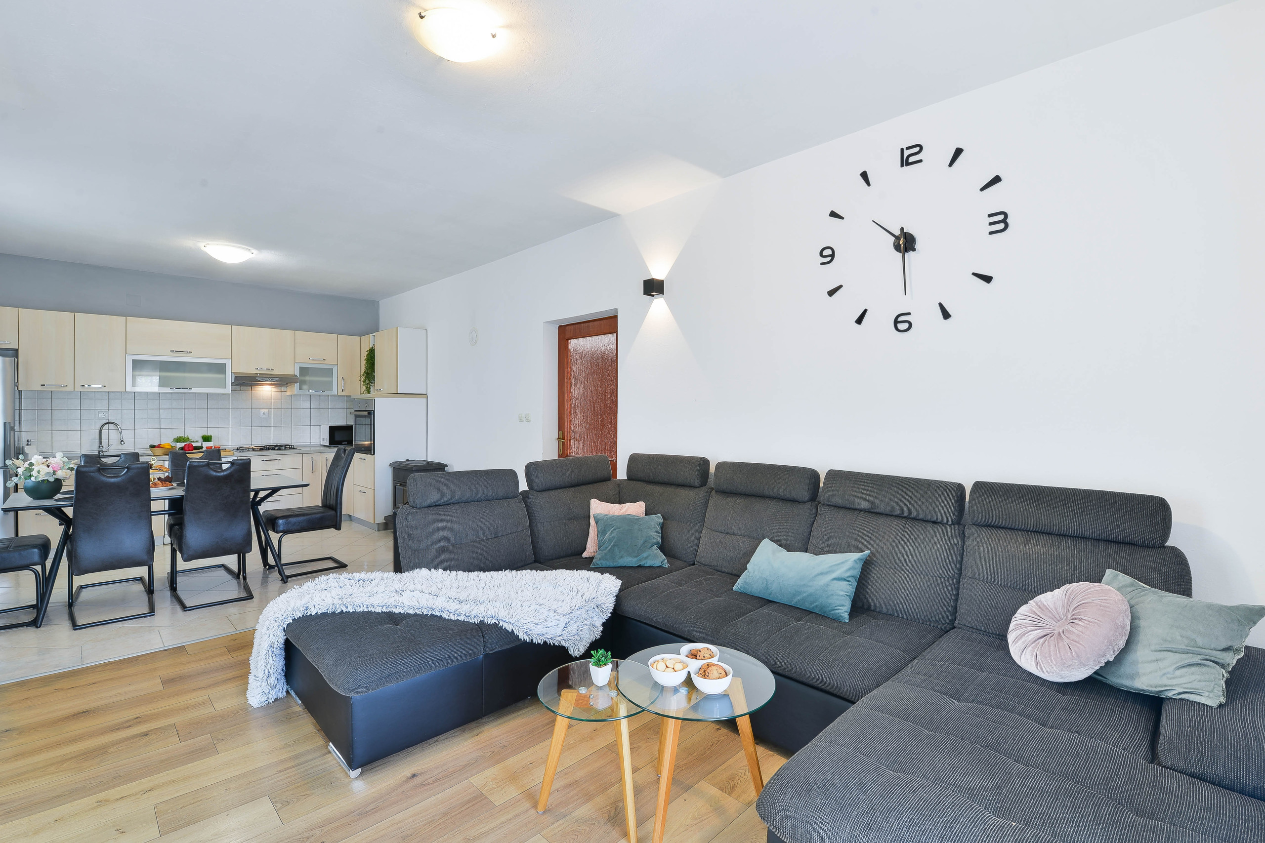 The 110 m² holiday home can accommodate up to eight people. You have three bedrooms (2 double rooms & 1 bedroom with 2 single beds), a bathroom with bathtub, a guest toilet and a living/dining area with kitchen. In the living area, a sofa bed offers space for two people.