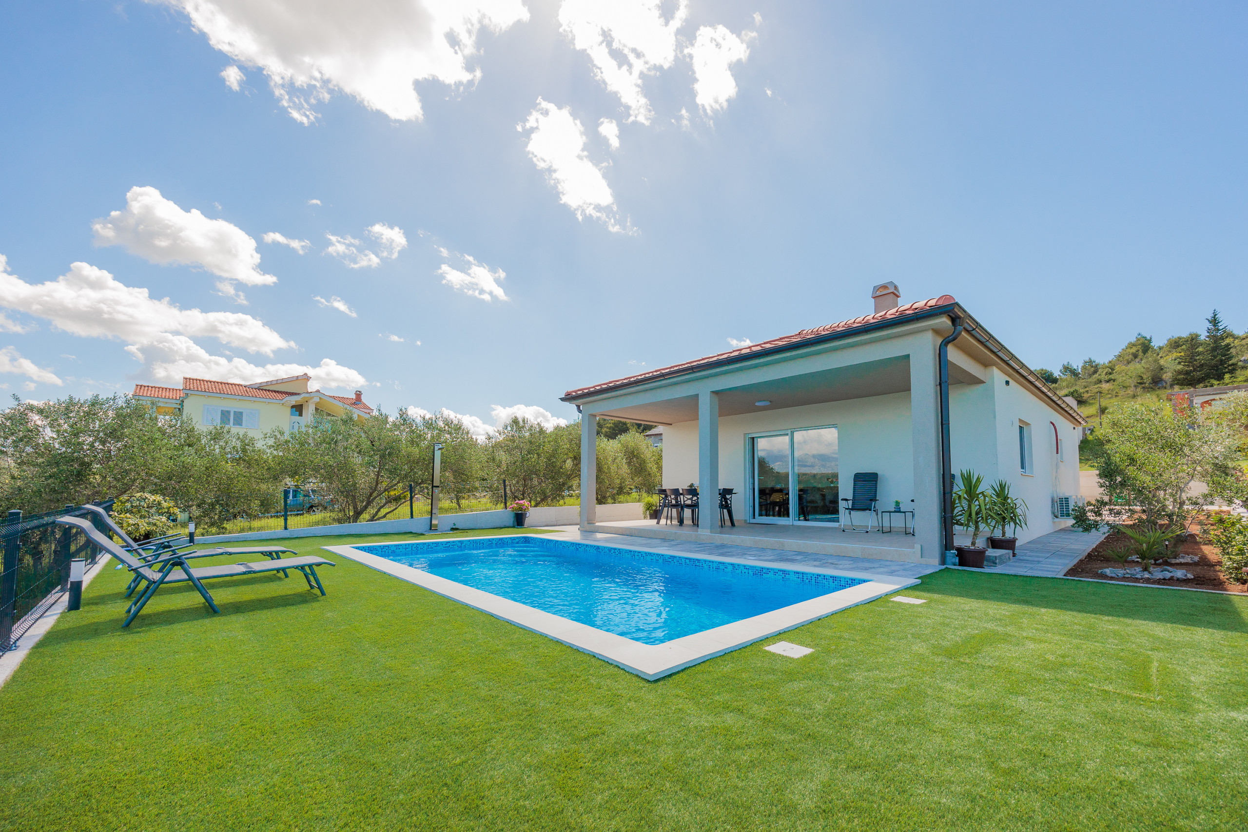 This charming holiday house is situated in a calm area with few neighbors, but is well connected and only 1 km from the sea. The house is 100m2 in size, placed on a 500 m2 plot with your own private parking places, garden and pool.
