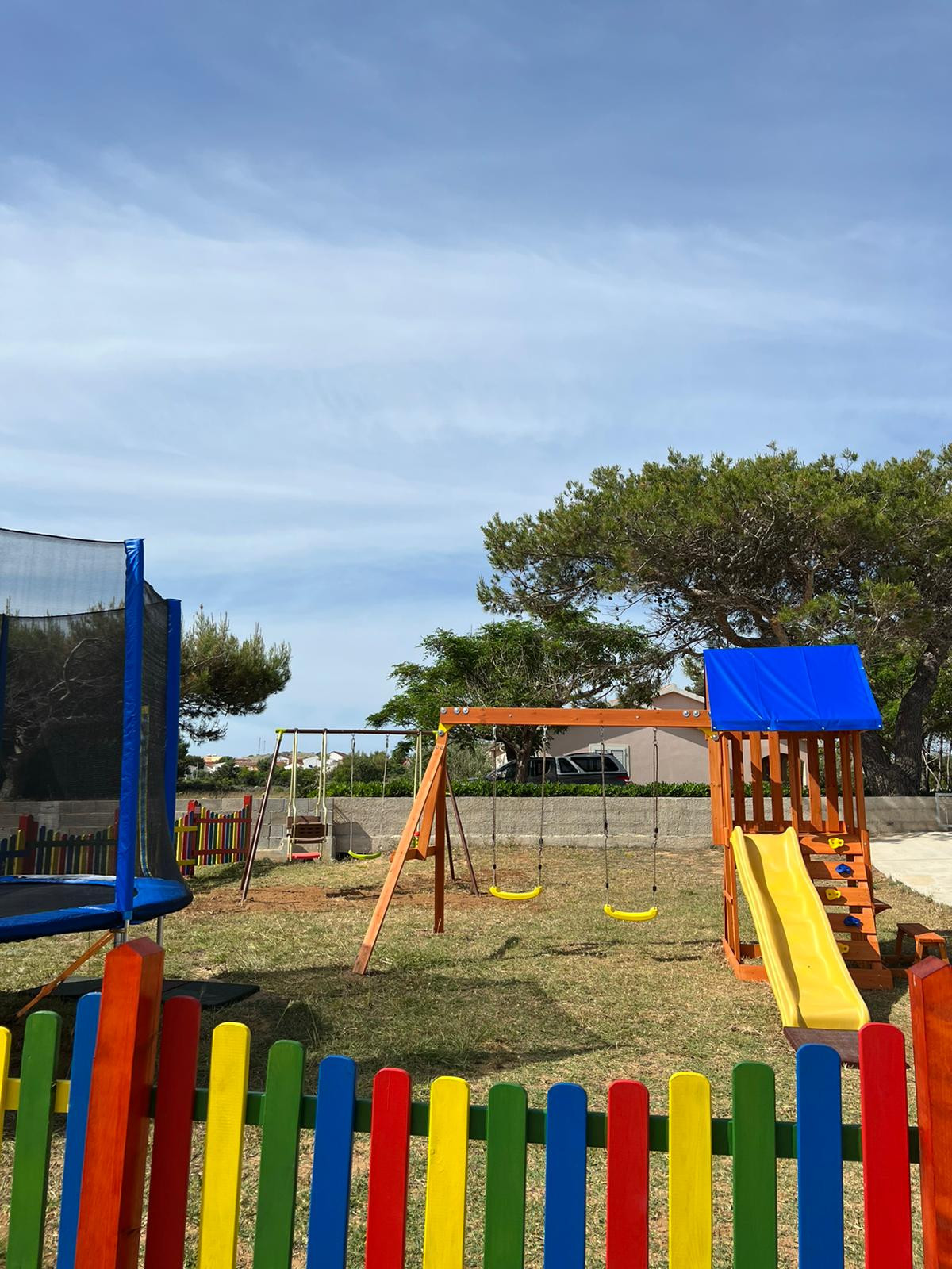 In front of the house there is a covered terrace with an outdoor table, ideal for relaxing and dining outdoors. In the large fenced yard, surrounded by greenery: lawns, Mediterranean plants and hedges, guests can use a concrete barbecue. Children will especially enjoy the shared children's playground on the property.